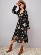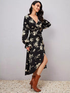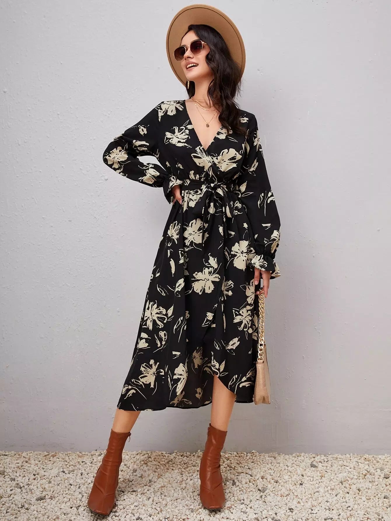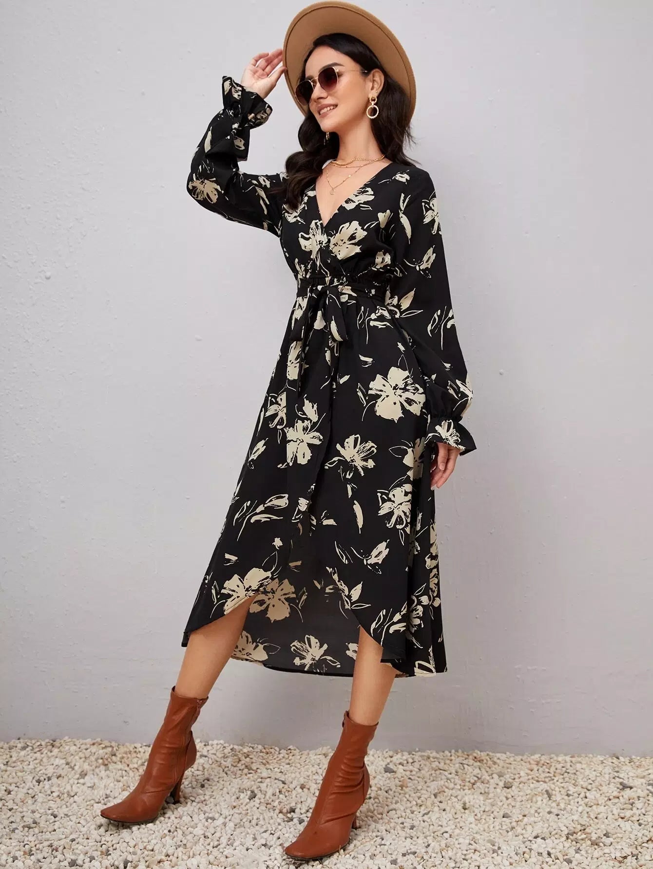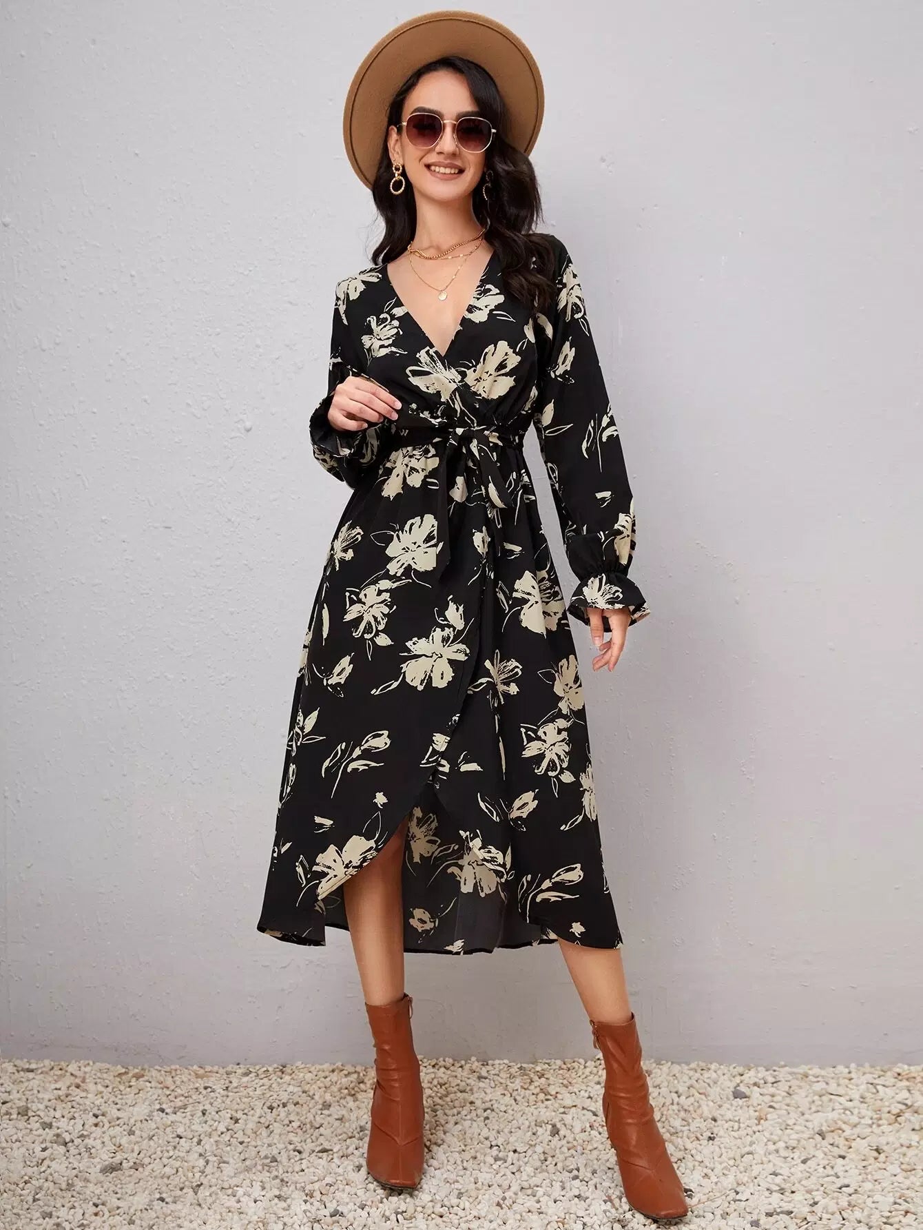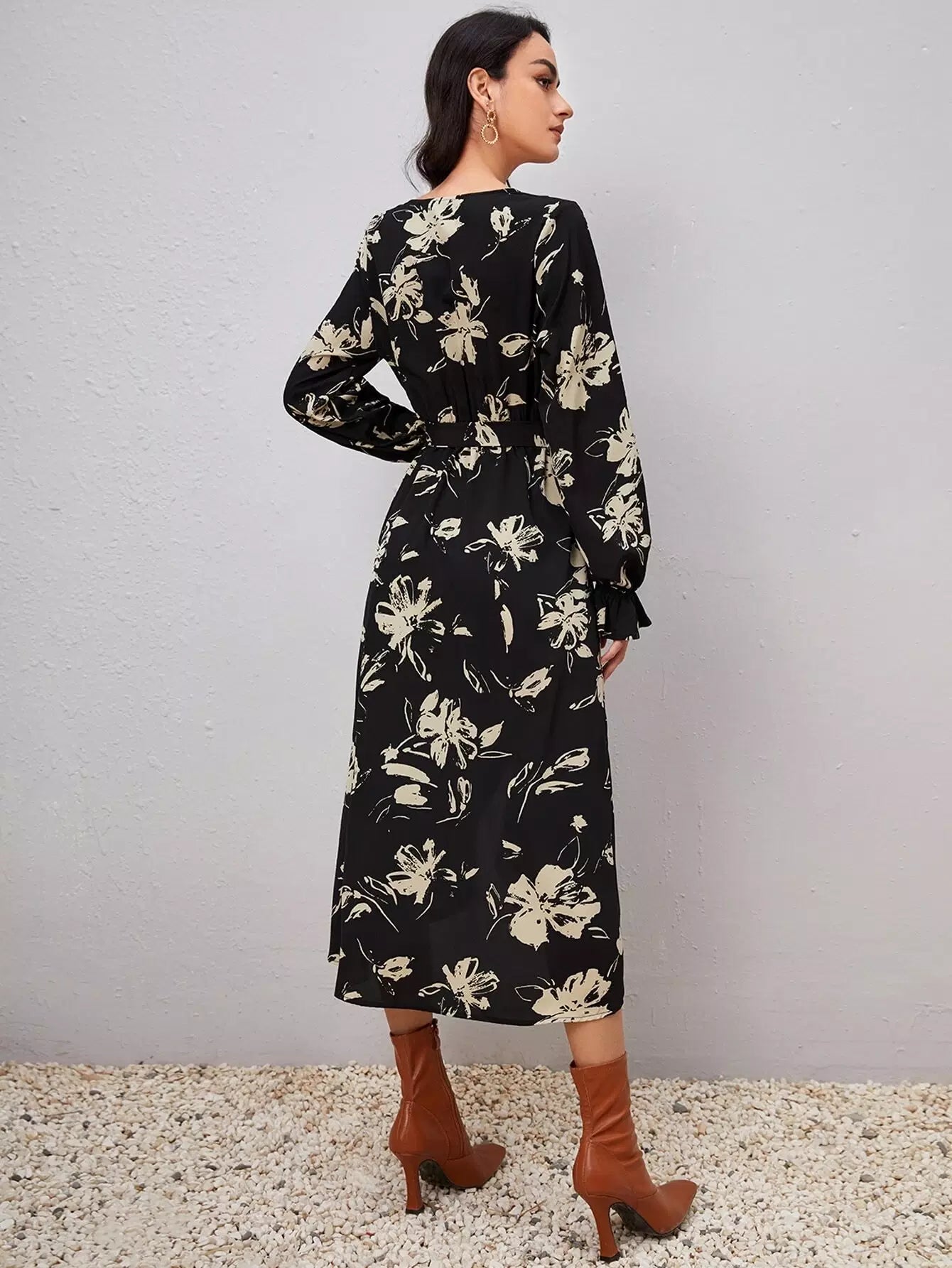 Floral Print Flounce Sleeve Wrap Dress Without Belt