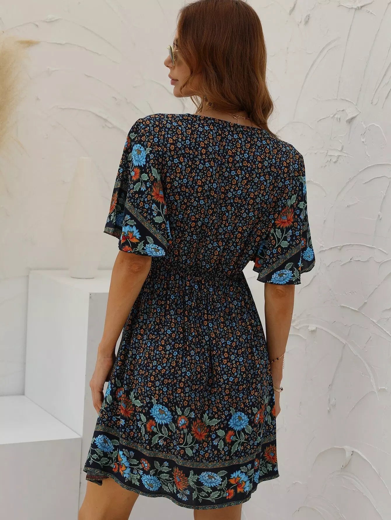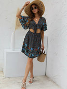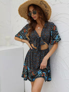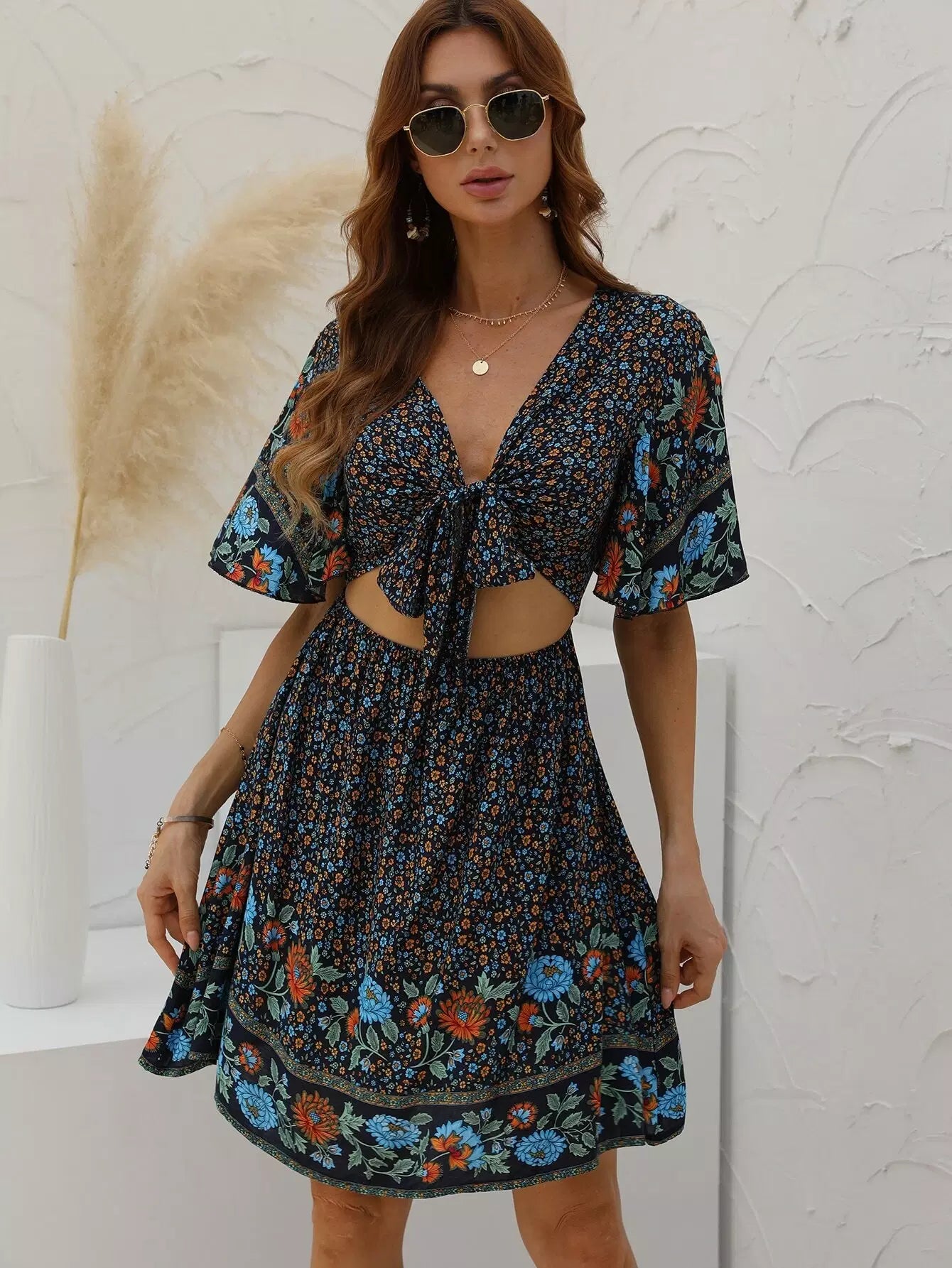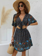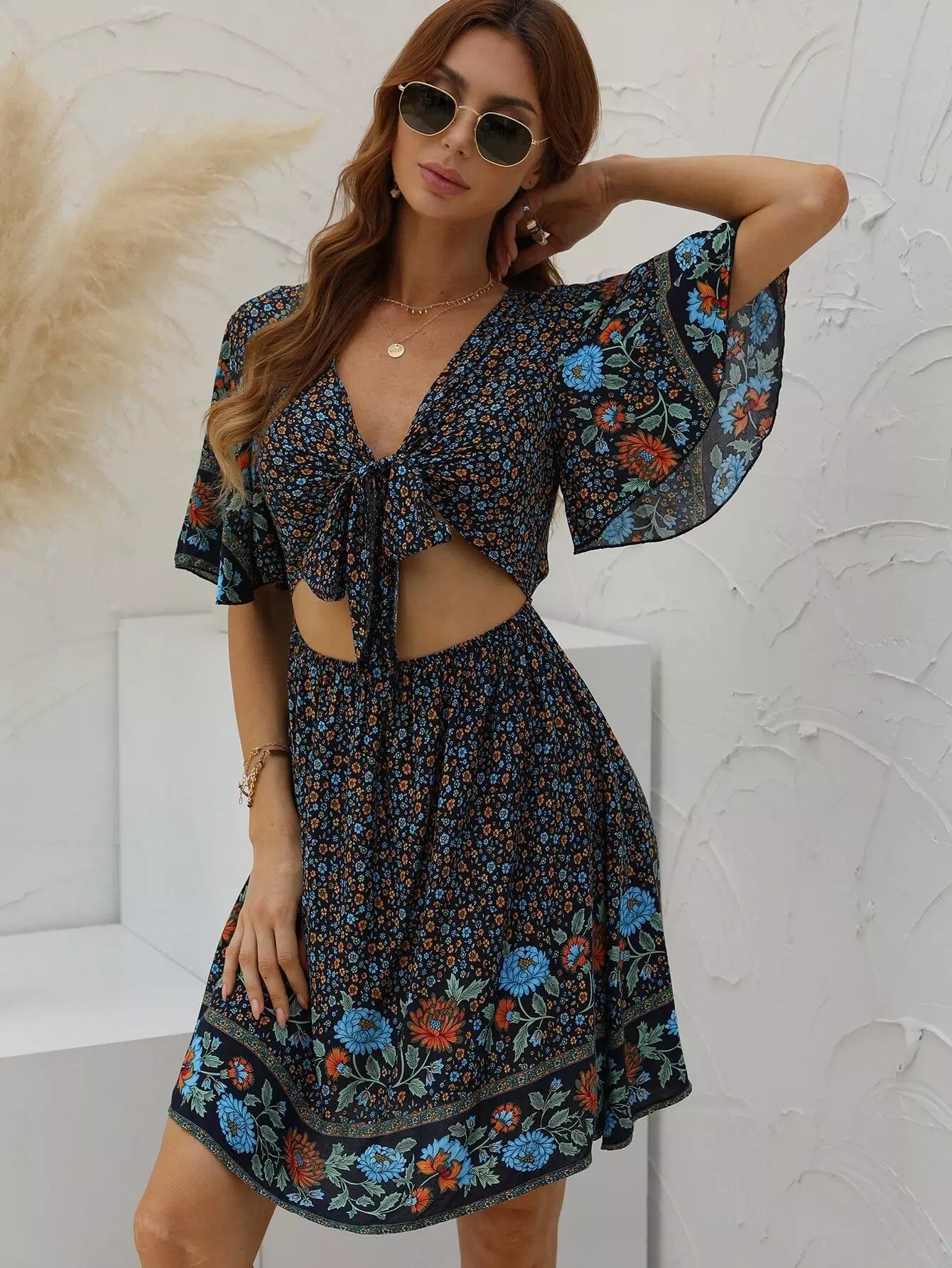 Floral Print Tie Front Peekaboo Butterfly Sleeve A-line Dress