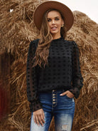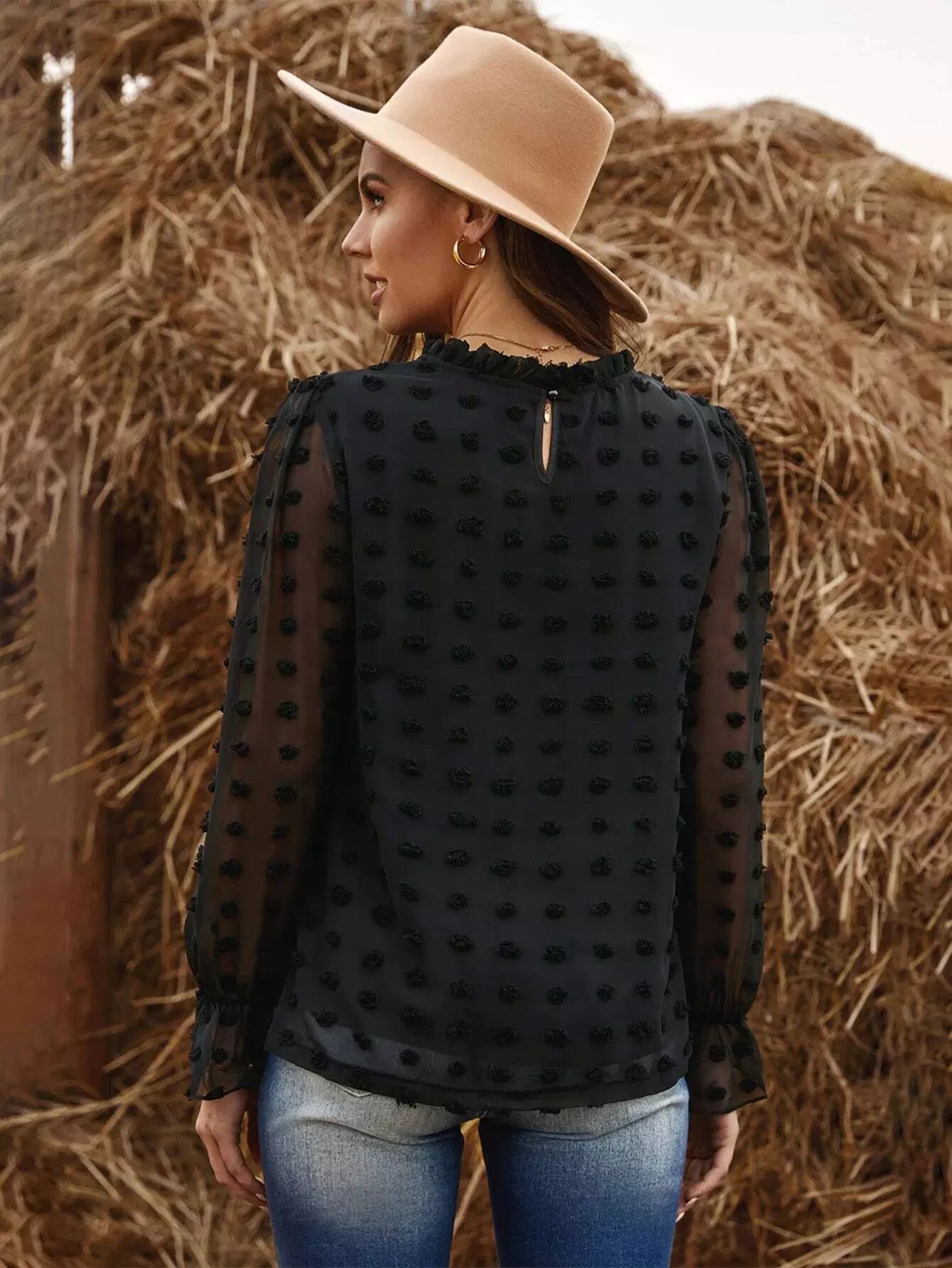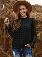 Frill Neck Flounce Sleeve Flocked Blouse