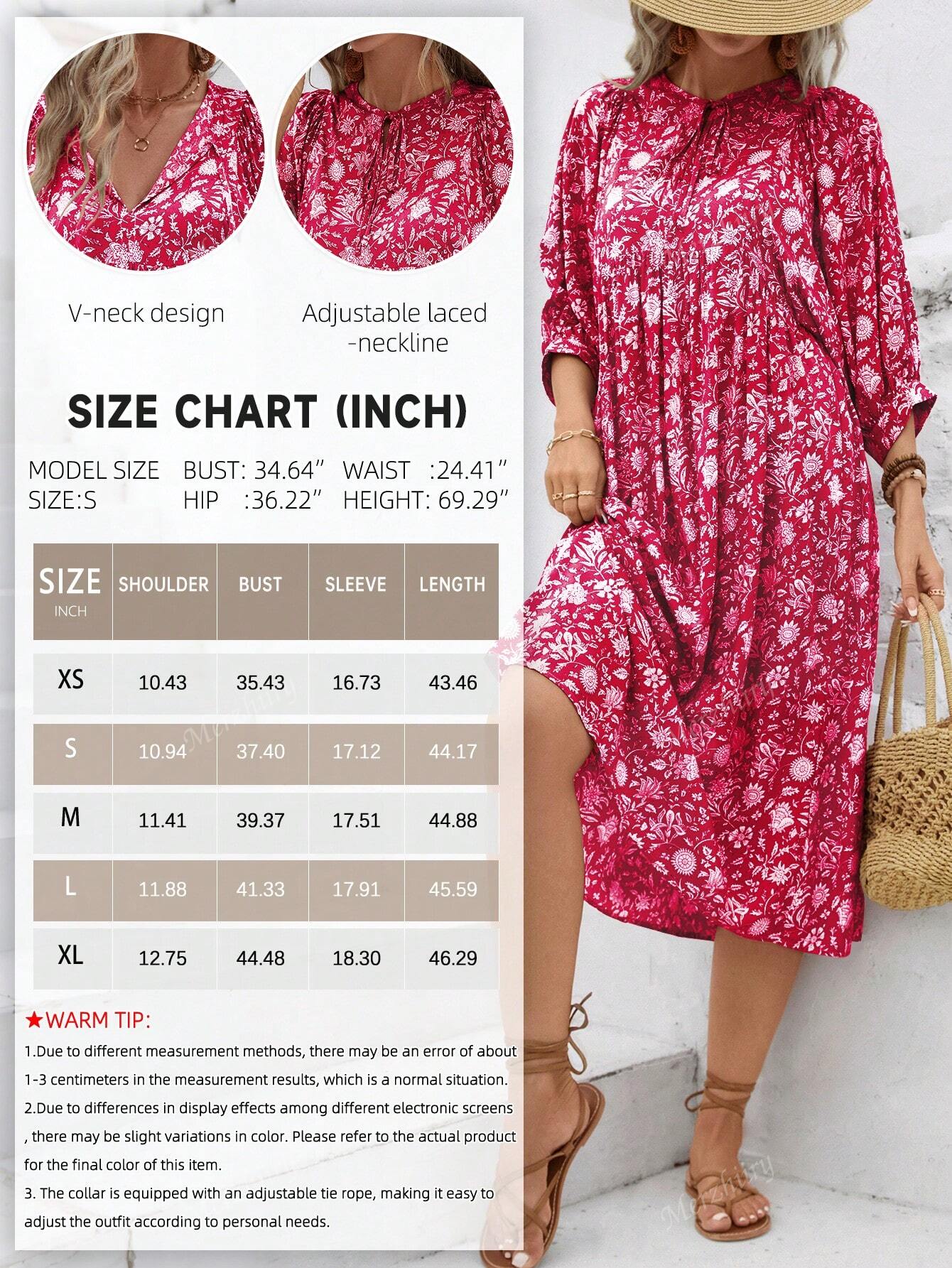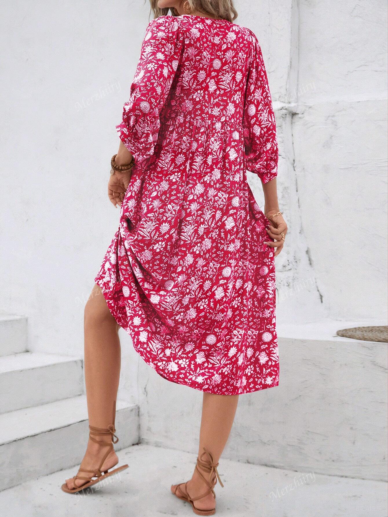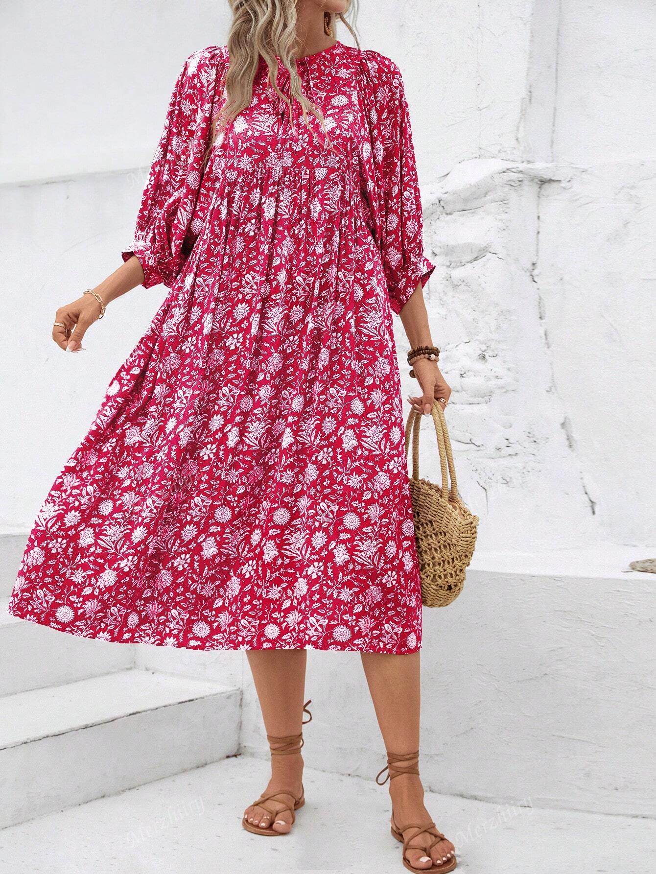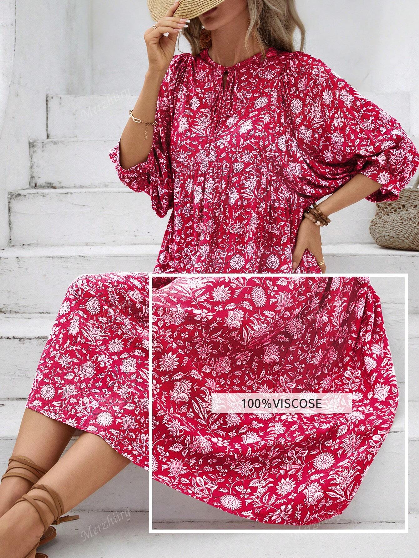 Full Printed Tie-Up Neckline Lantern Sleeve Dress, Stylish Casual Daily Wear