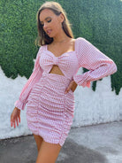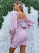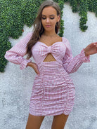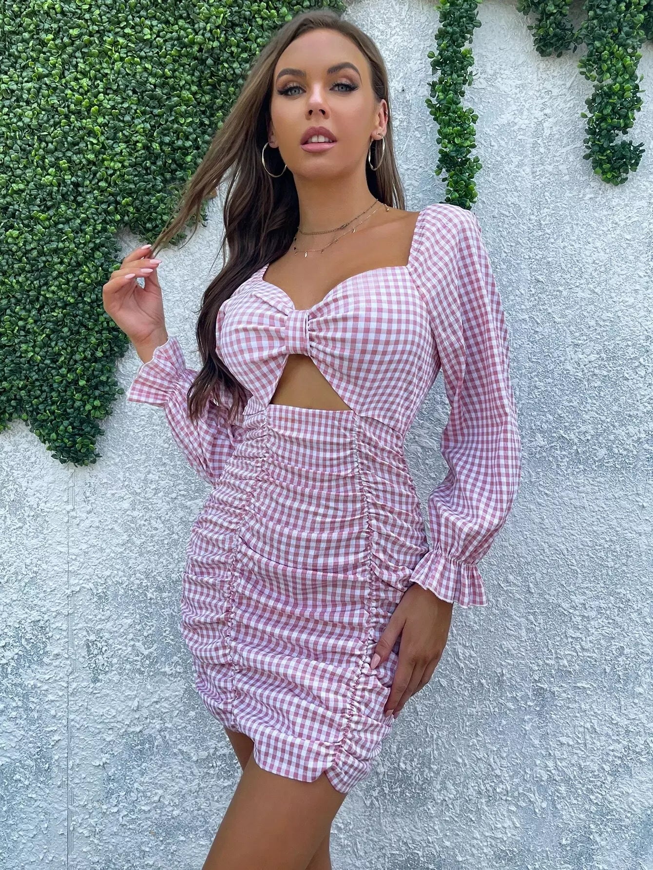 Gingham Print Cut Out Ruched Front Flounce Sleeve Bodycon Dress