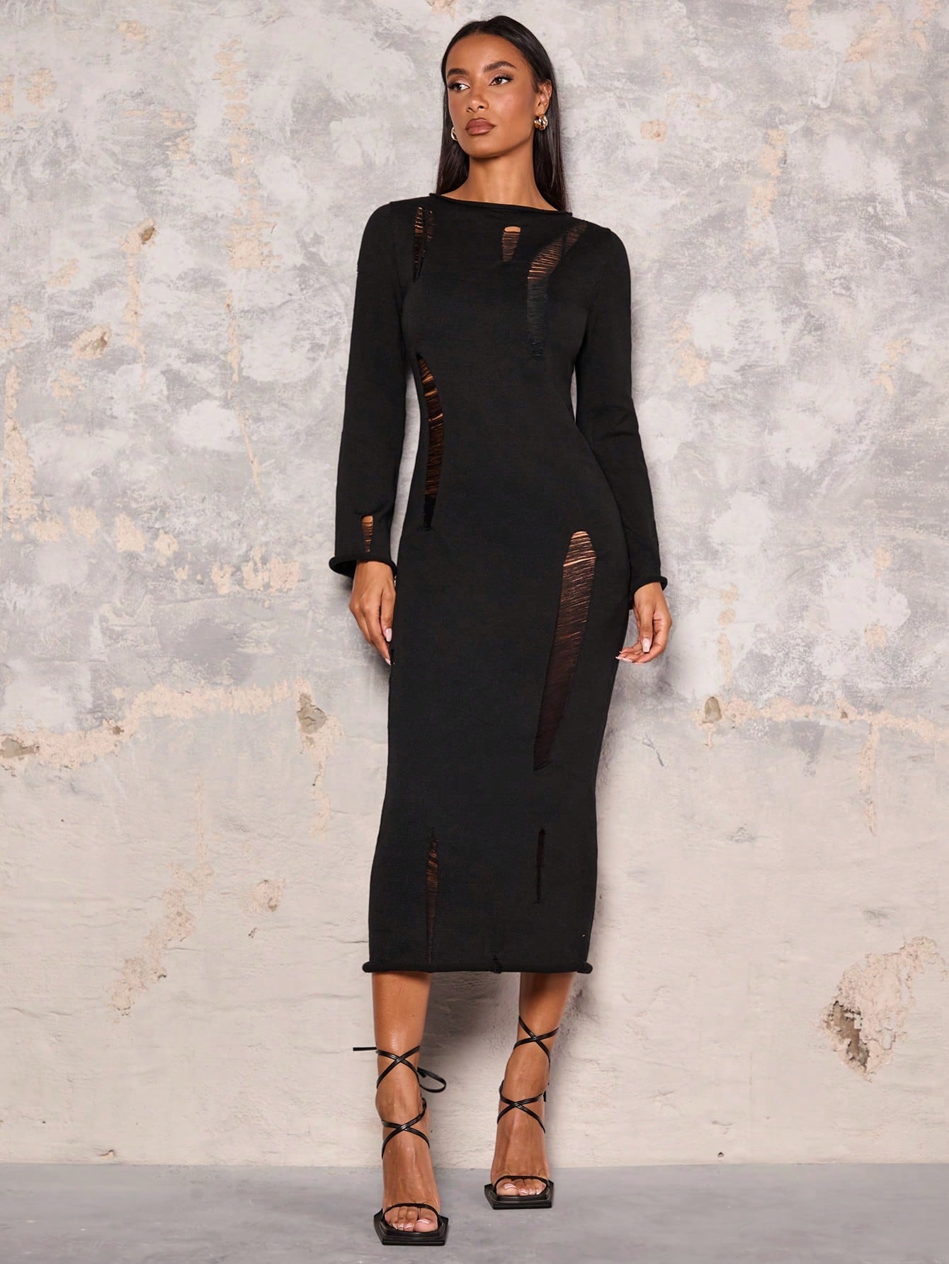 Glamine Mid-Length Solid Color Hollow Long Sleeve Sweater Dress For Women