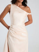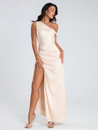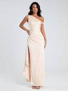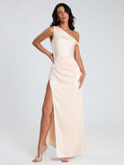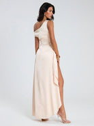 Glamine New Women's Champagne Satin Asymmetrical Neck Back Zip Up Split Thigh Sexy Maxi Dress, Summer