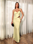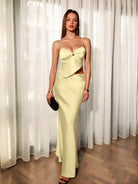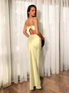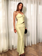 Glamine Women Satin Light Yellow Spaghetti Strap 2 Pieces Set, Spring/Summer Outfit, 2 Pieces Dress Set