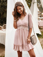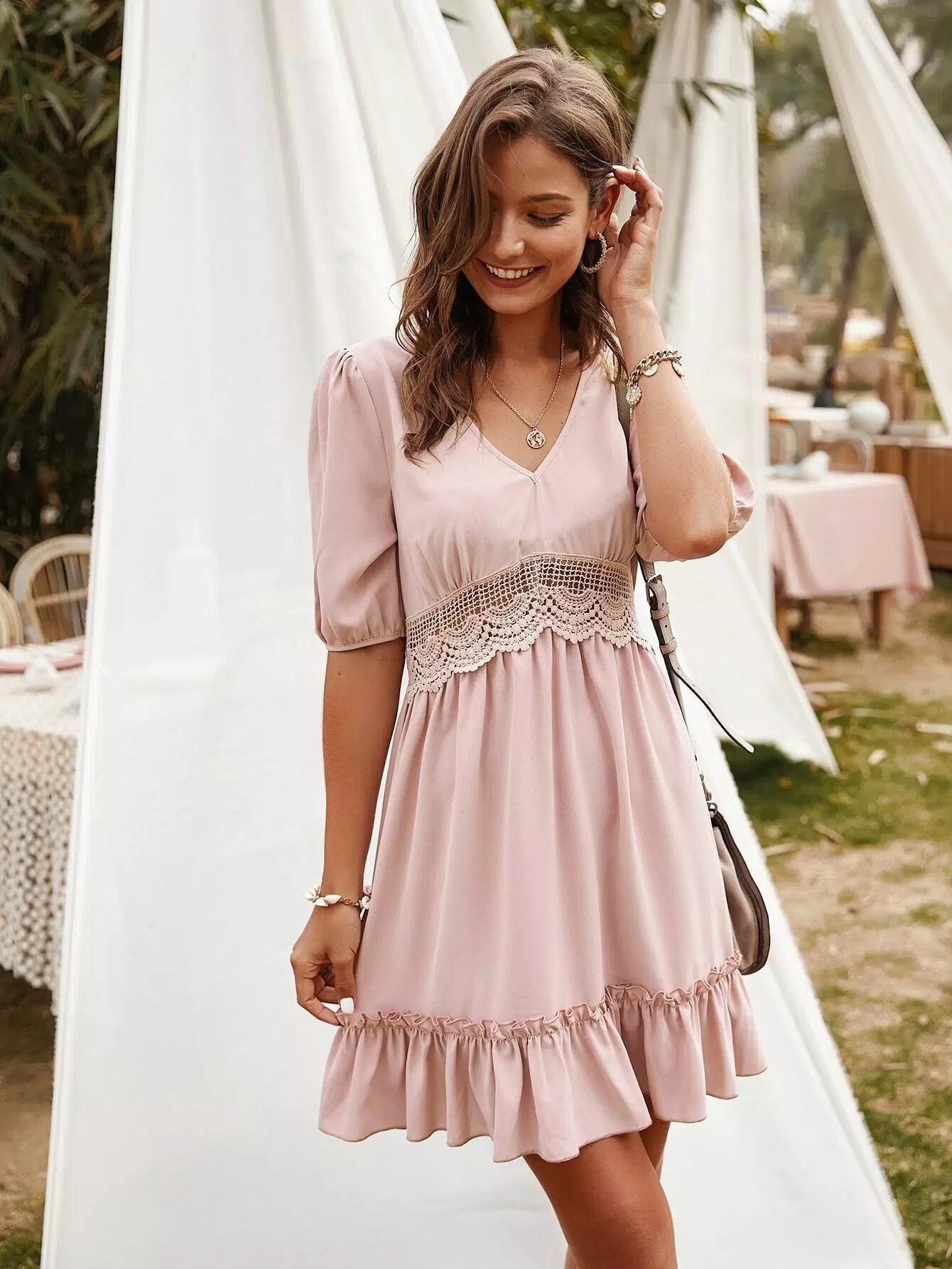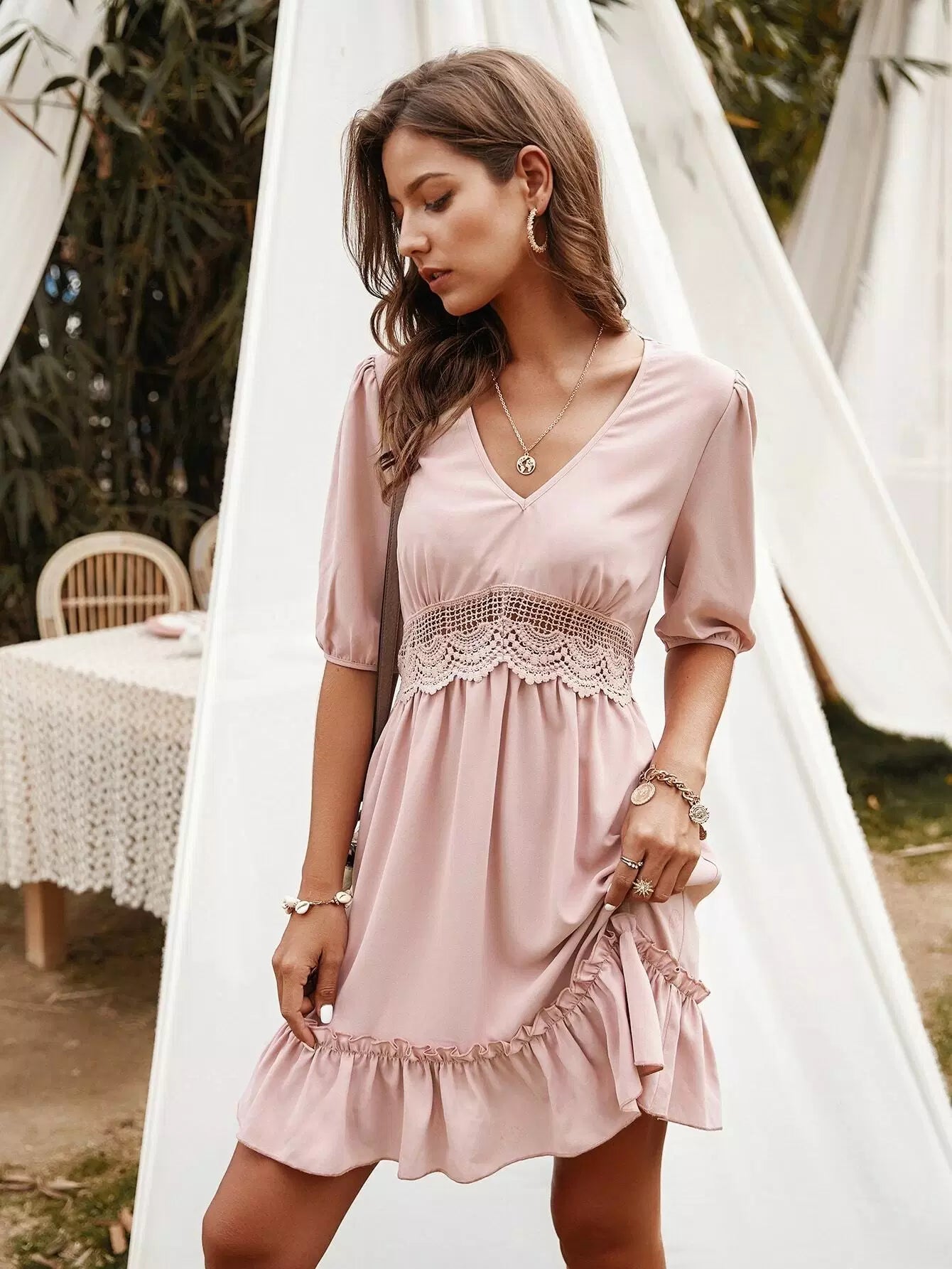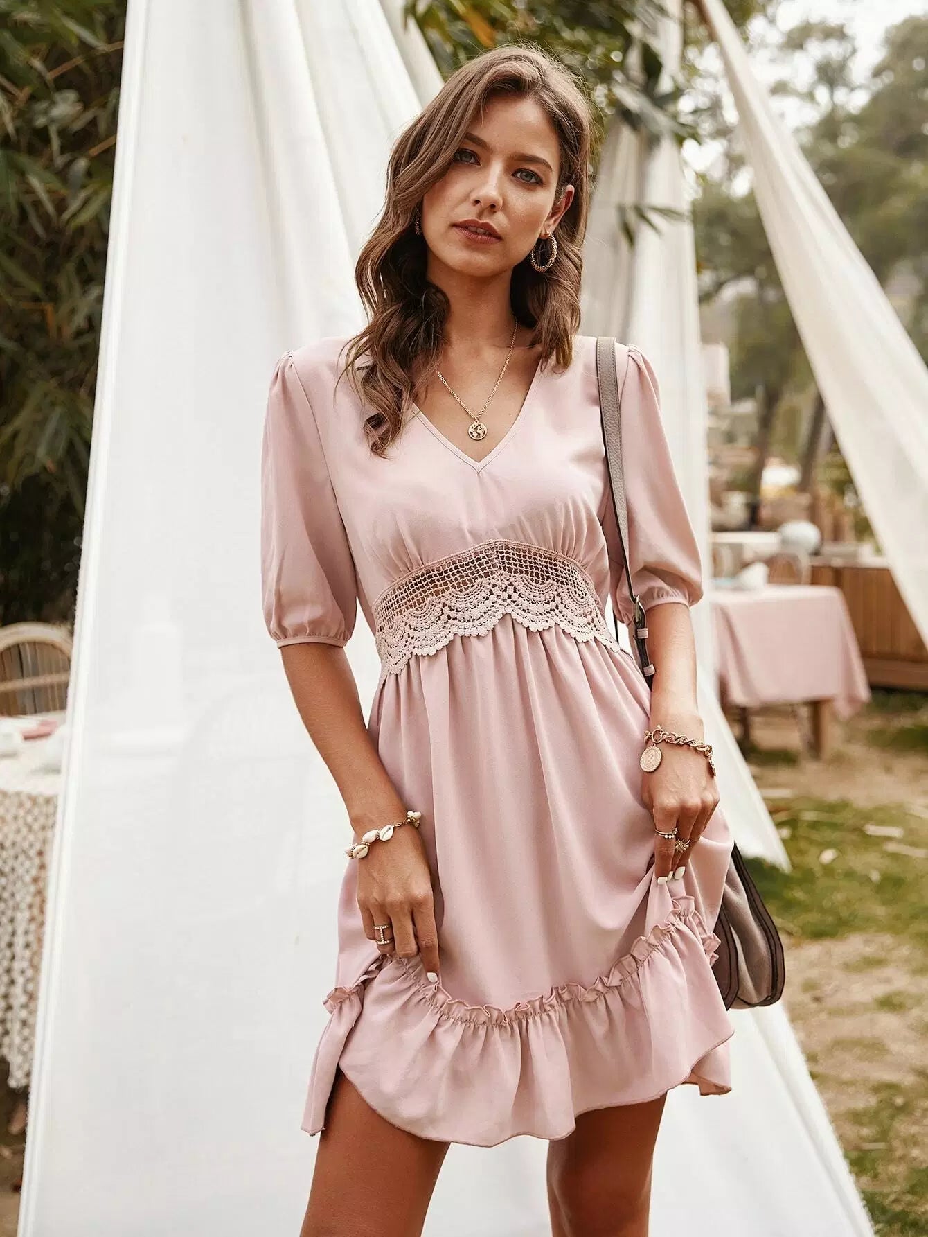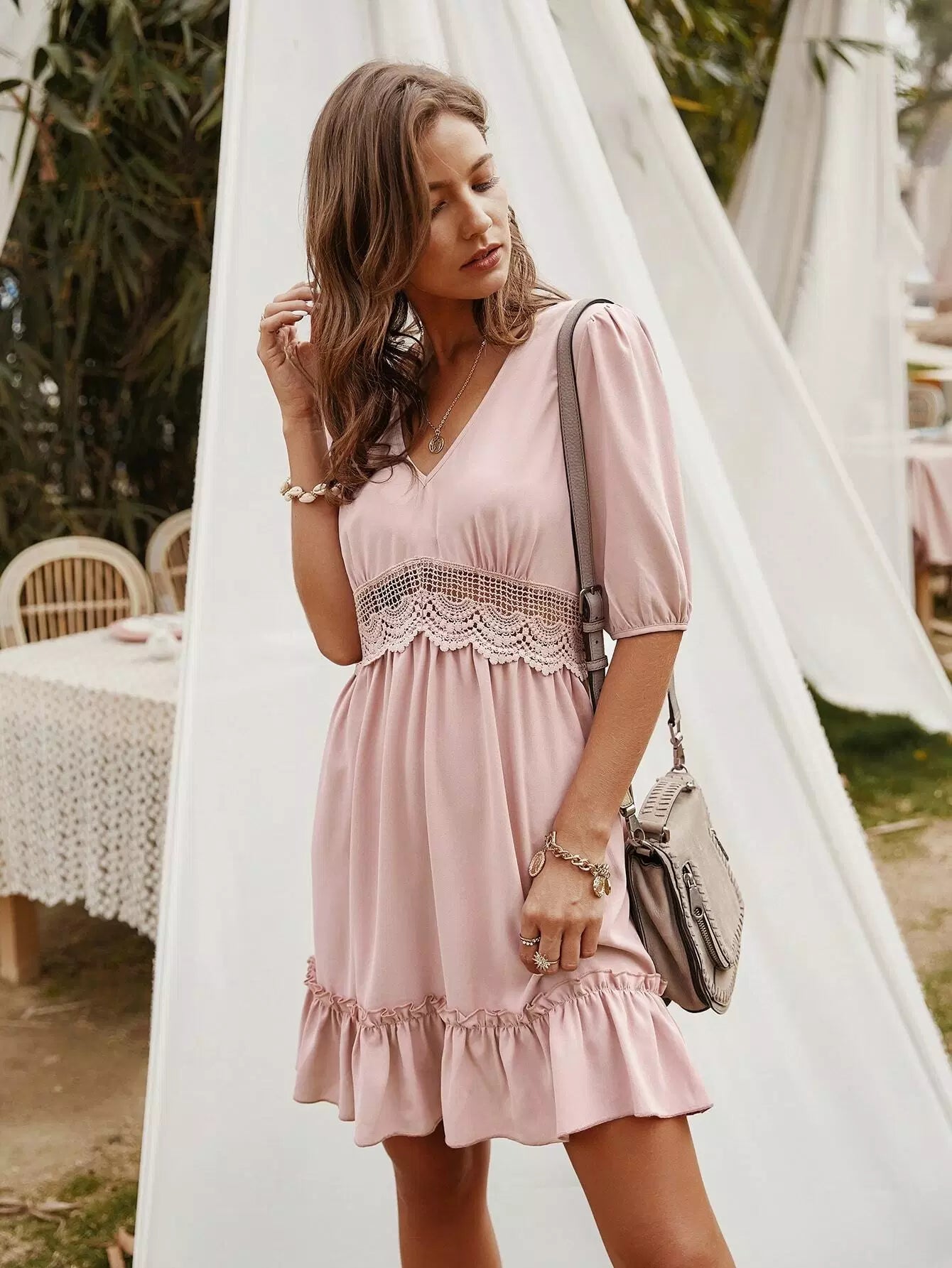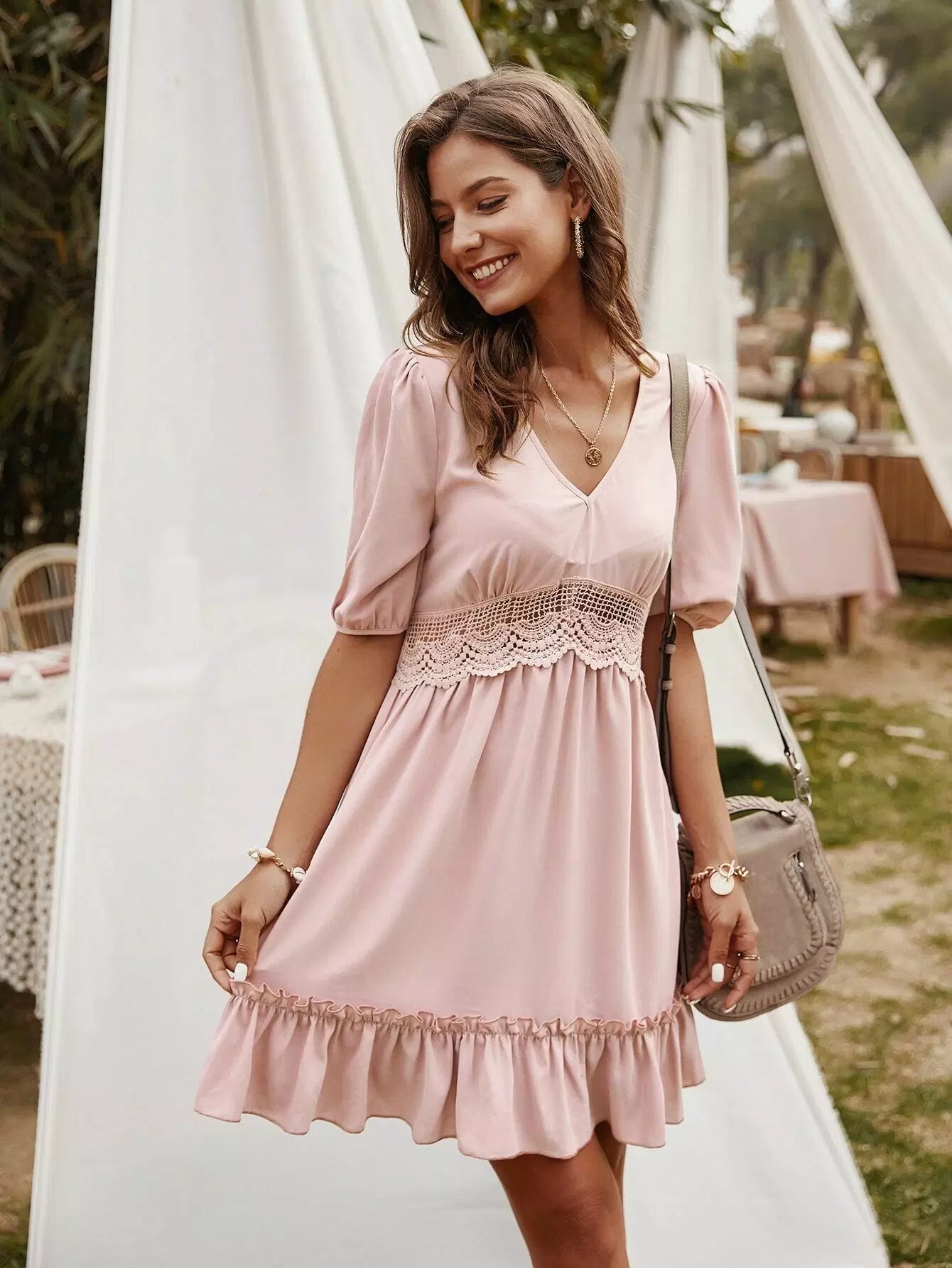 Guipure Lace Panel Ruffle Hem A-line Dress