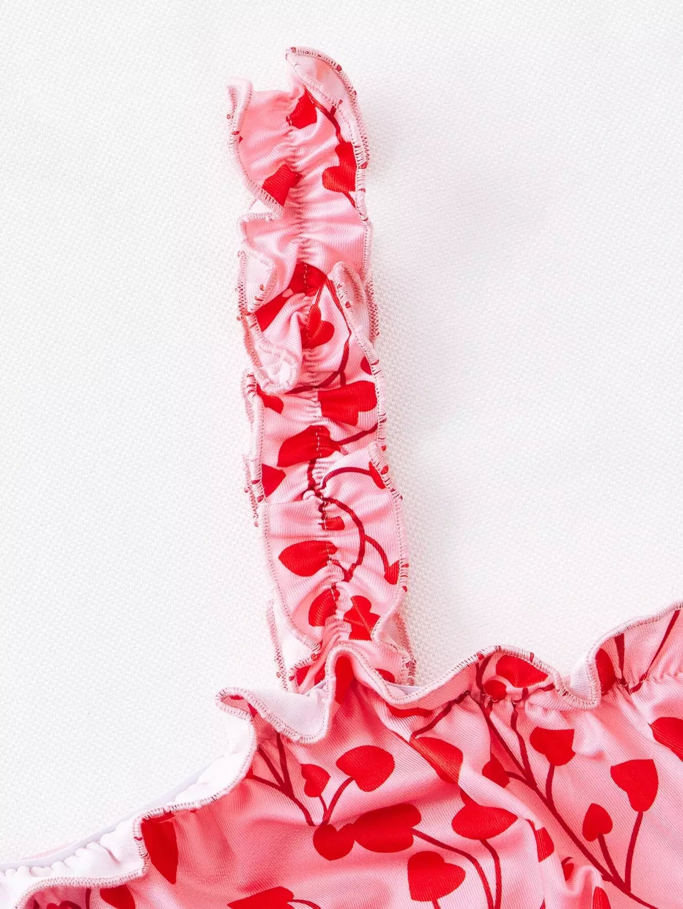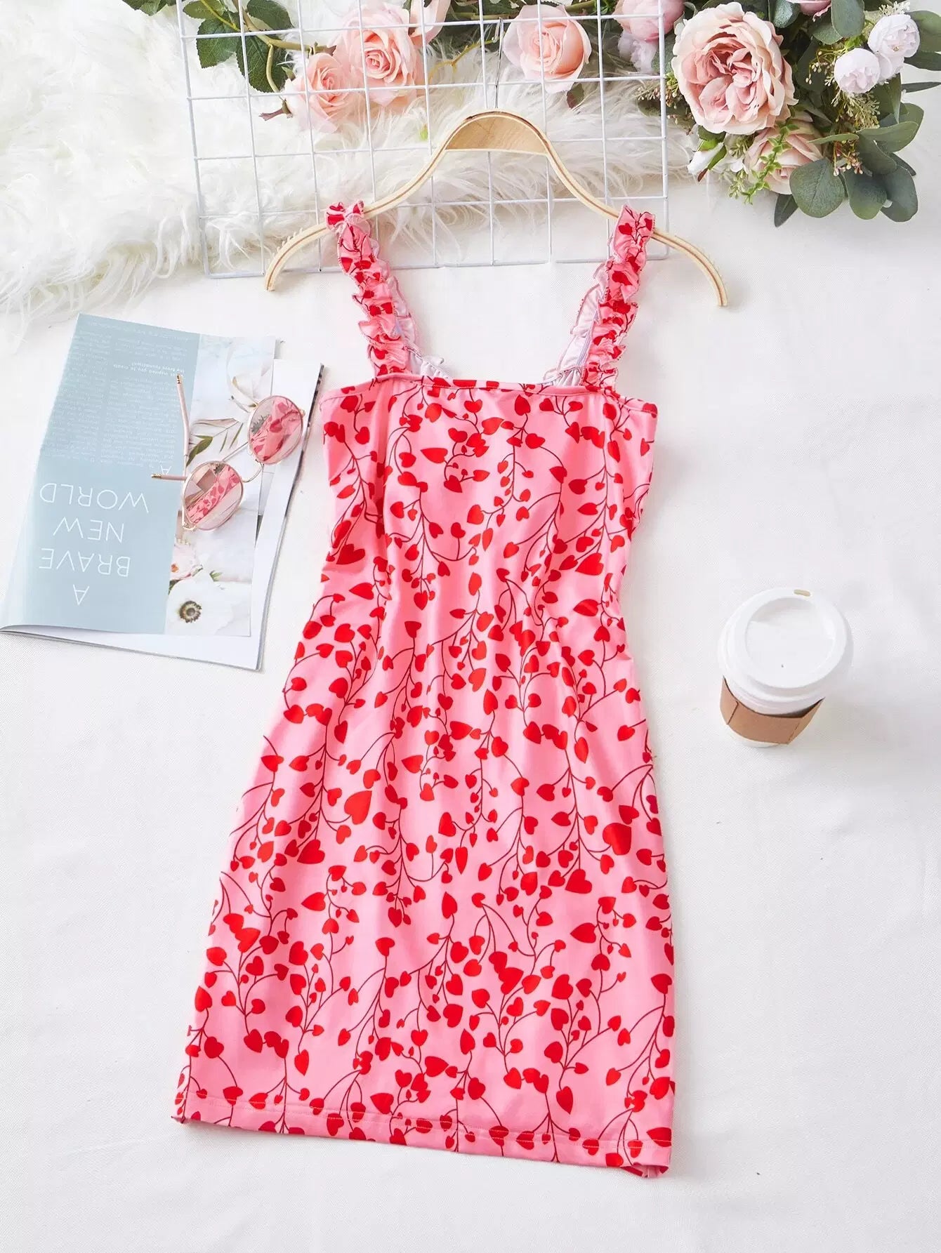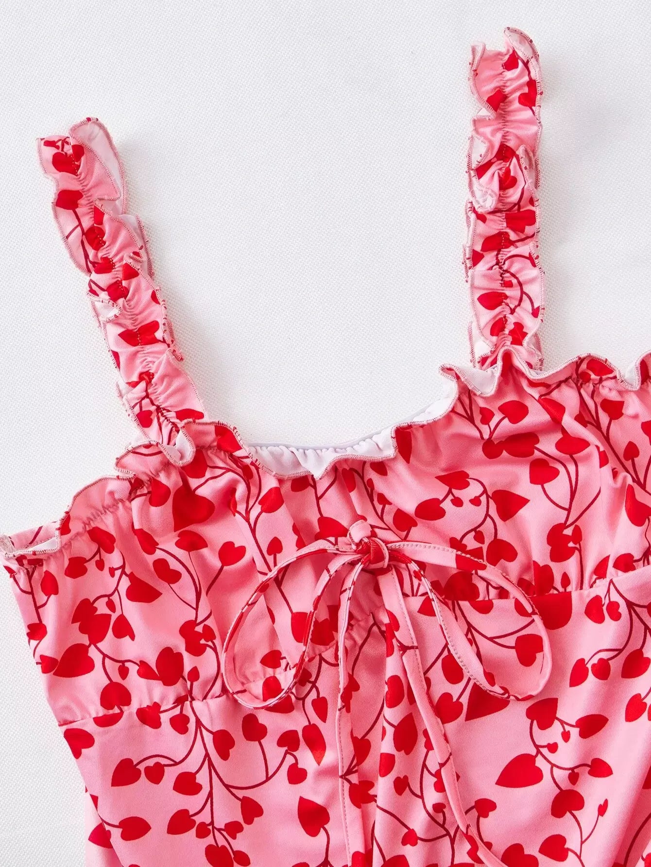 Heart Print Tie Front Frill Cami Bodycon Dress