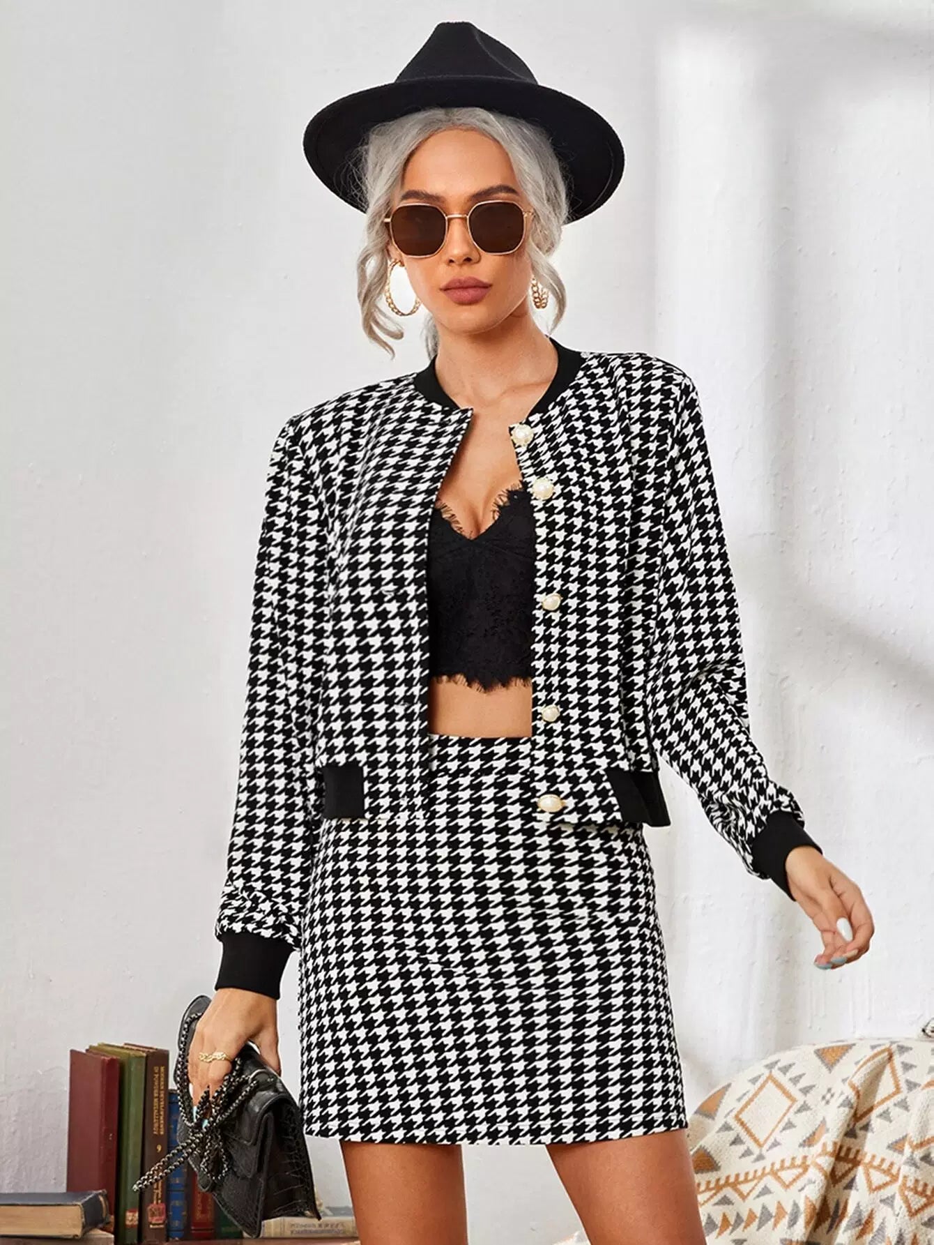 Houndstooth Print Bomber Jacket & Skirt