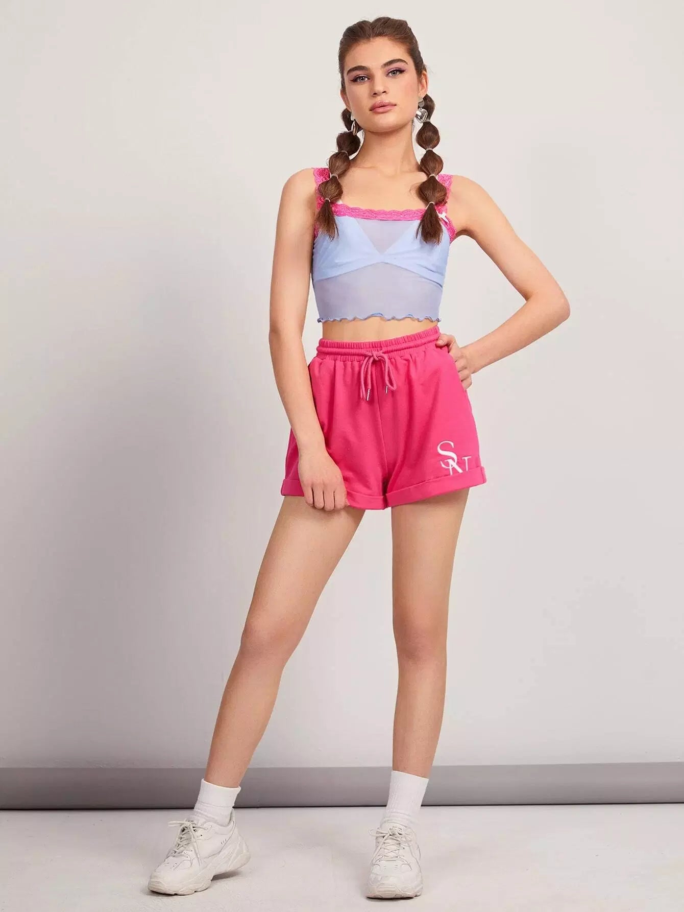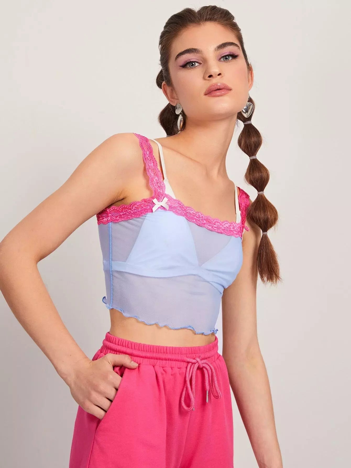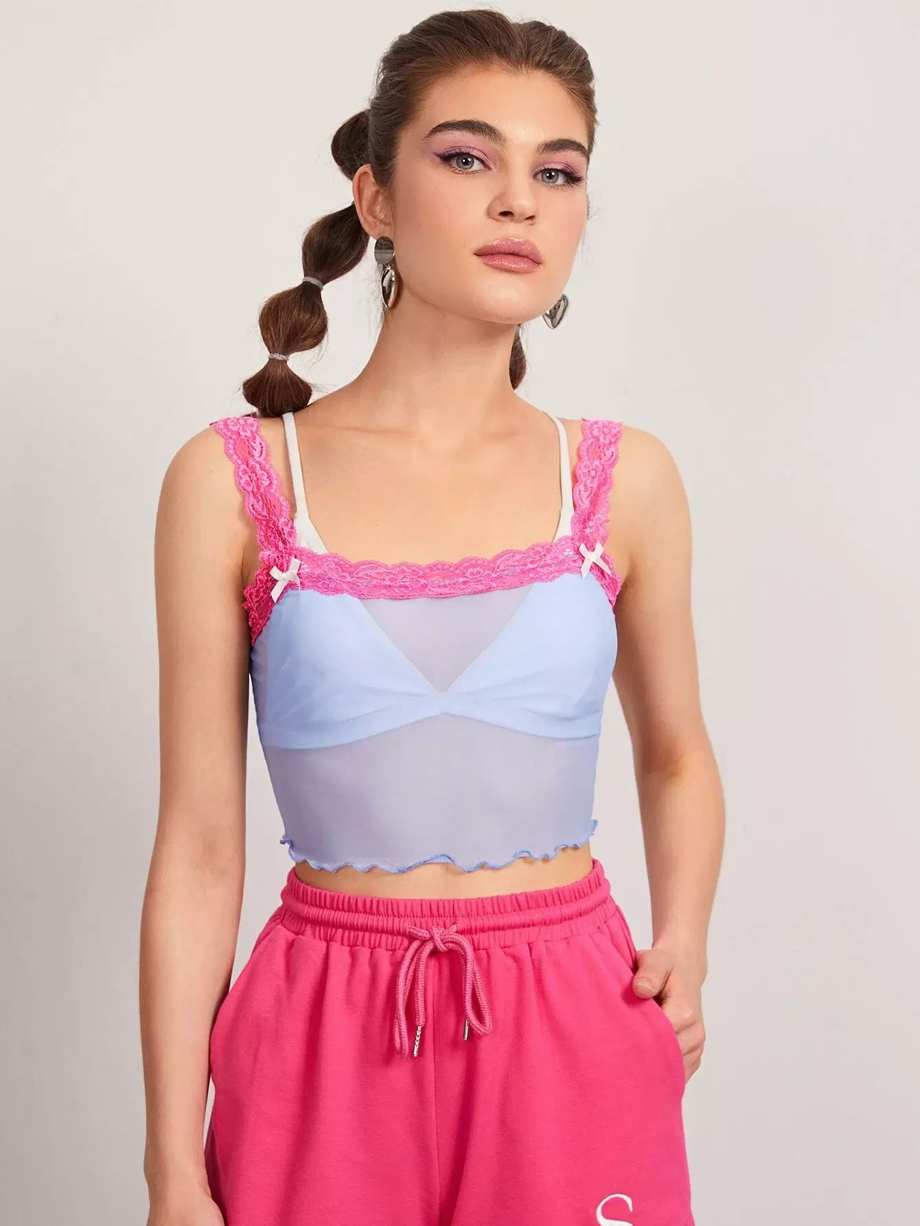 Lace Trim Sheer Mesh Cami Top Without Bra