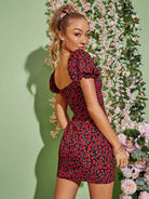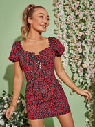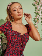 Lace Up Front Frill Trim Puff Sleeve Allover Floral Print Dress