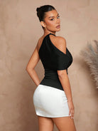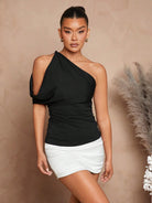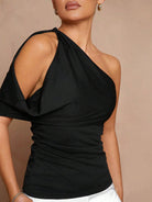 L'Amorae Summer Women Clothes, Elegant Sexy Black Solid Color One Shoulder Hollow Cut-Out Sleeve Ruched