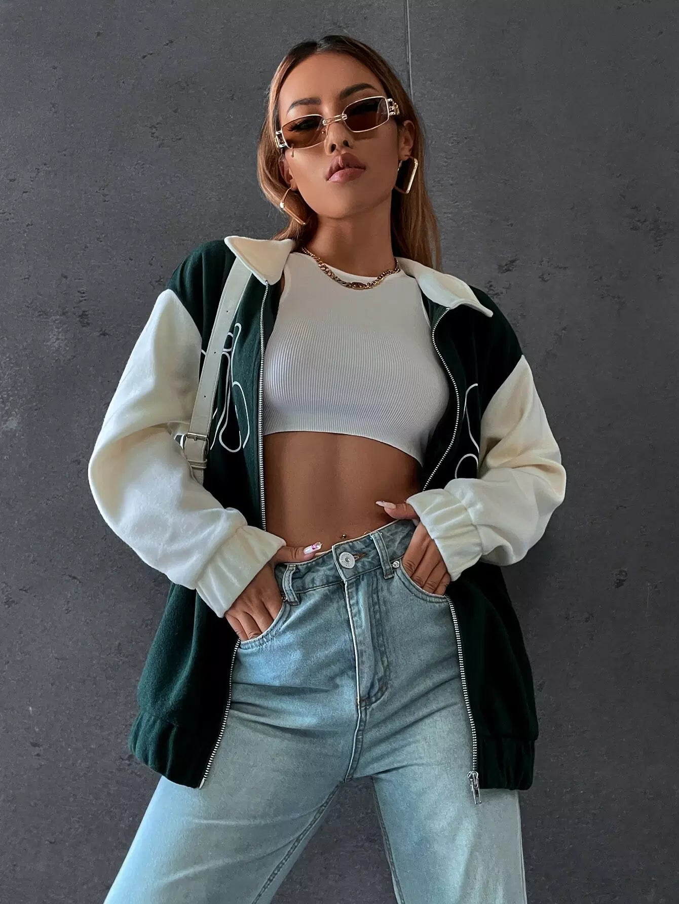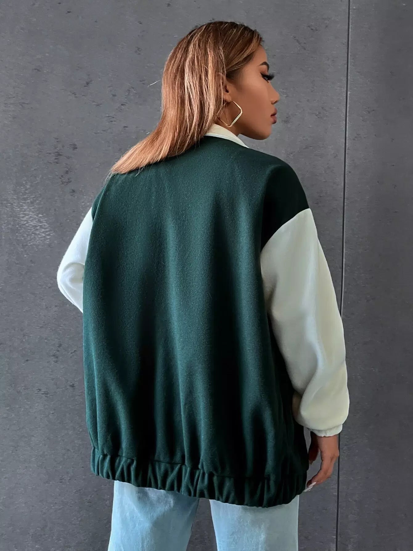 Letter Graphic Color Block Drop Shoulder Zipper Jacket