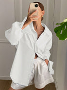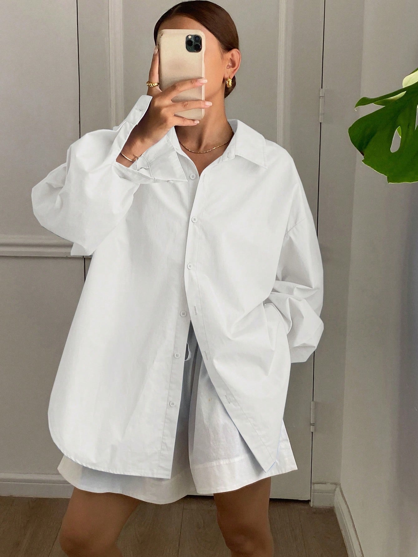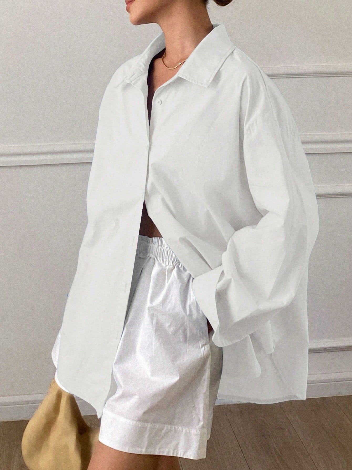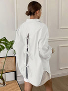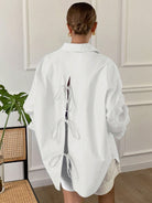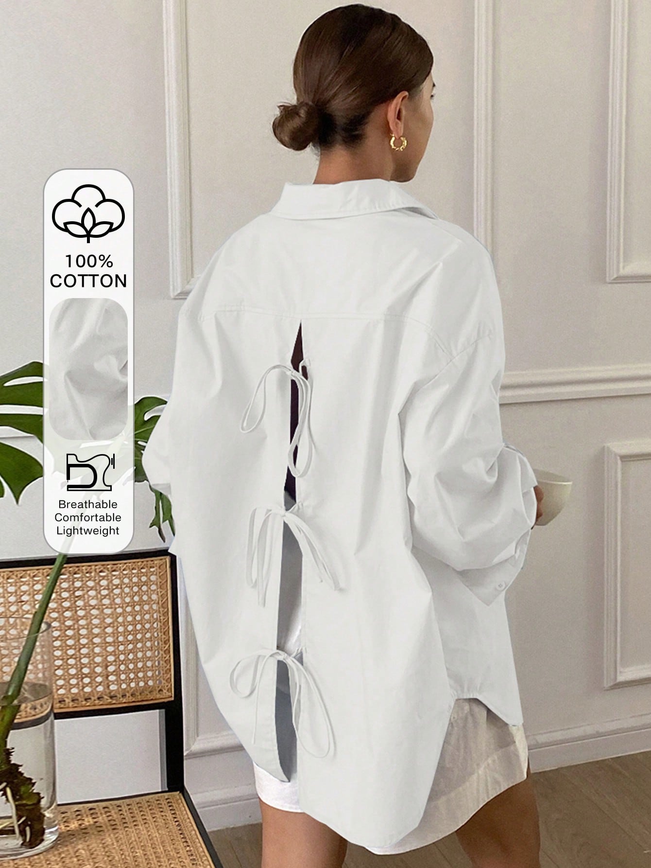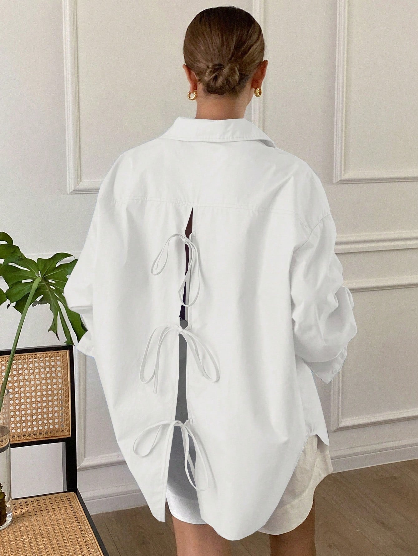 Livesso Solid Color Loose Long Sleeve Shirt With Collar, Back Slit, Self-Tie Bow For Women,Fall Clothes