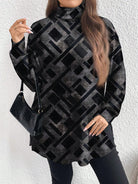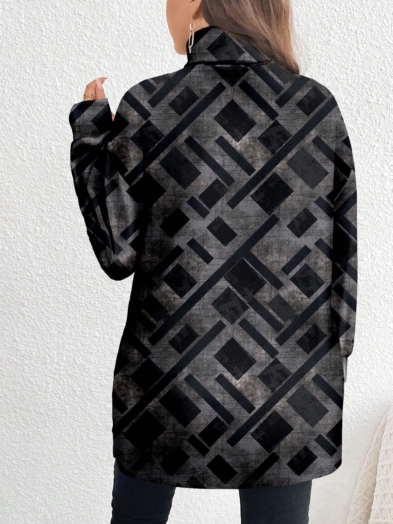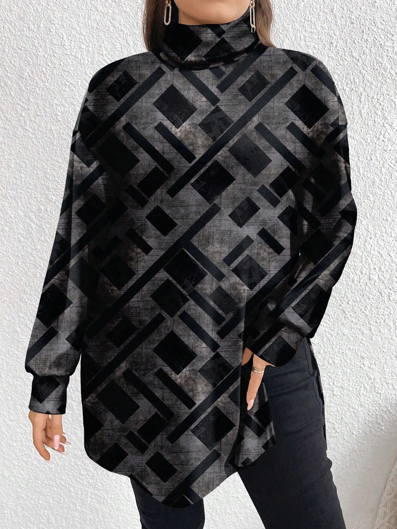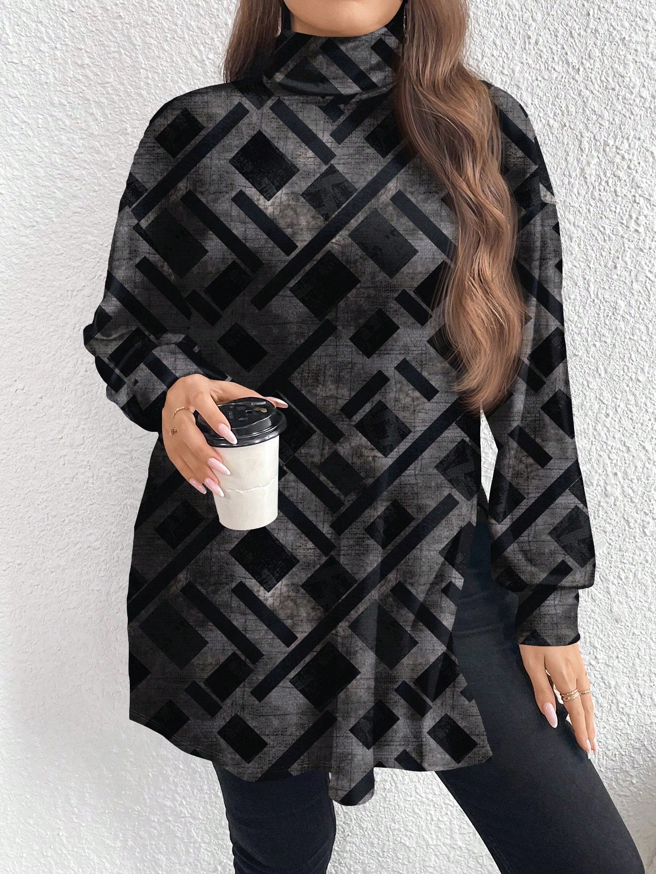 LUNE Plus Size Minimalist All-Over Print Mock Neck Long Tunic T-Shirt, Casual For Autumn/Winter