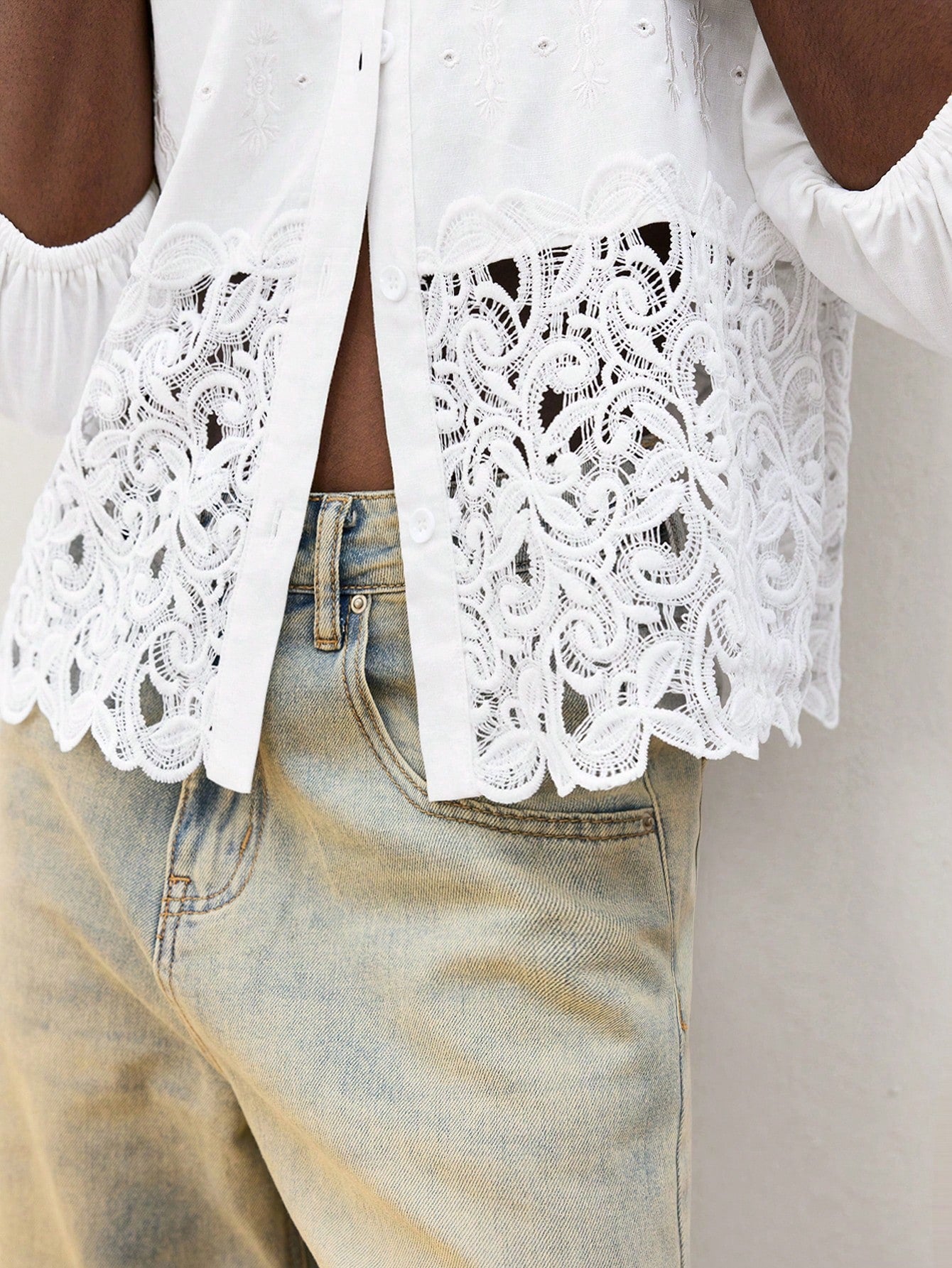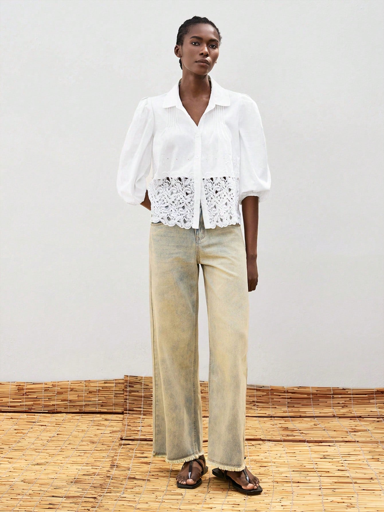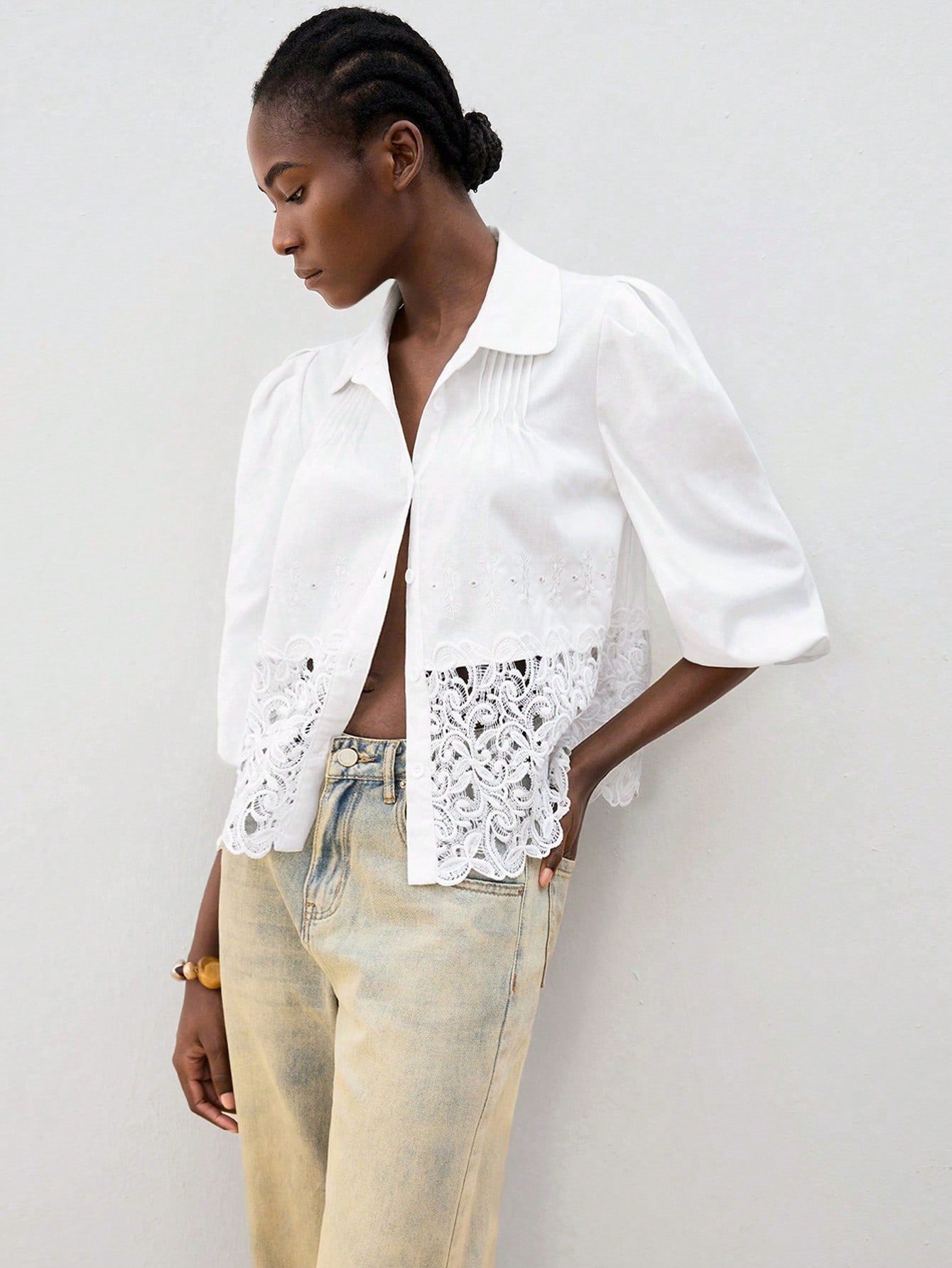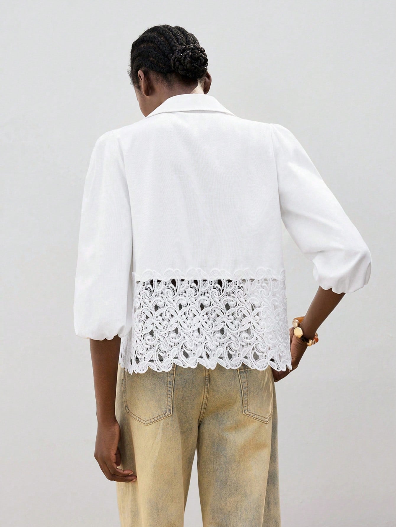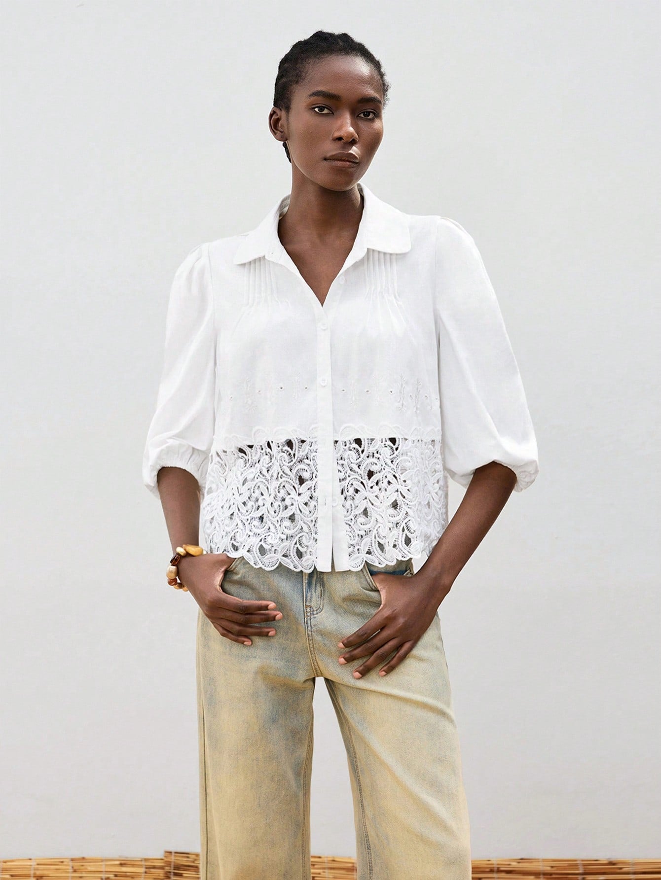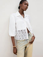 Maija Women Solid Color Lantern Sleeve Contrast Lace Single-Breasted Blouse