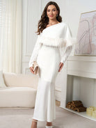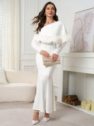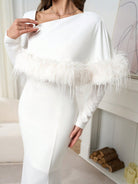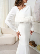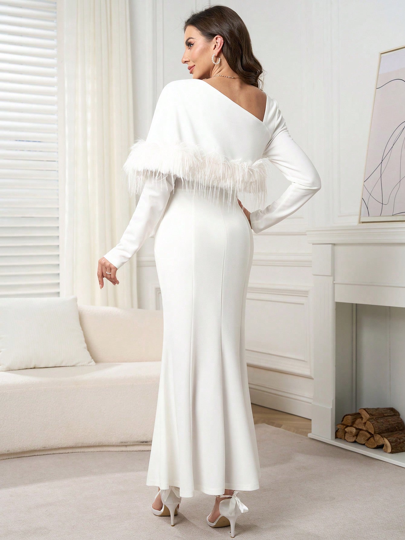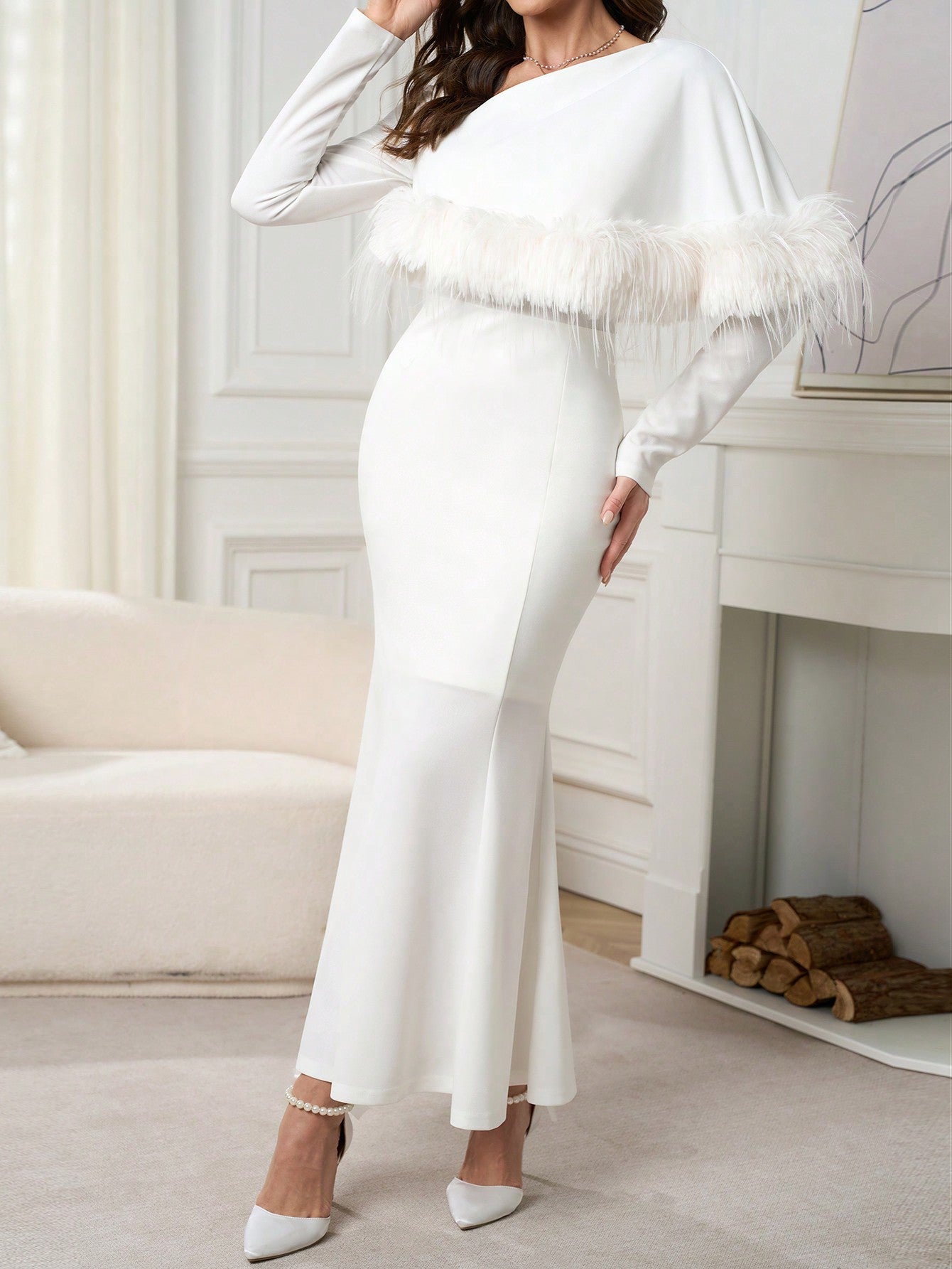 Modelyn Women's Elegant Solid Color Asymmetric Collar Fur Trim Fishtail Dress, Autumn Long Evening Dresses