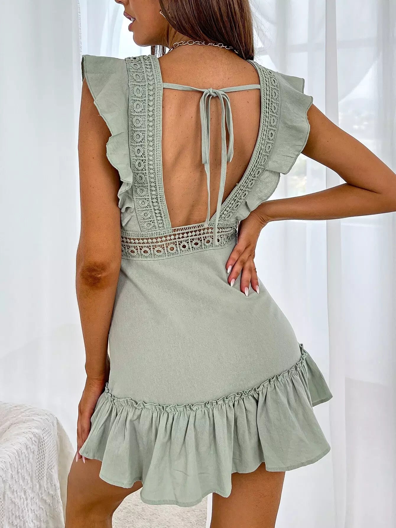 Plunging Neck Tie Back Lace Trim Ruffle Hem Dress