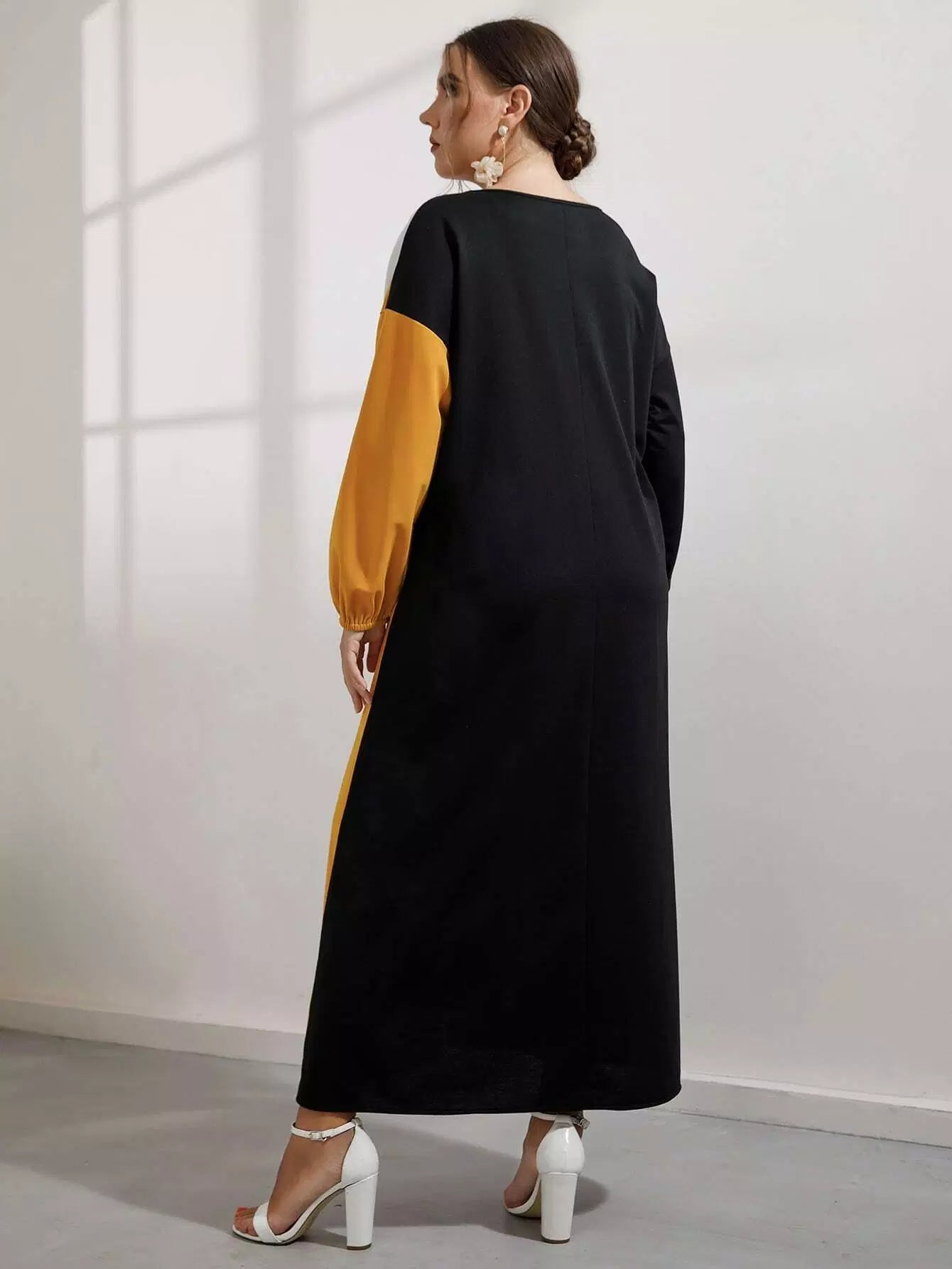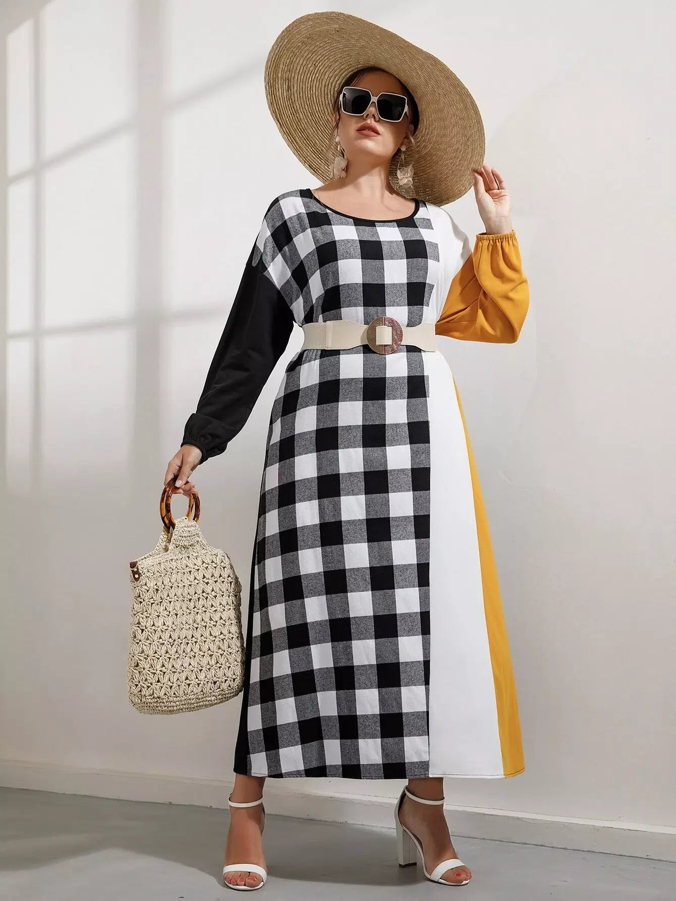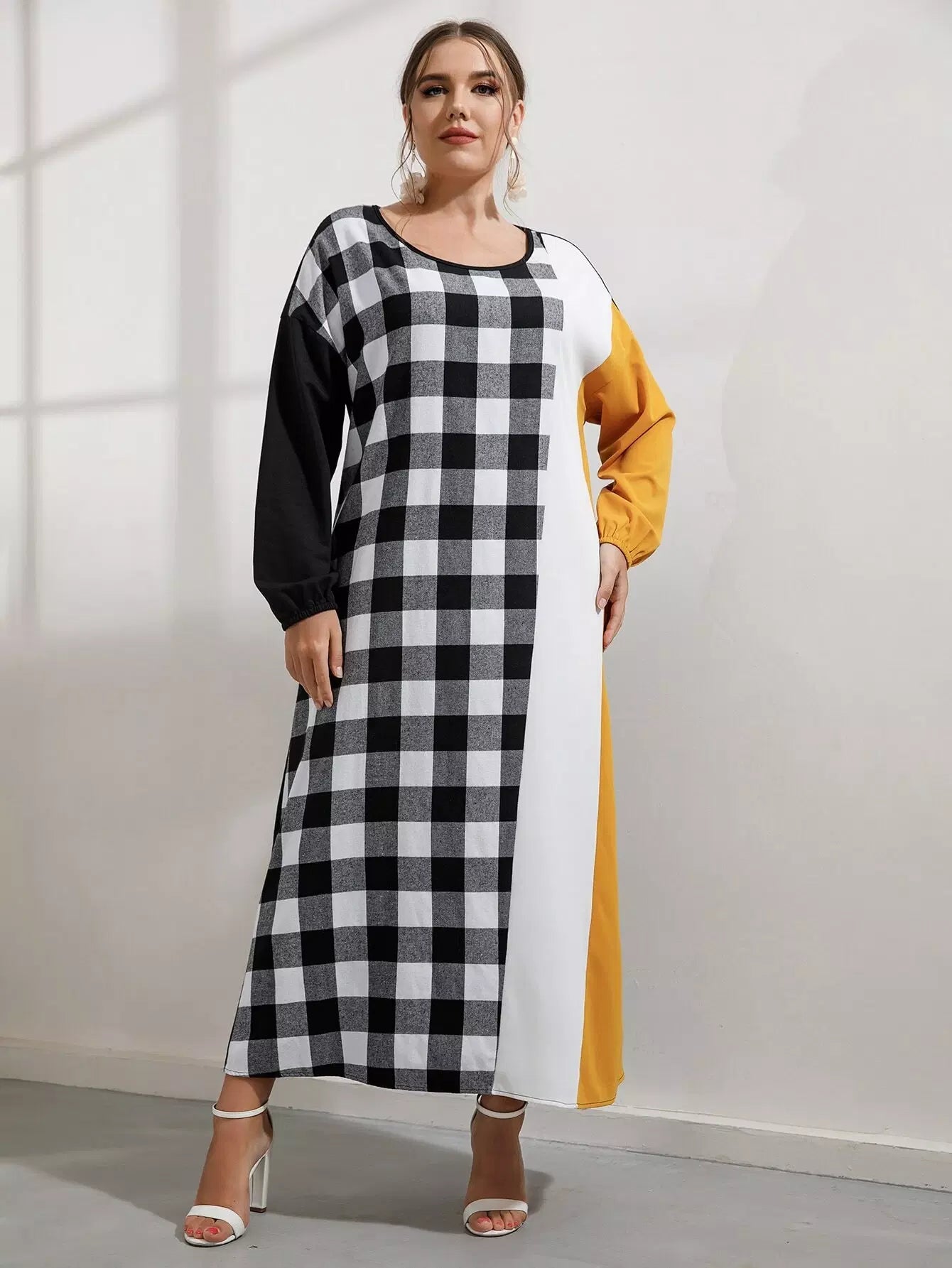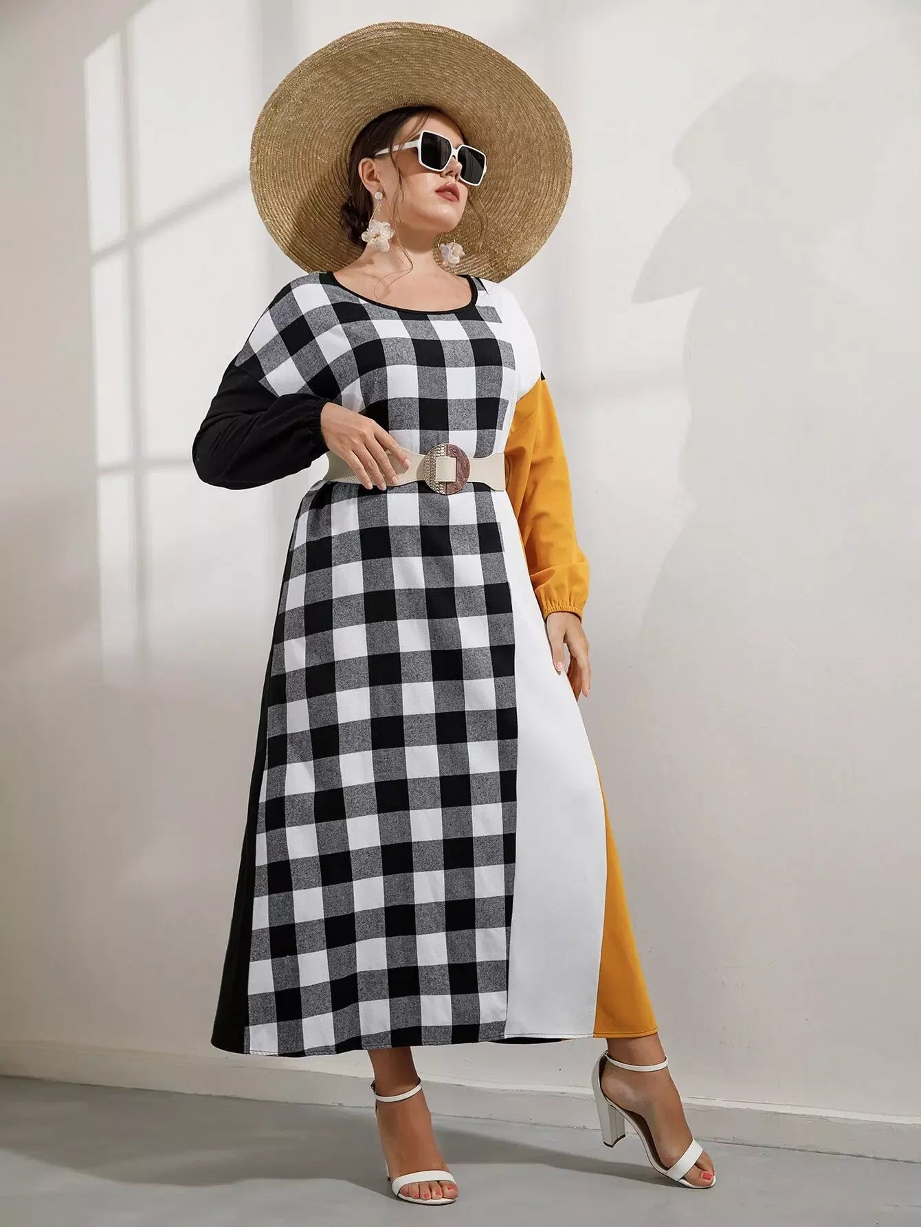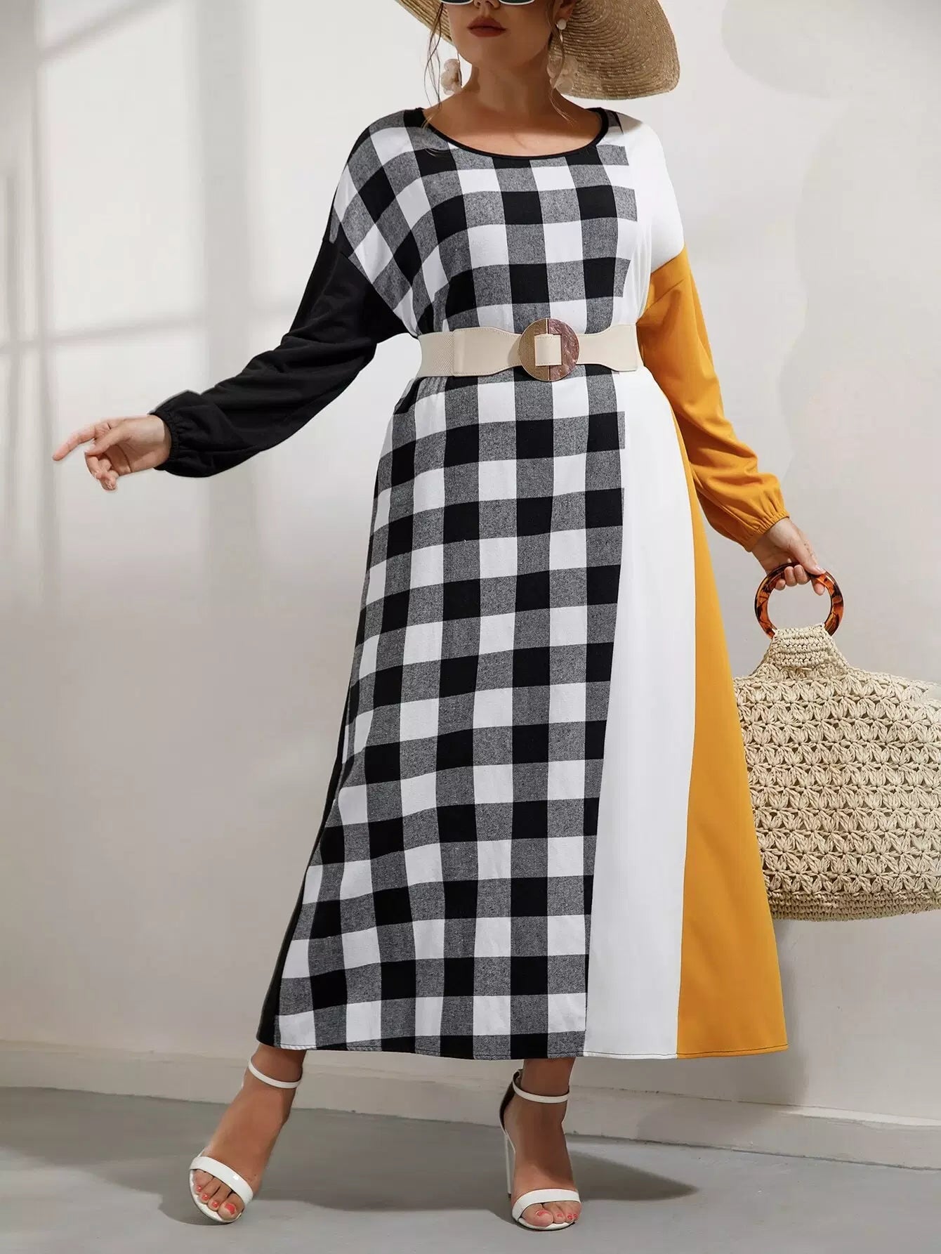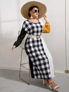 Plus Buffalo Plaid Panel Colorblock Drop Shoulder Dress Without Belt