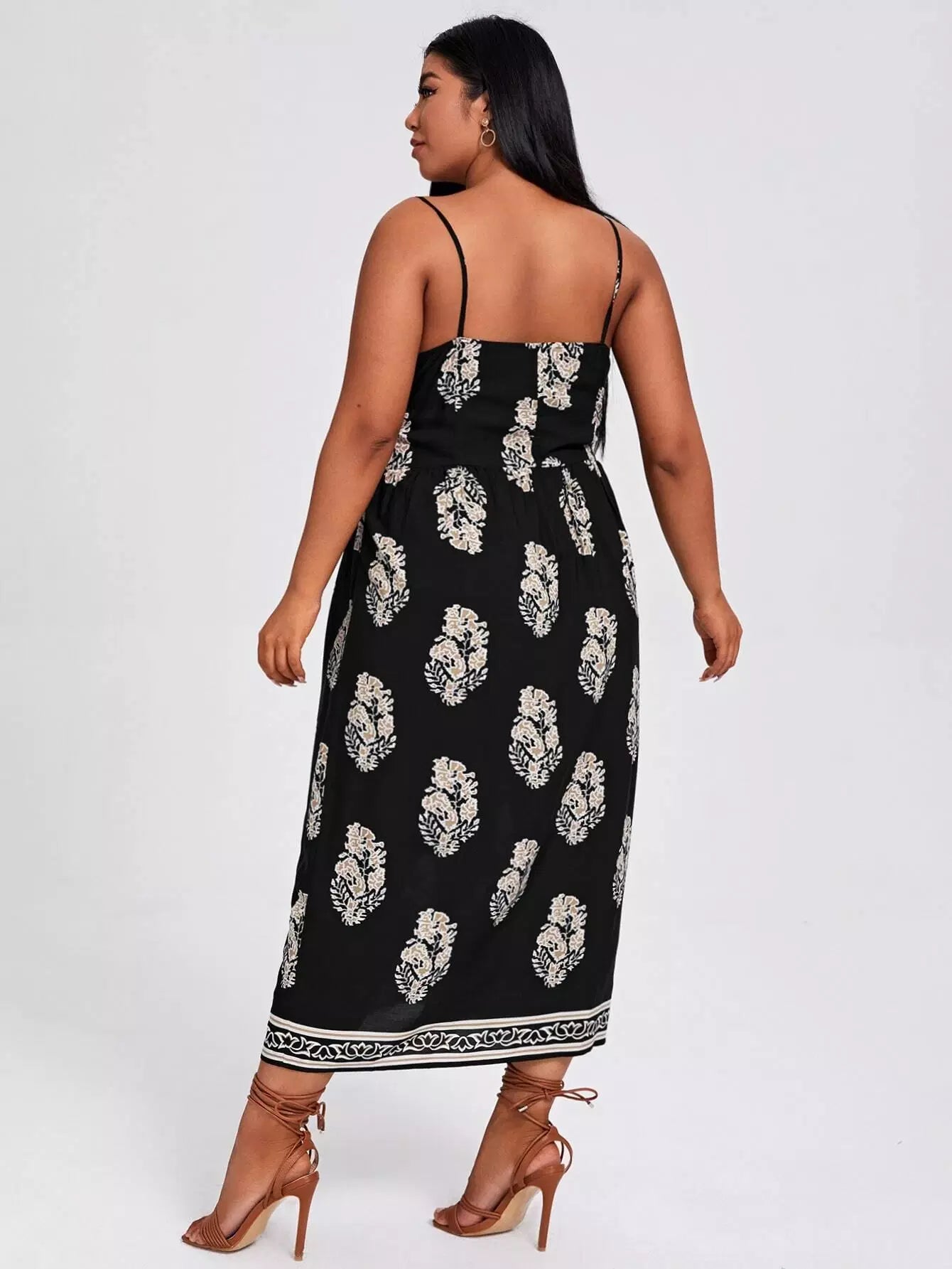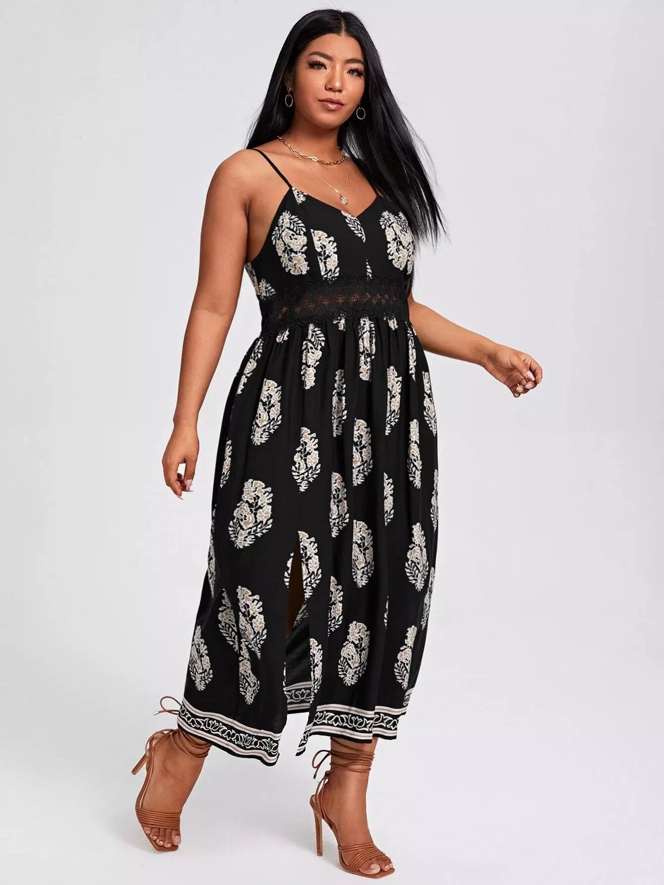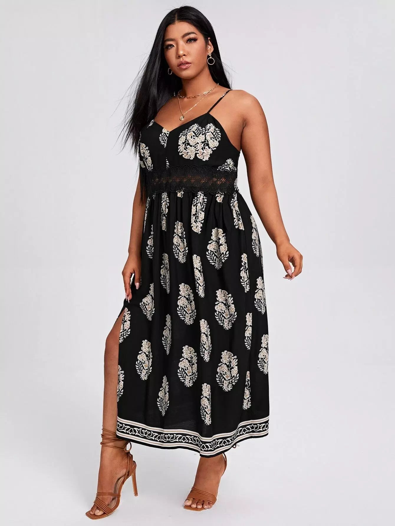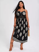 Women - Plus Contrast Lace Floral Print Slit Hem Cami Dress