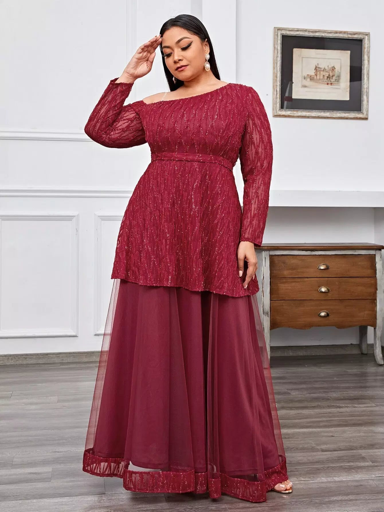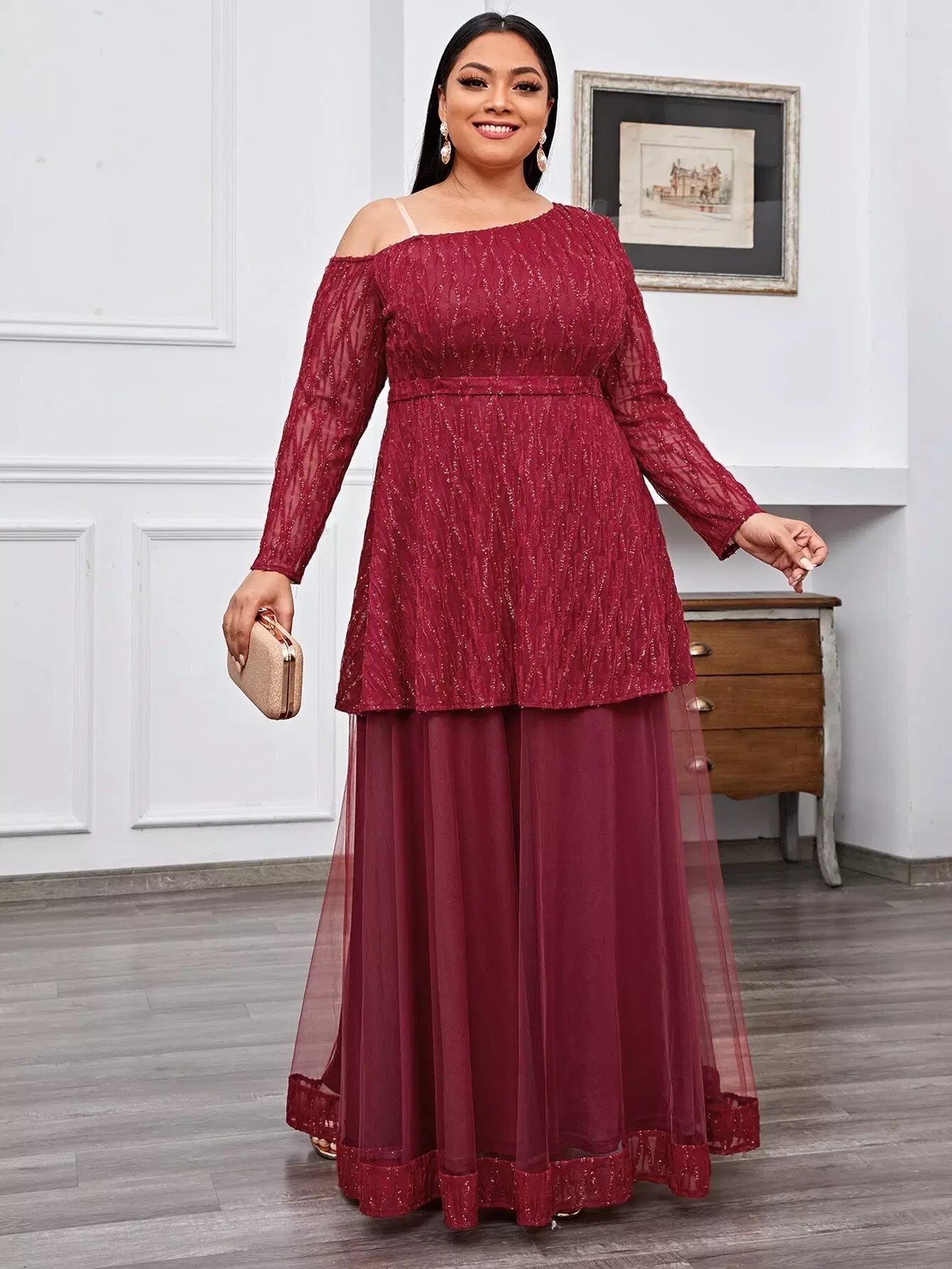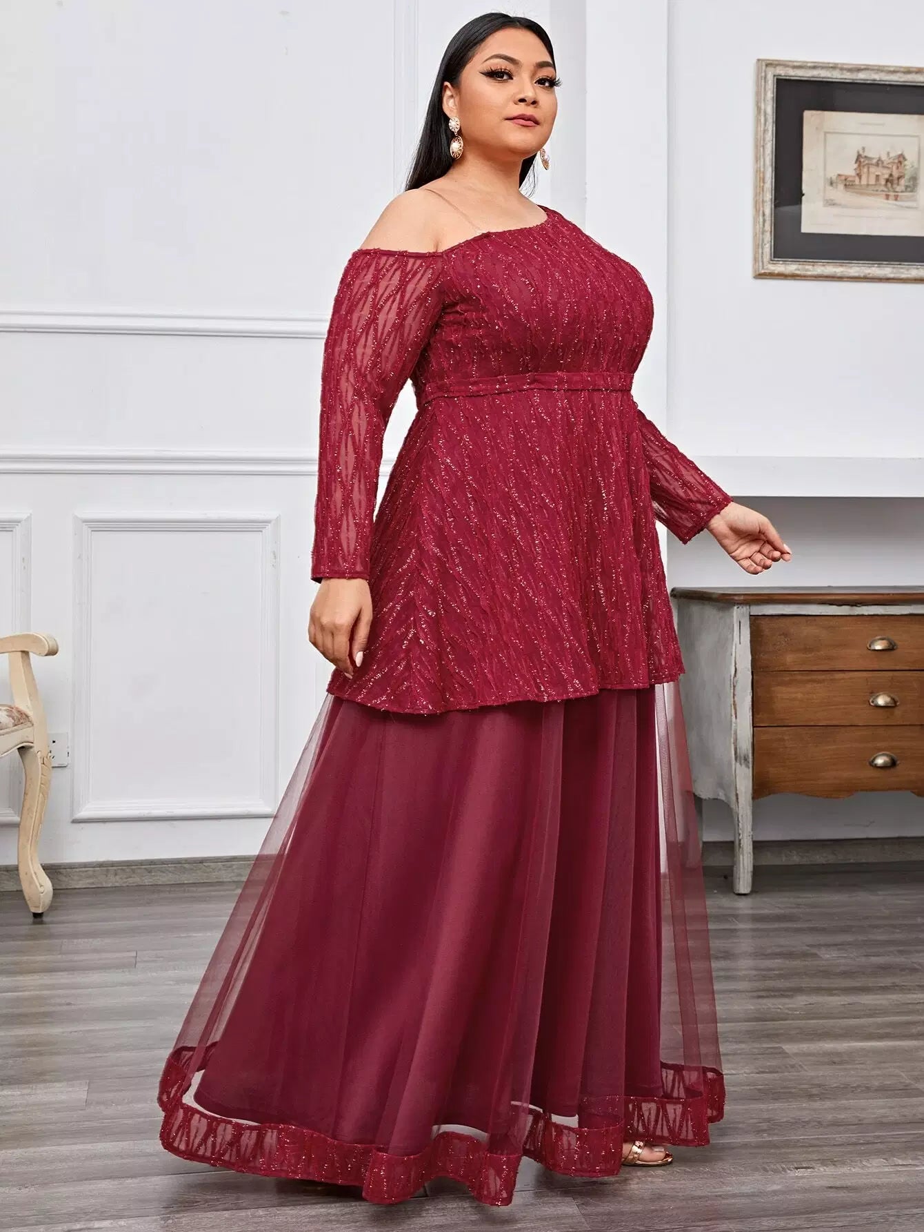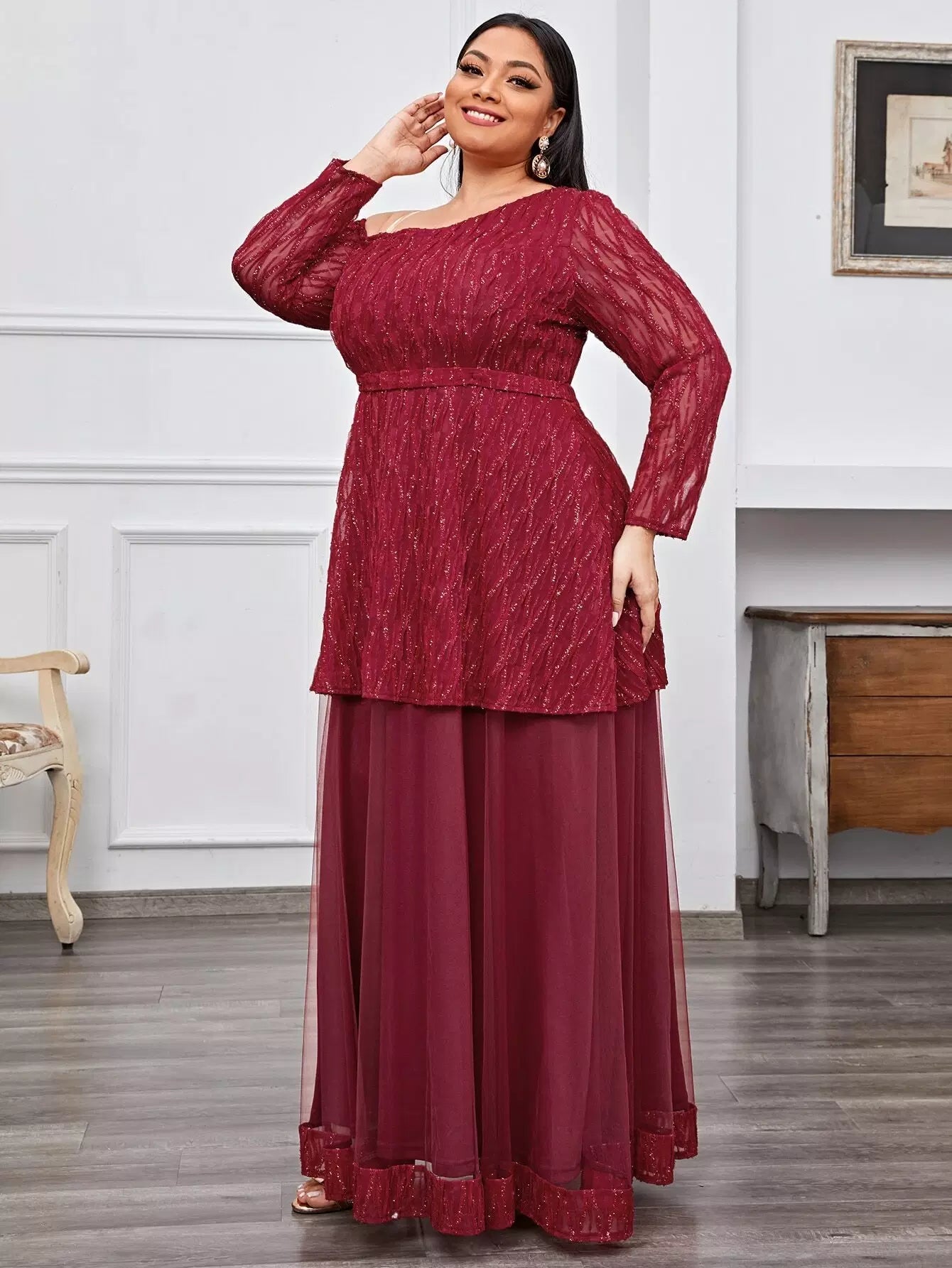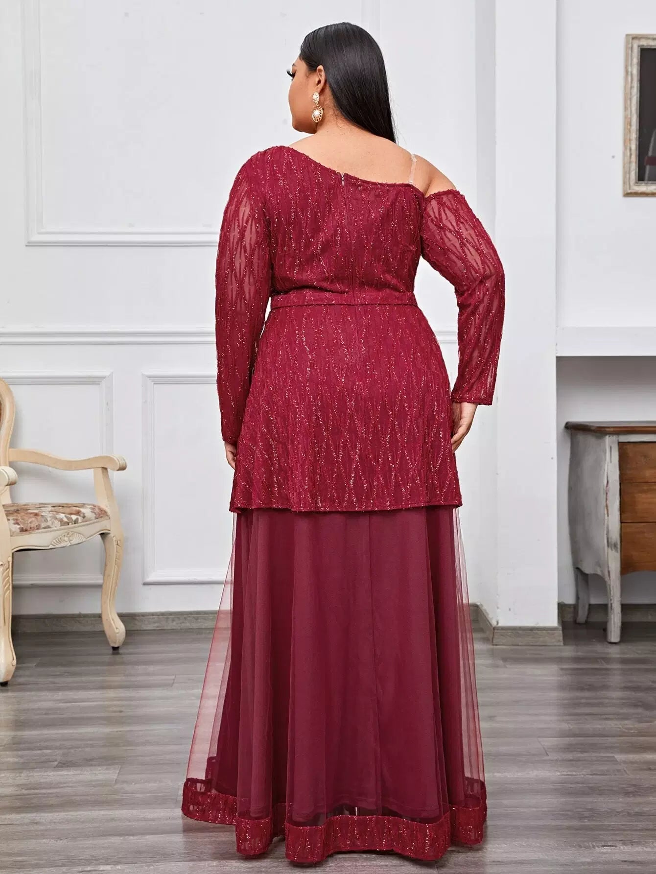 Plus Contrast Mesh Asymmetrical Neck Prom Dress