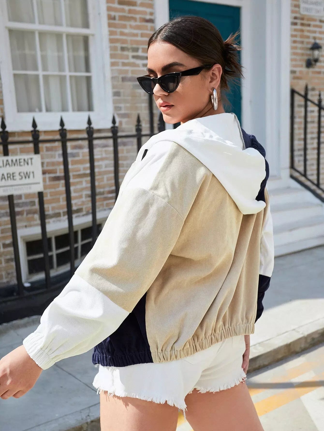 Plus Drop Shoulder Colorblock Zipper Up Hooded Jacket