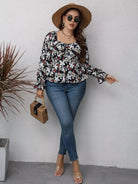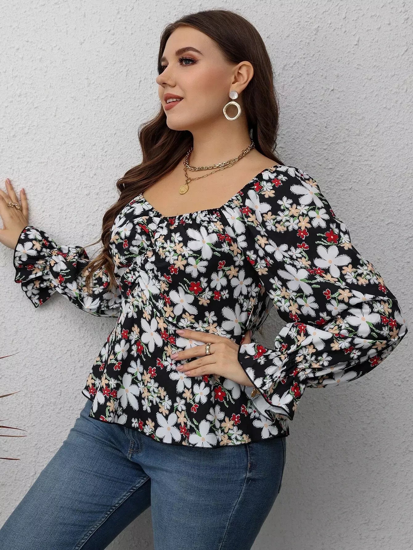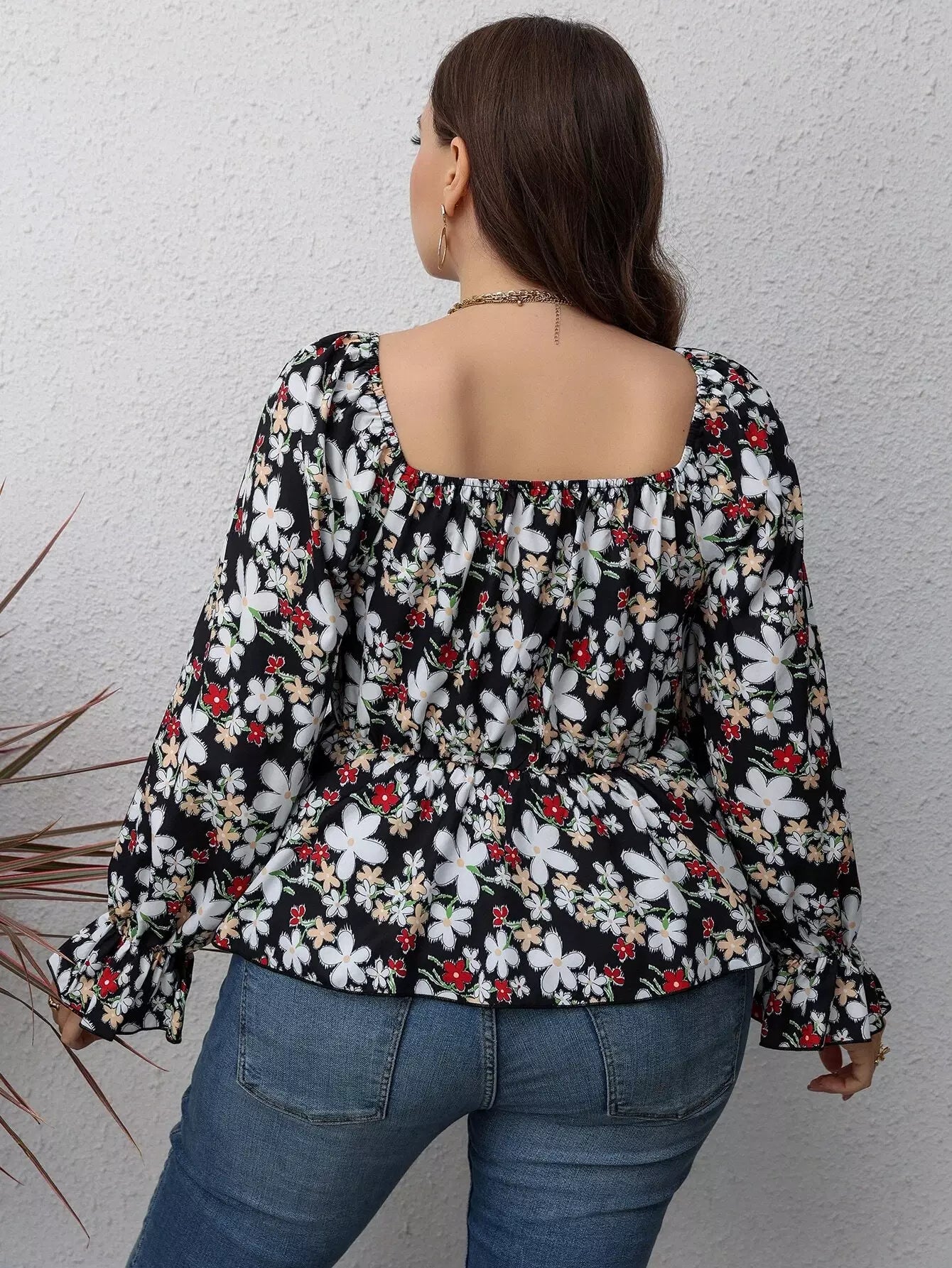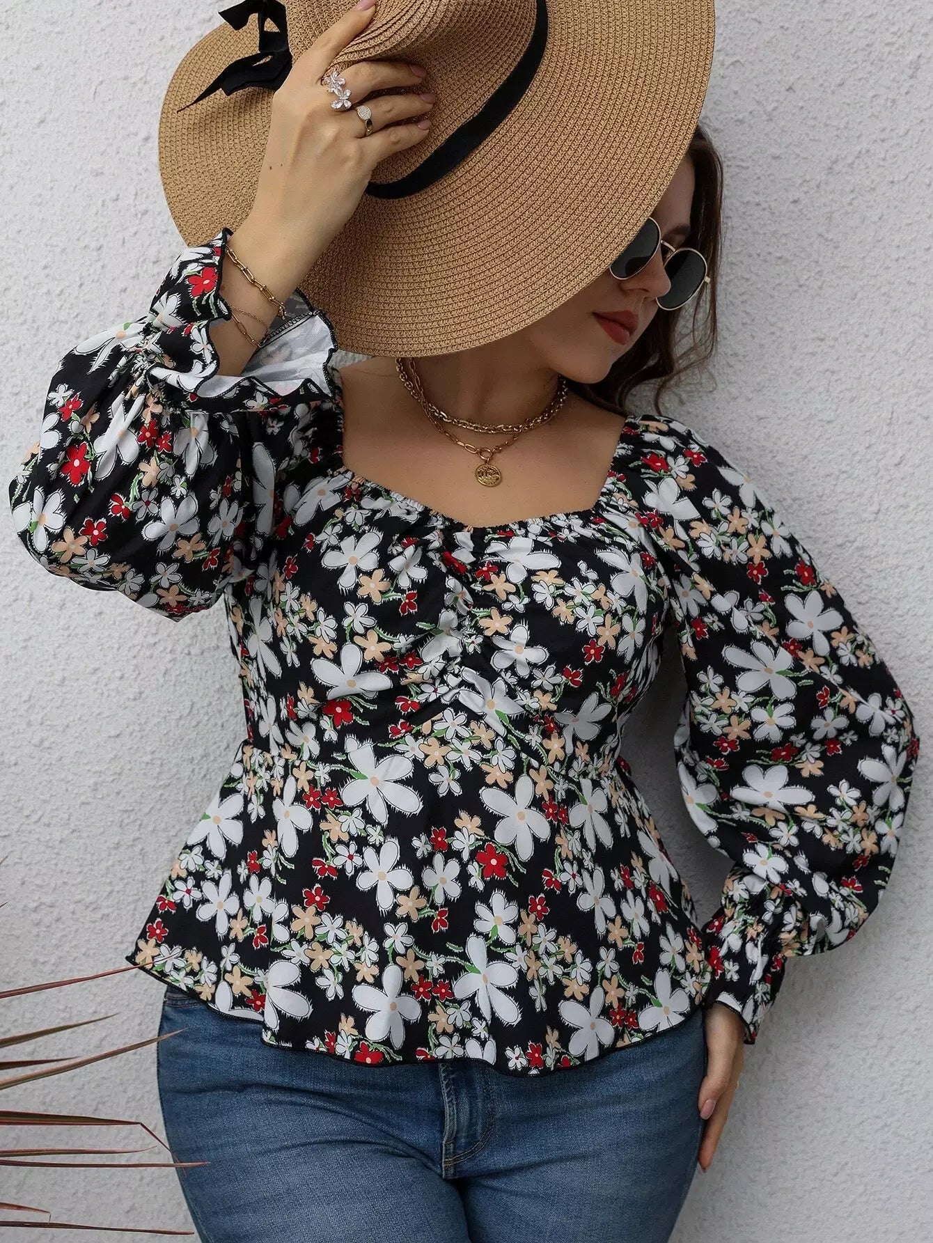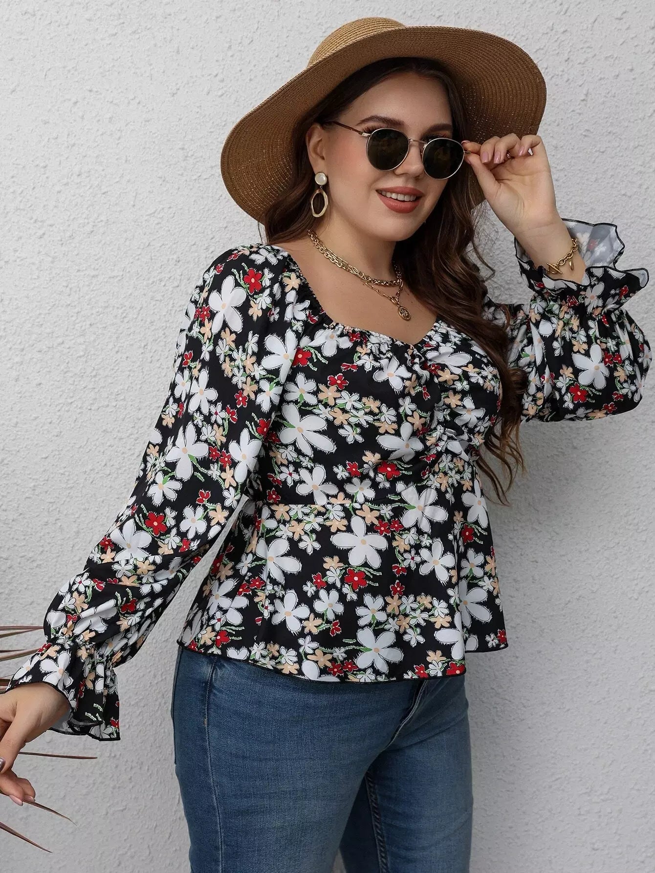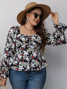 Plus Floral Print Flounce Sleeve Ruched Peplum Blouse