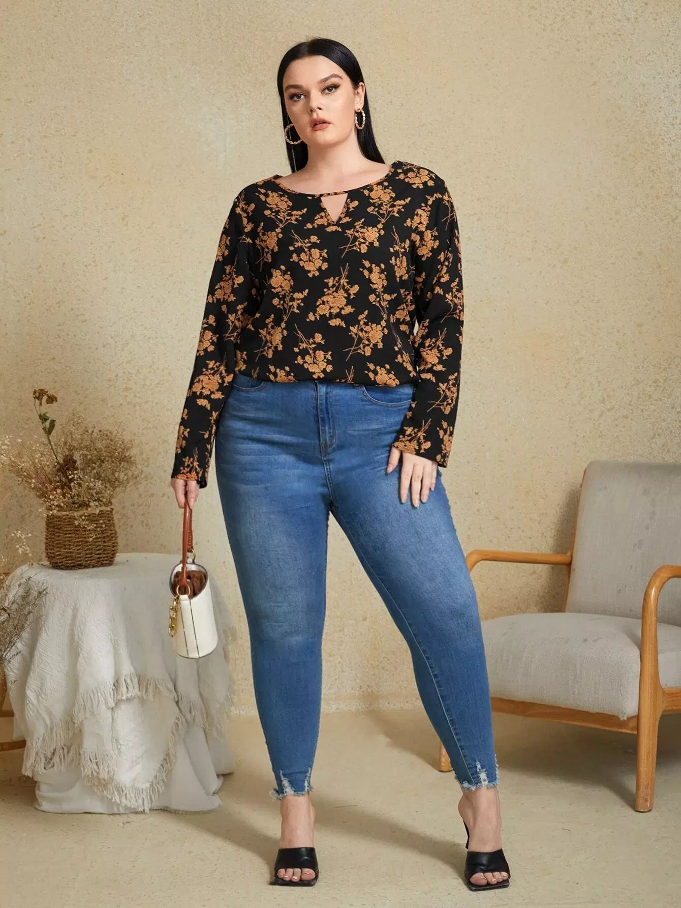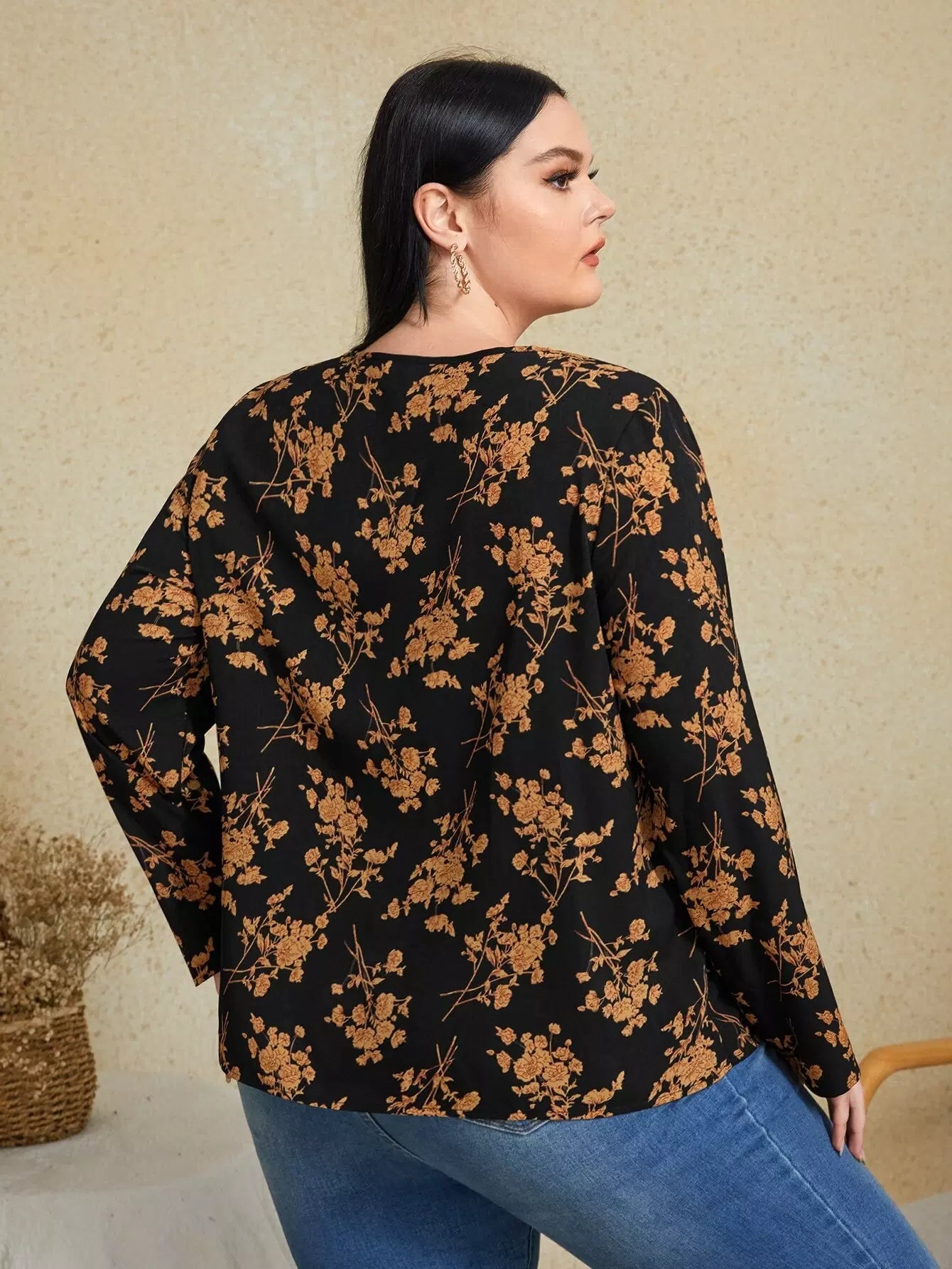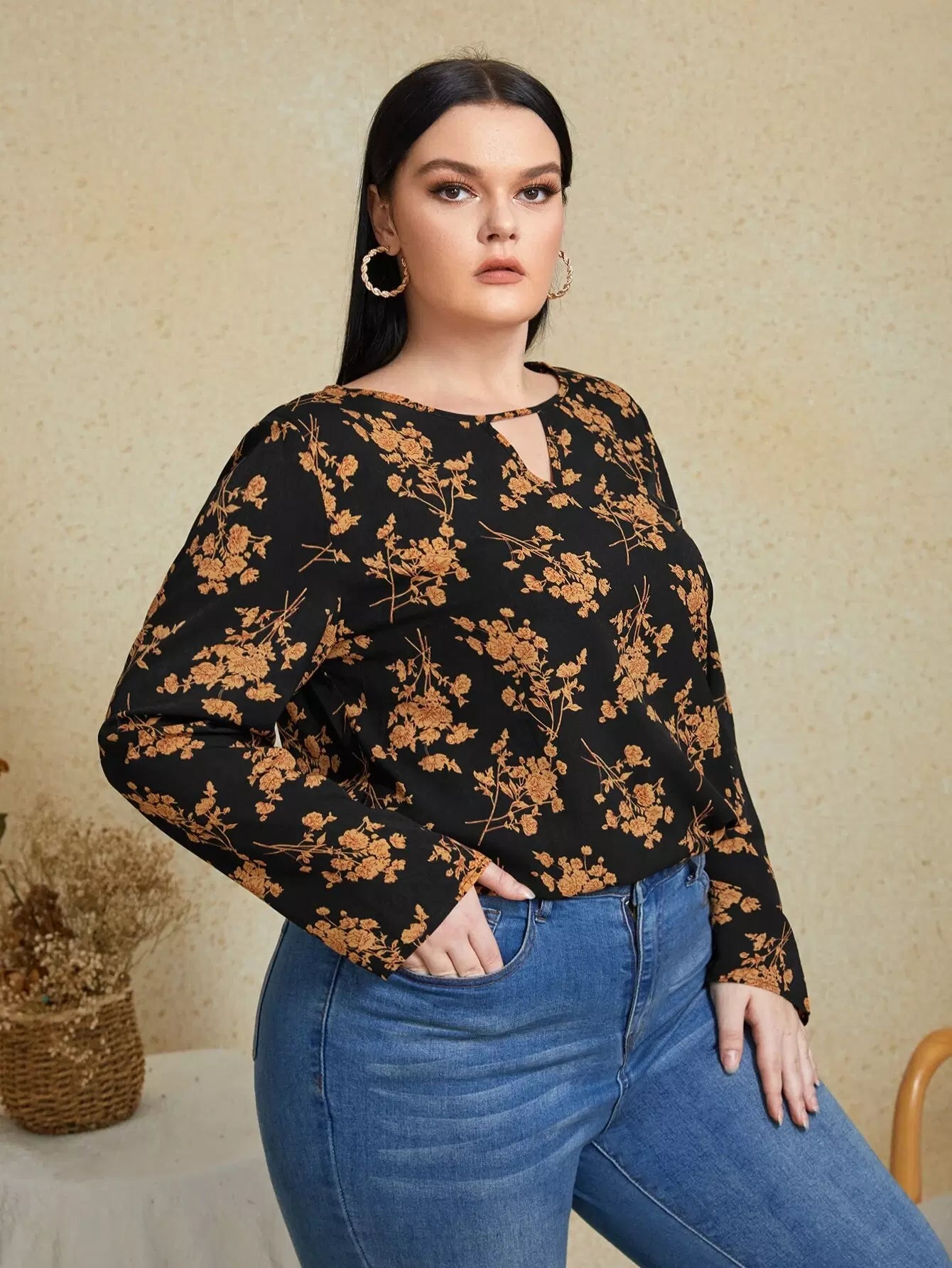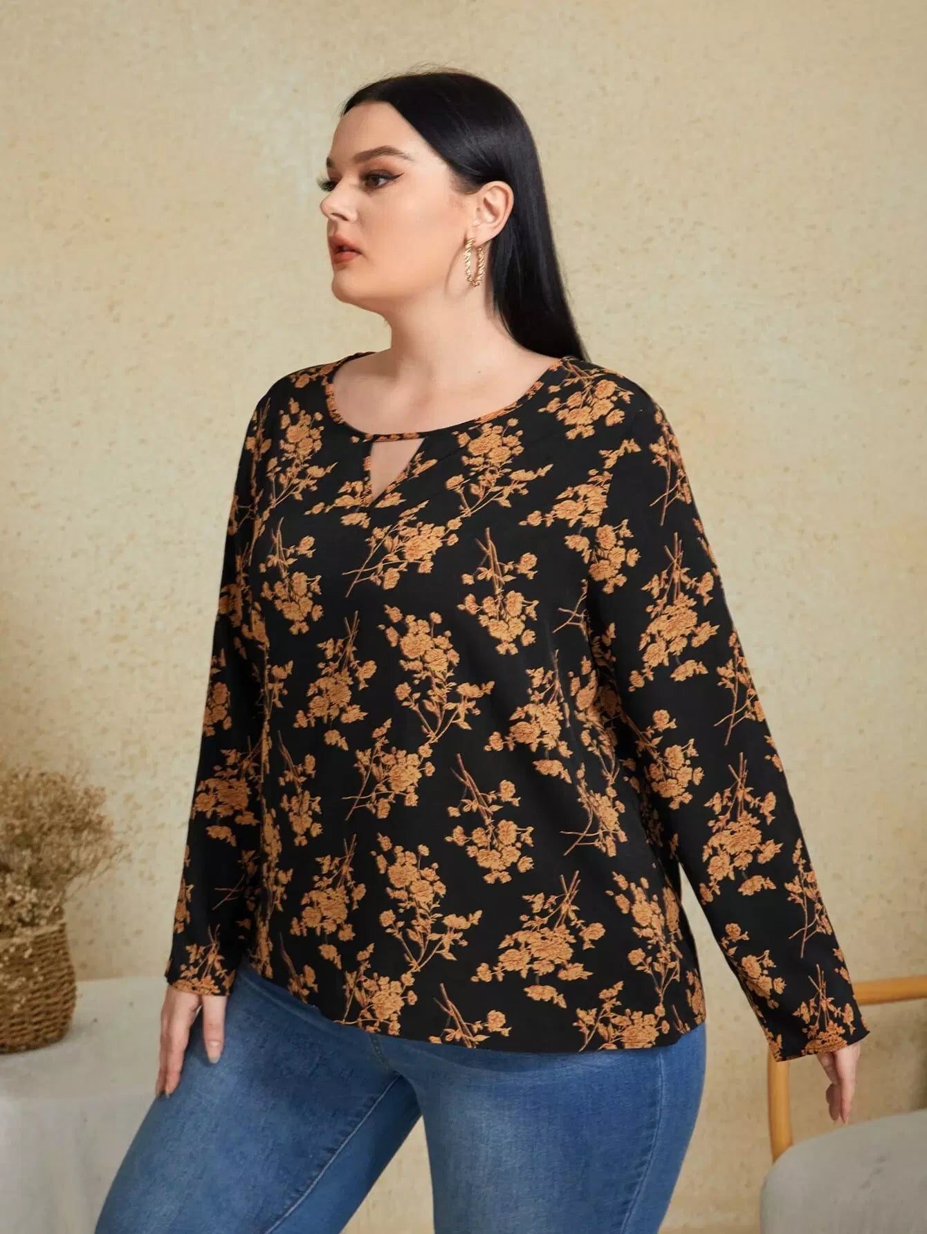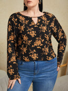 Plus Floral Print Keyhole Neckline Blouse