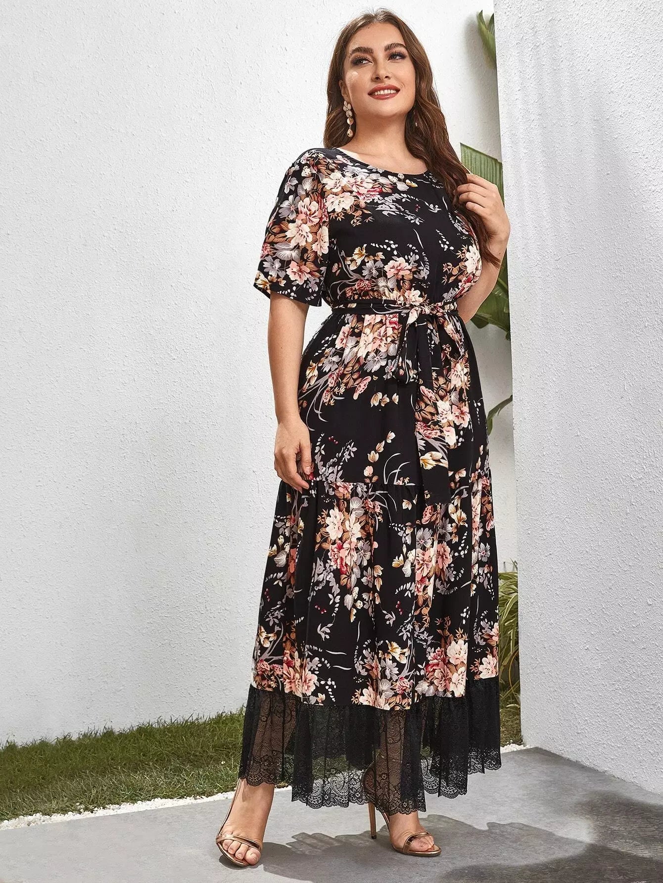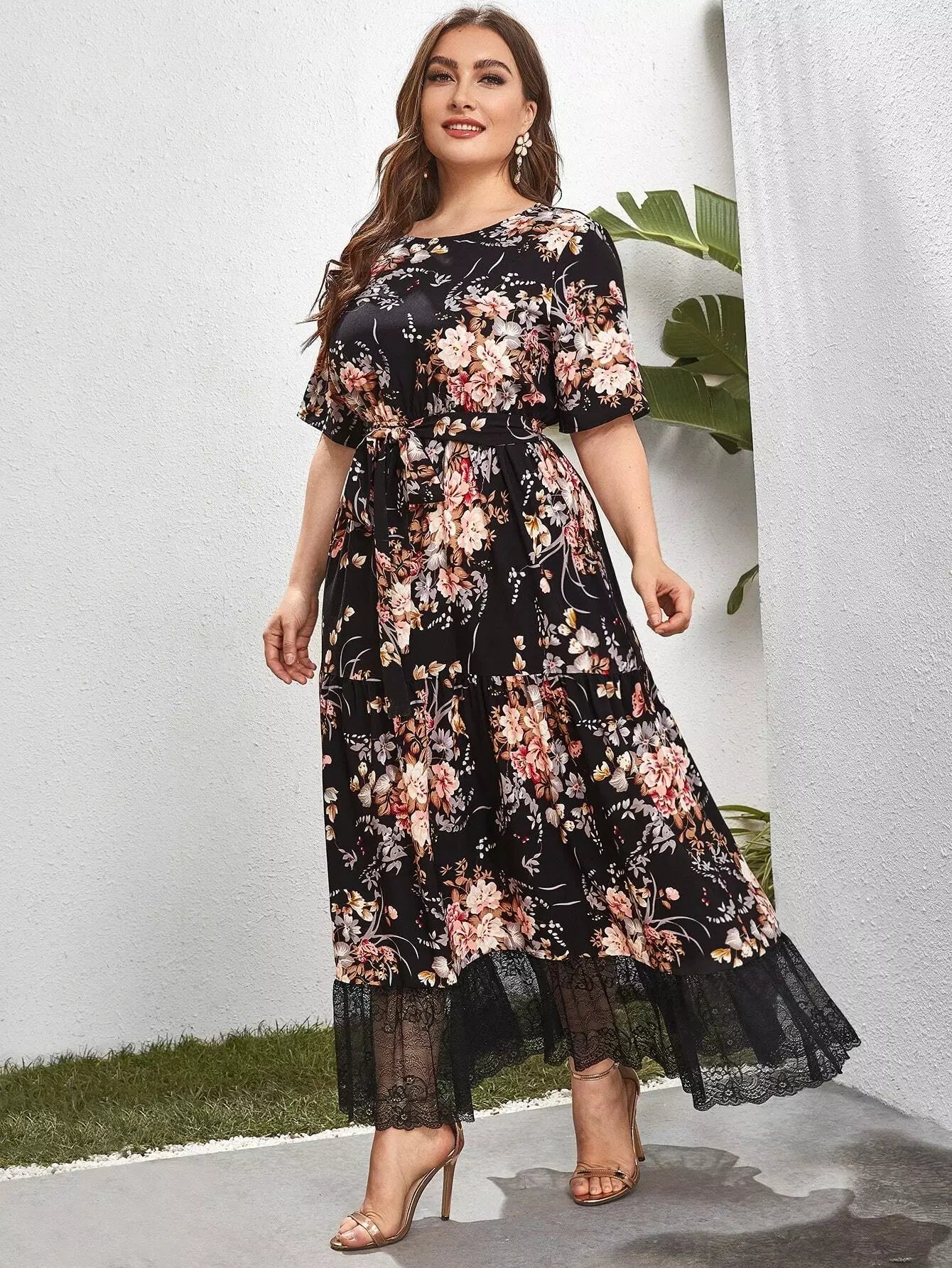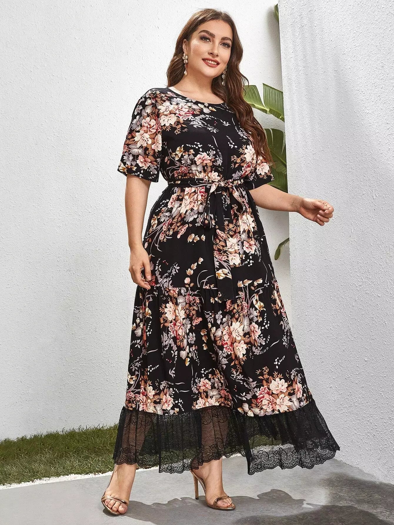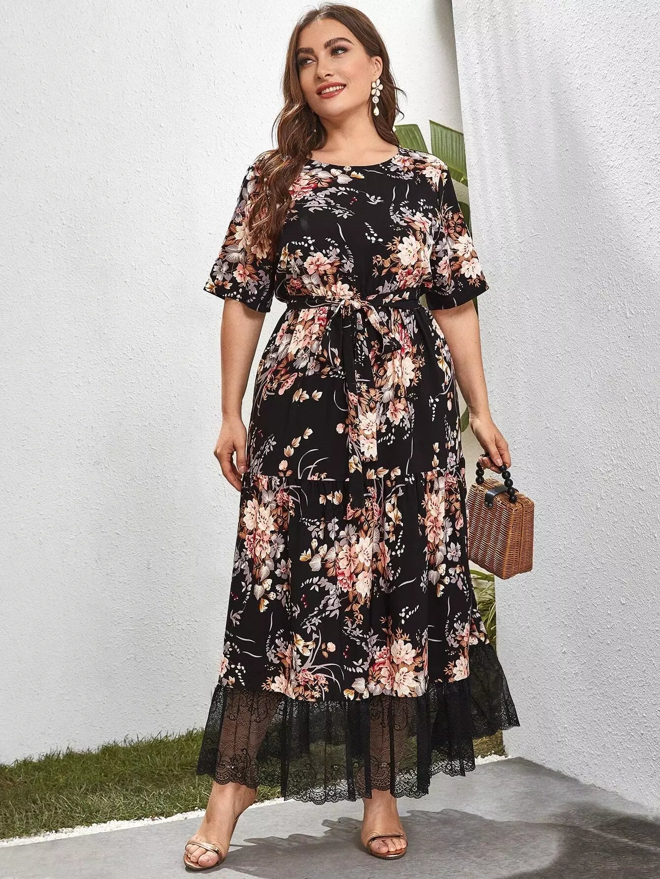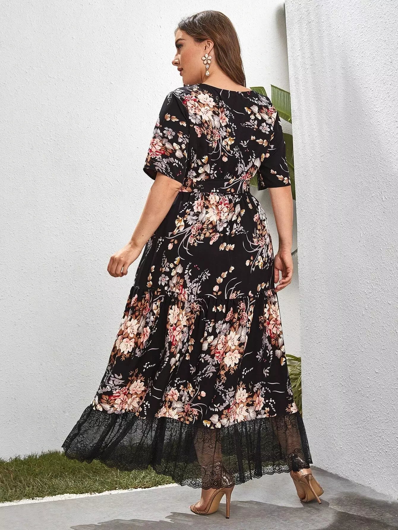Plus Lace Ruffle Hem Floral Dress Without Belt