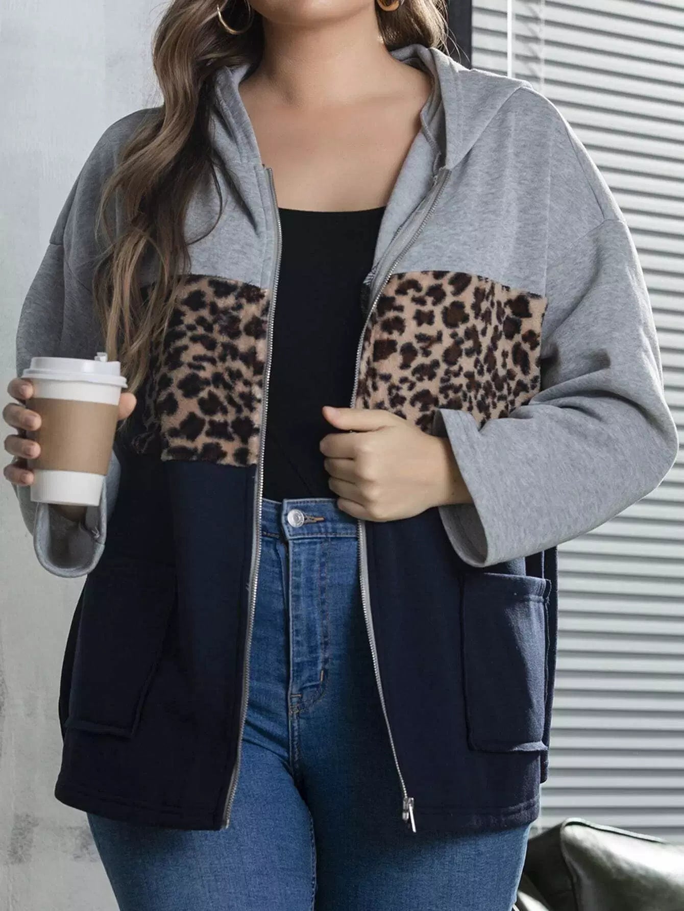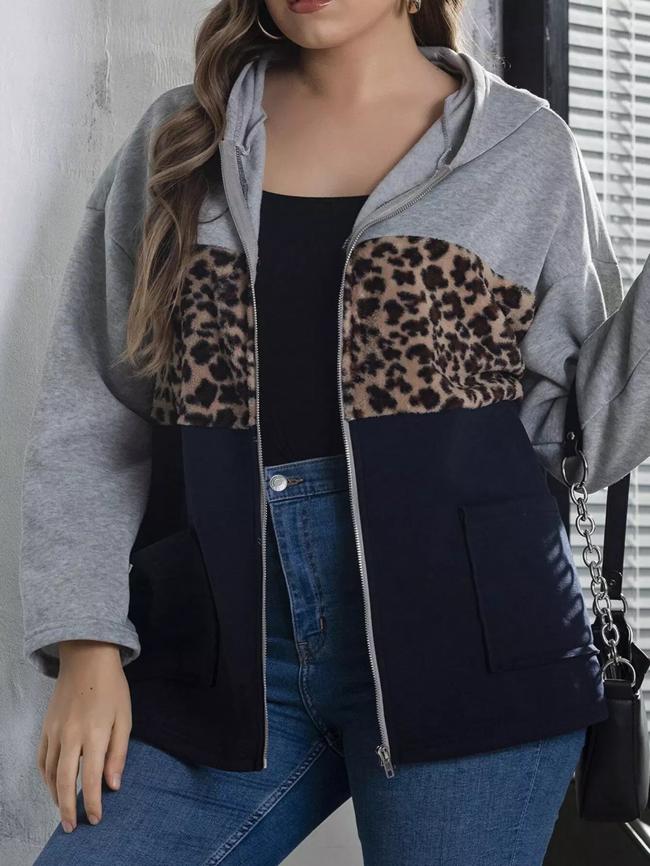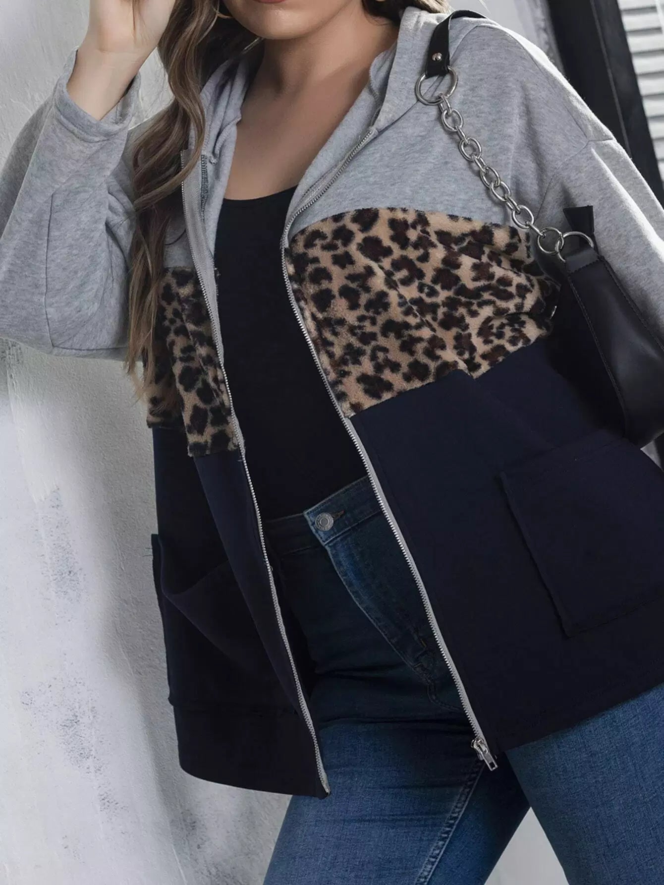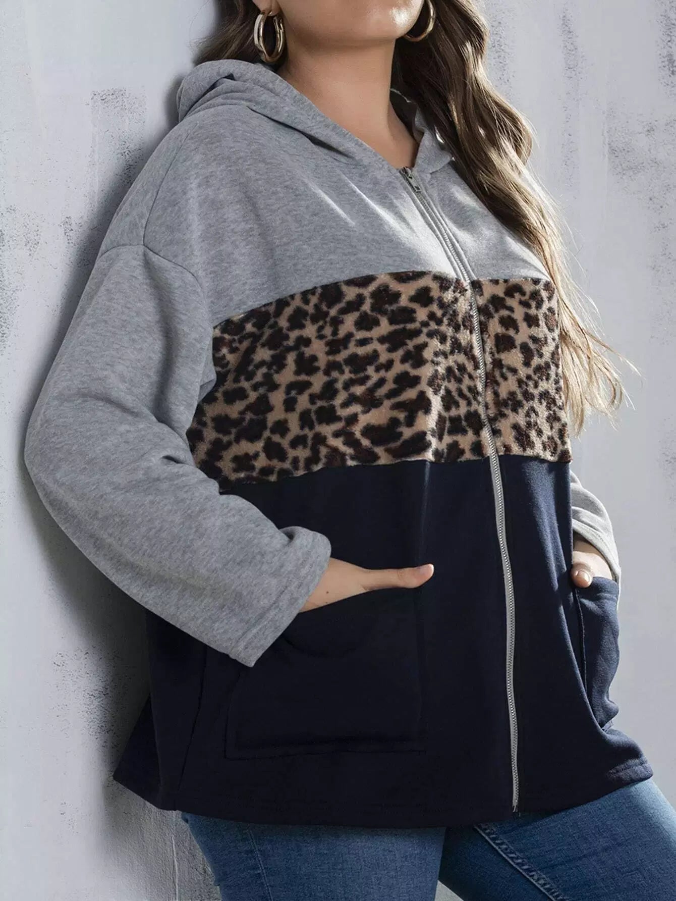 Women - Plus Leopard Color Block Drop Shoulder Drawstring Hoodie