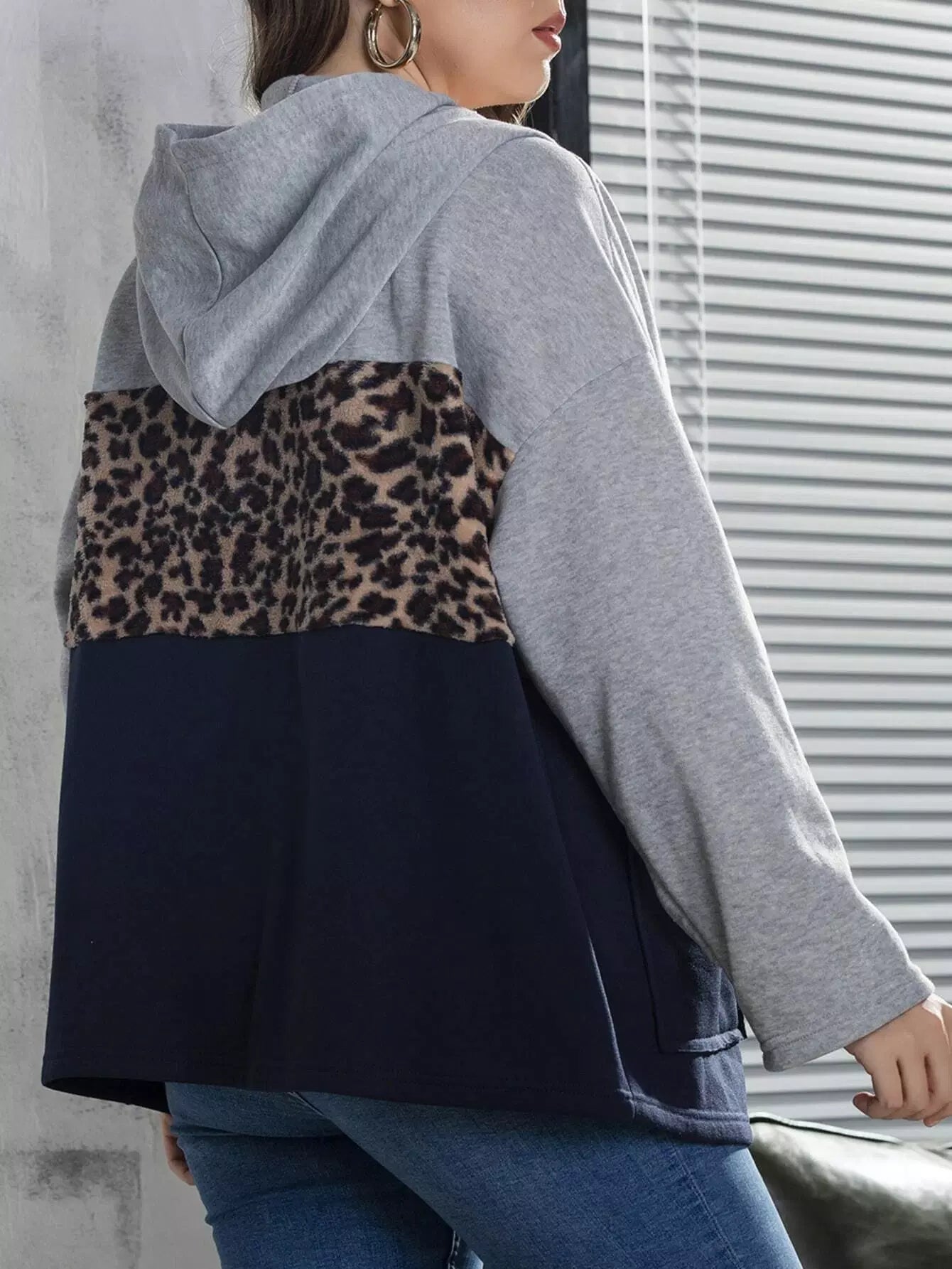 Plus Leopard Color Block Drop Shoulder Drawstring Hoodie