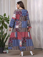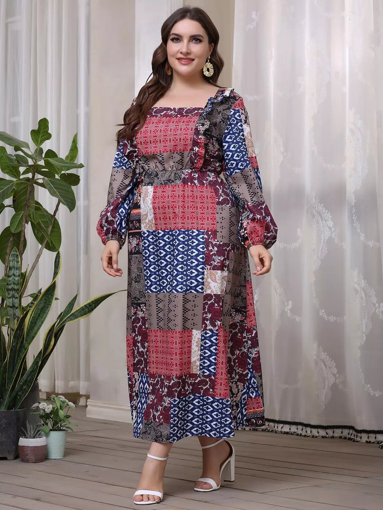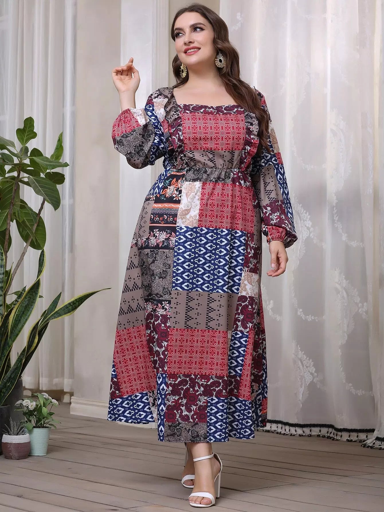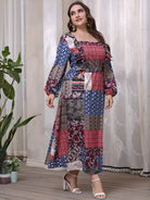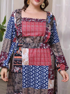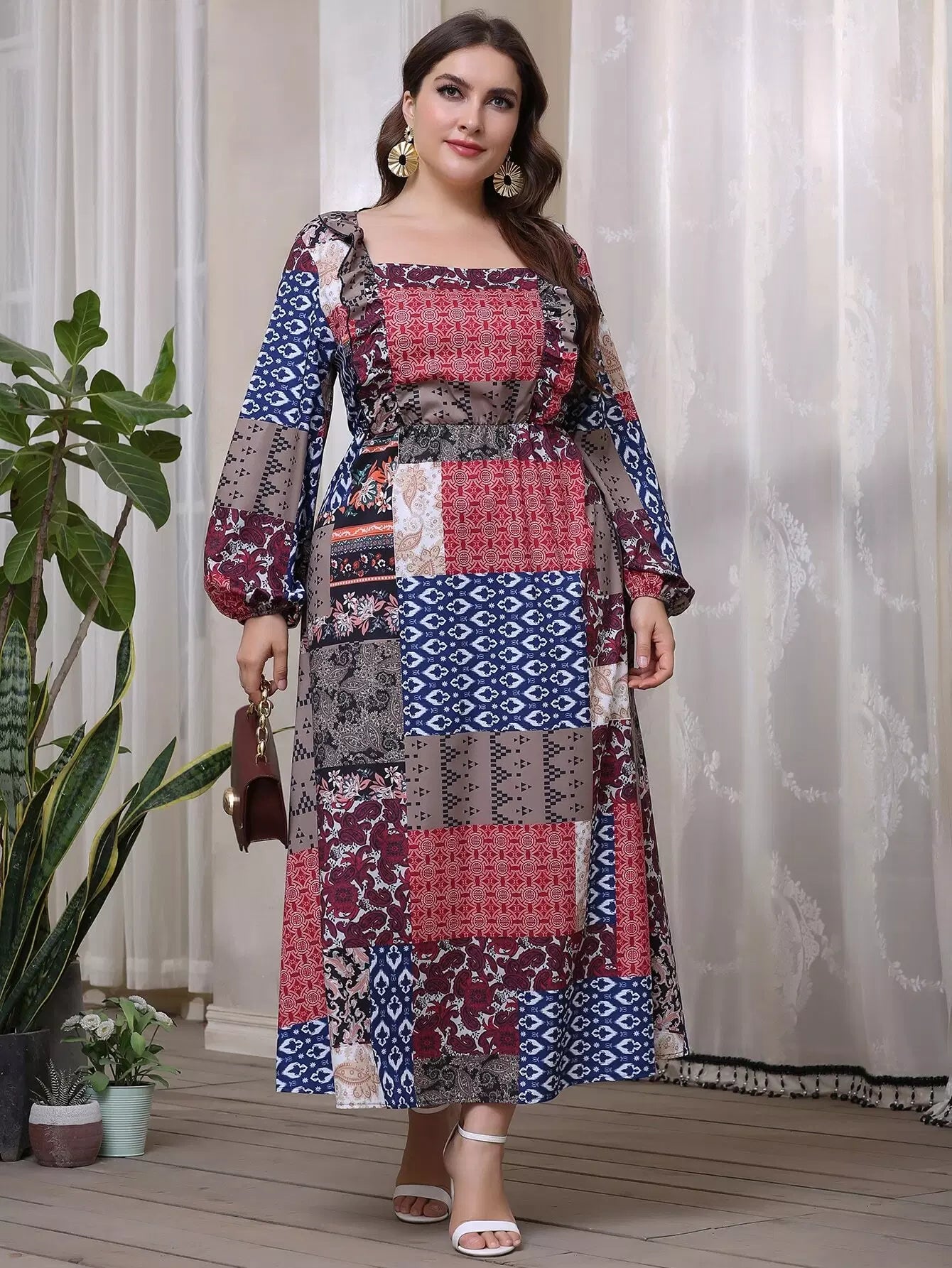 Plus Patchwork And Geo Print Bishop Sleeve A-line Dress