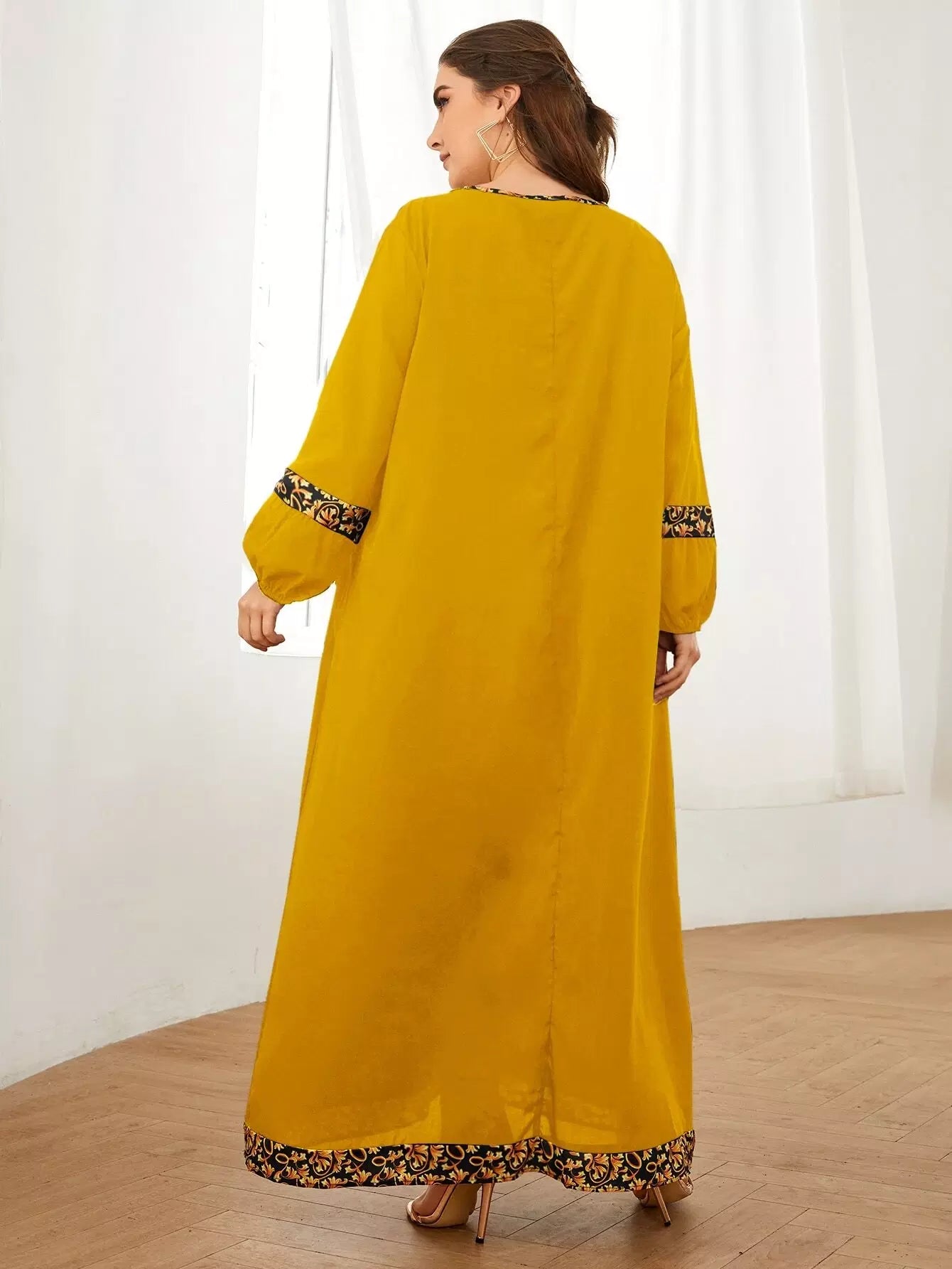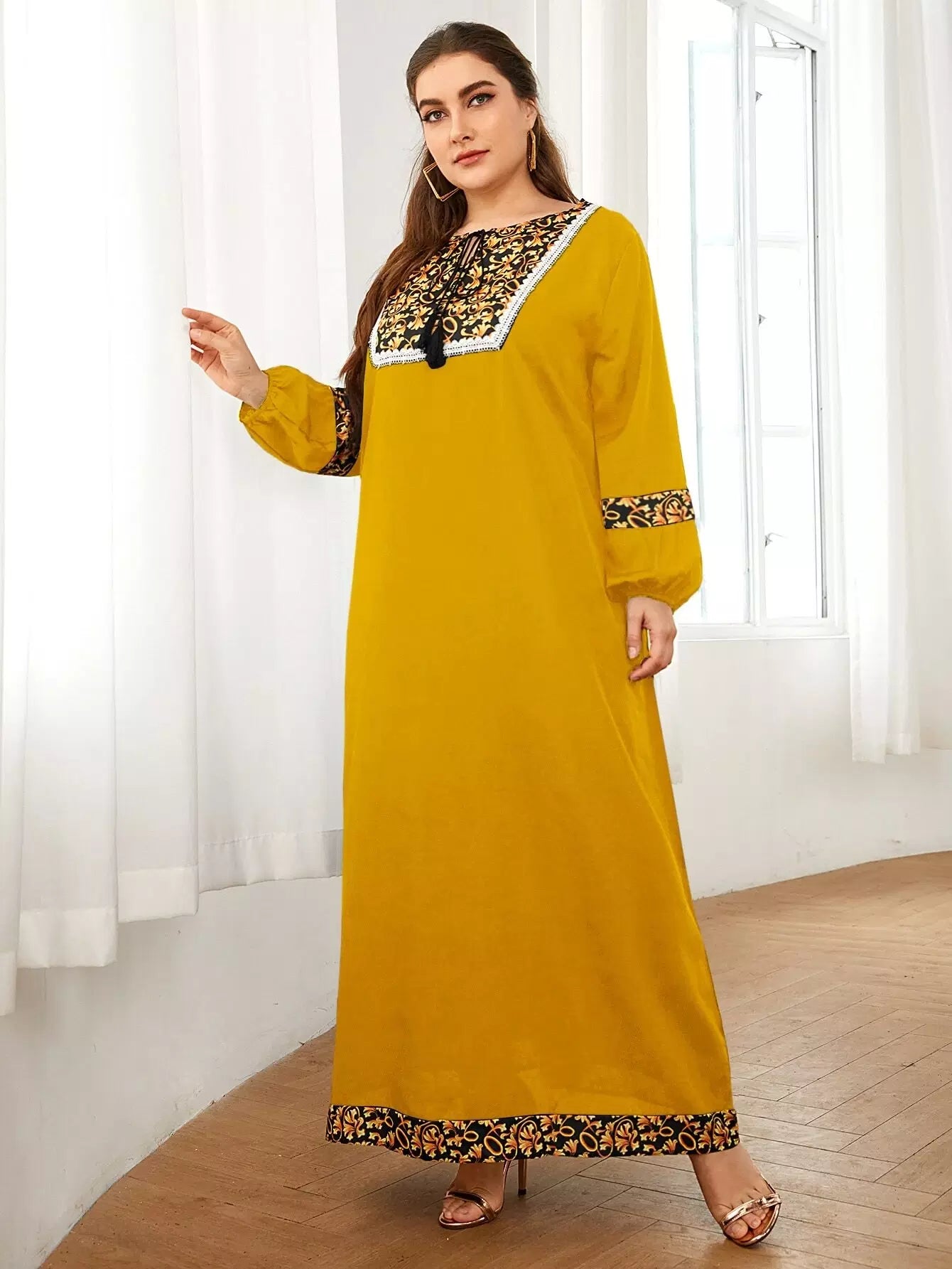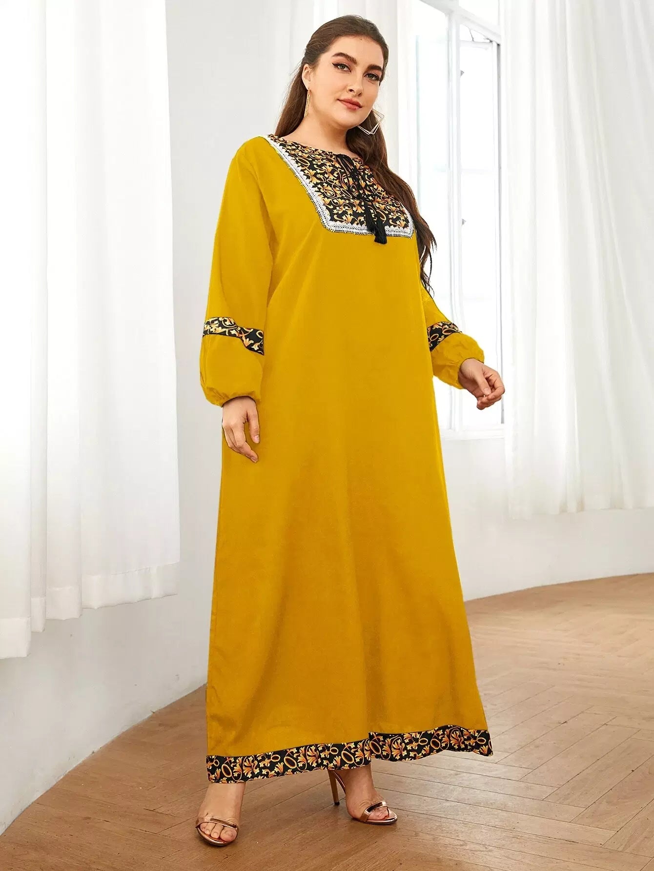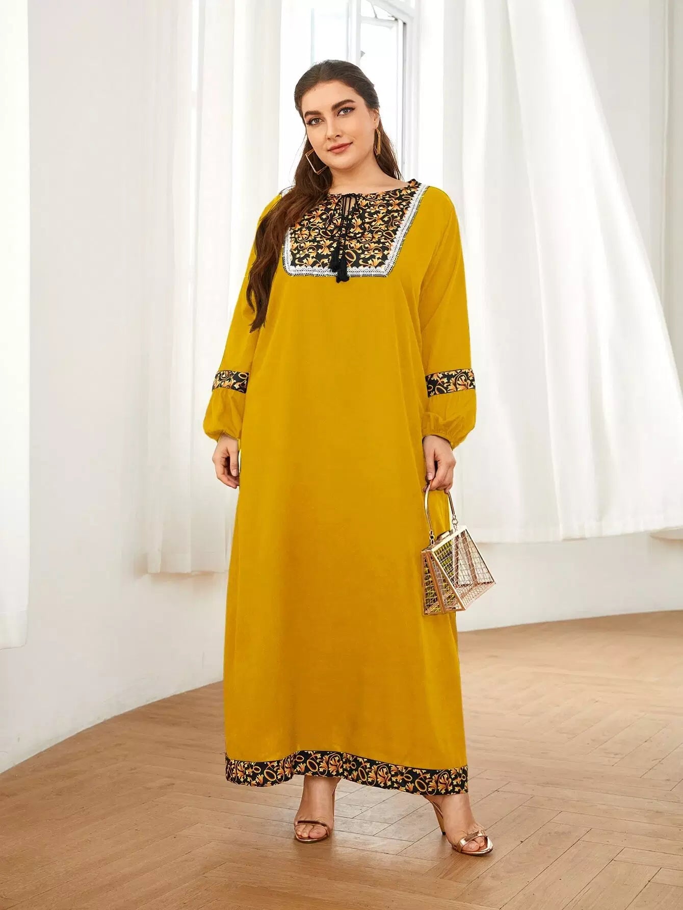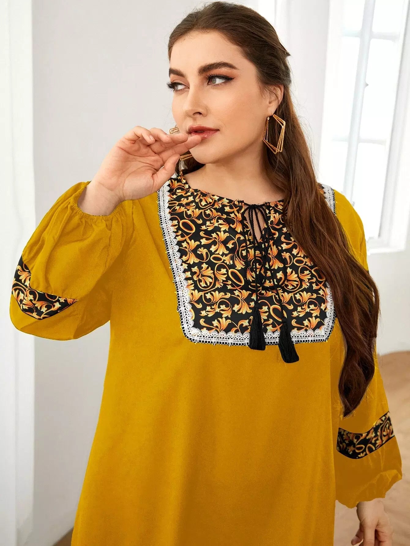 Plus Scroll Print Lace Insert Tie Neck Maxi Tunic Dress