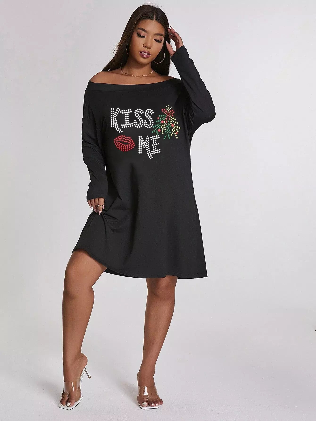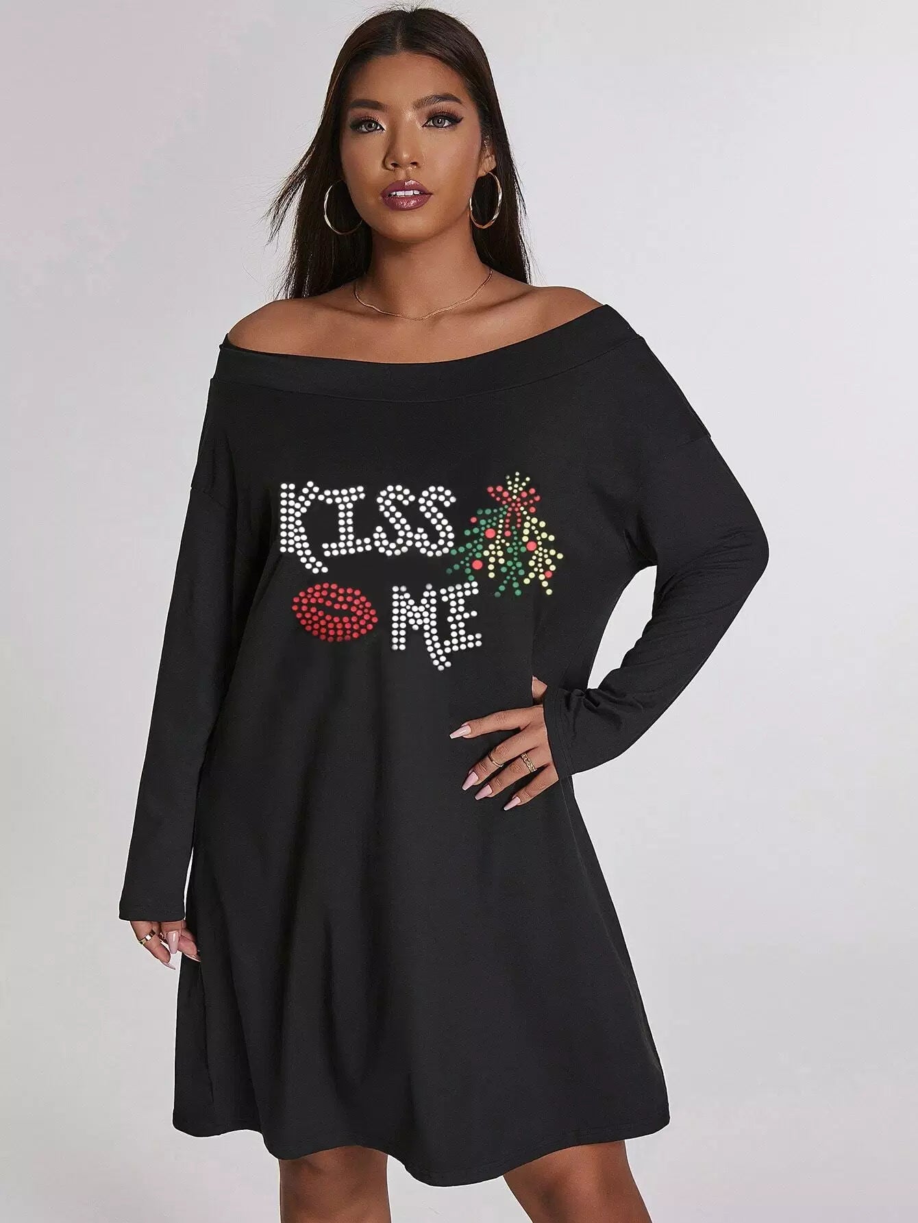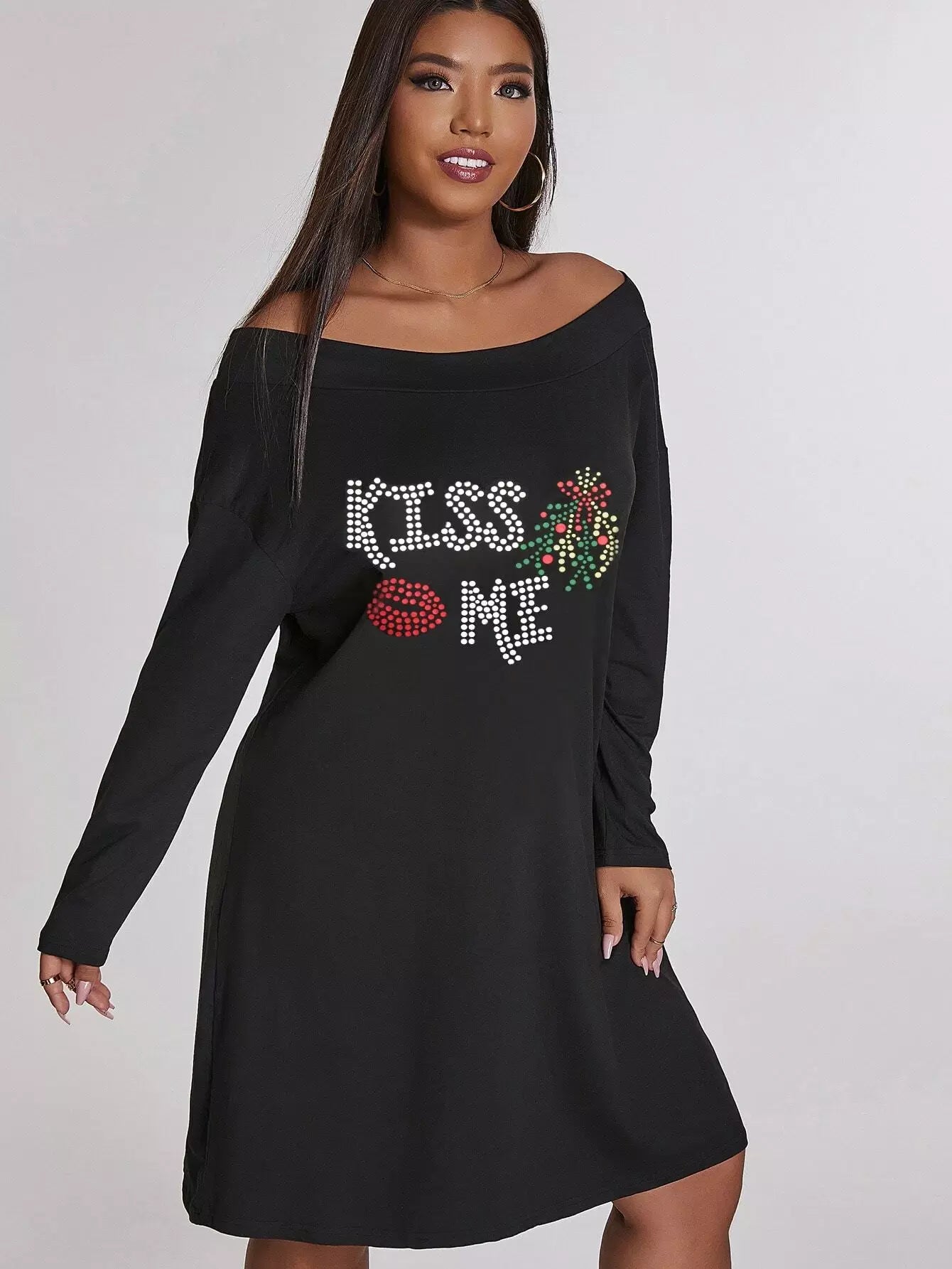 Plus Slogan & Lip Print Off Shoulder Dress