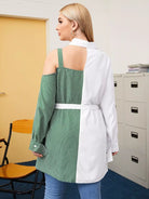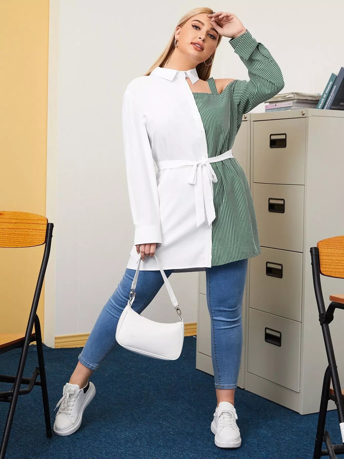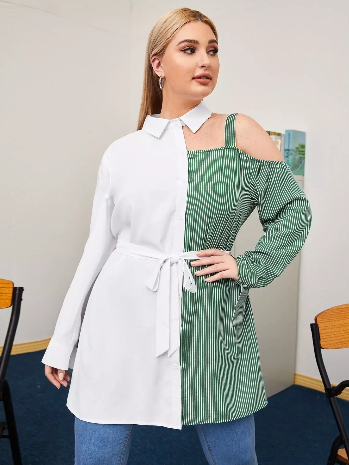 Women - Plus Striped Colorblock Asymmetrical Neck Belted Shirt