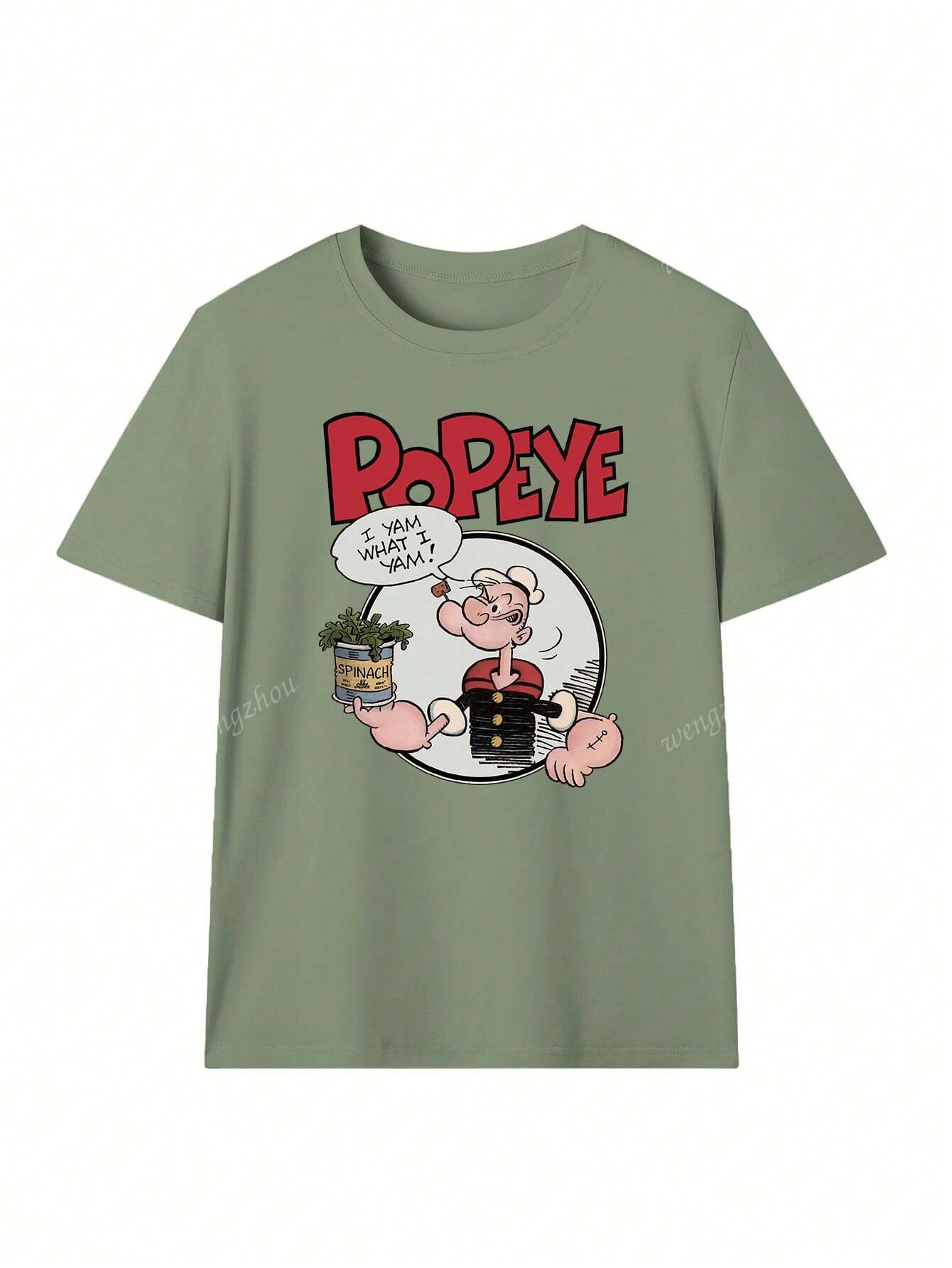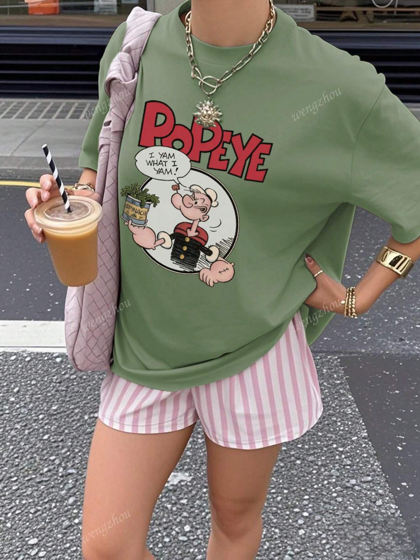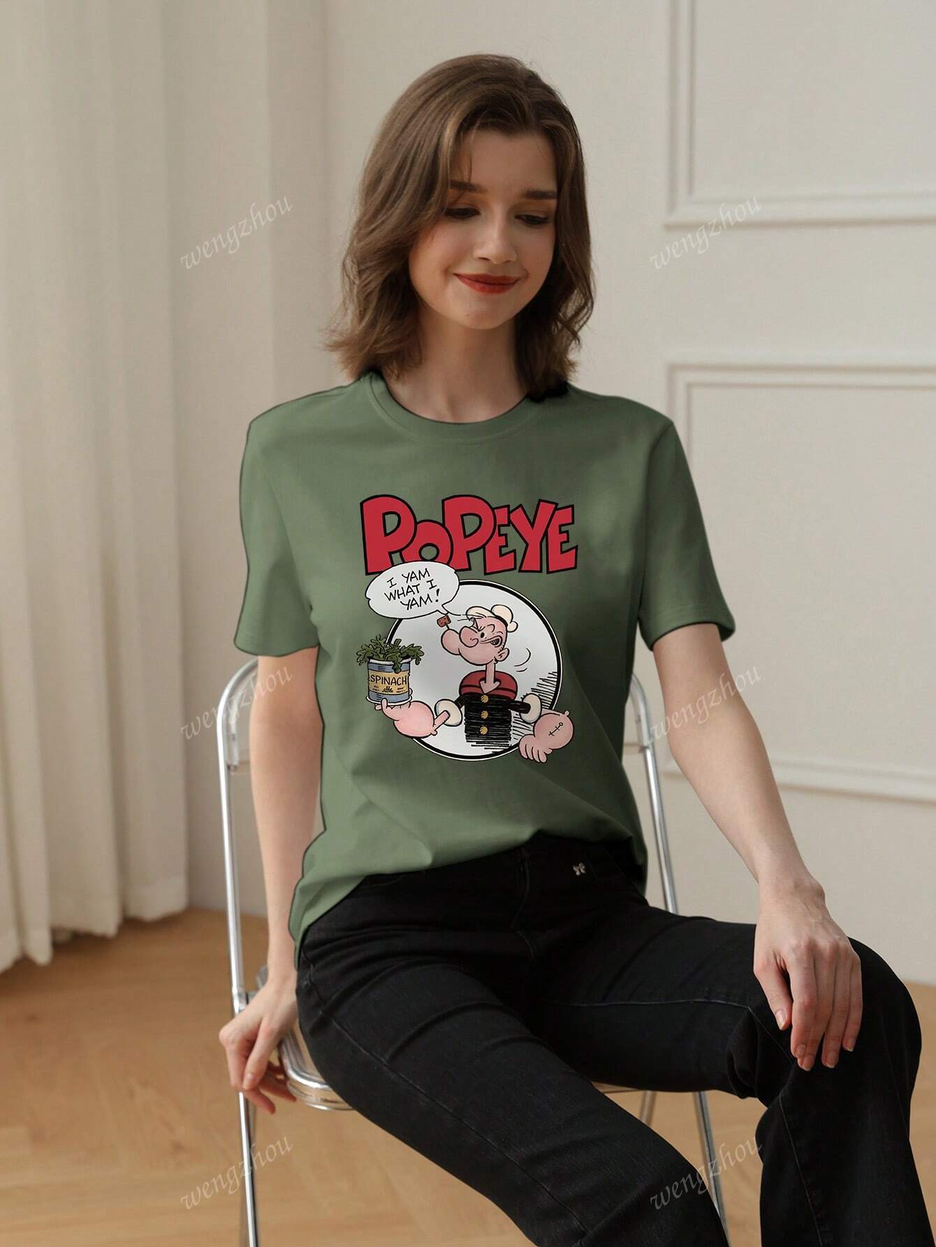 Popeye Women's Summer New Colorful Letter & Popeye Cartoon Character Print Round Neck Short Sleeve Casual