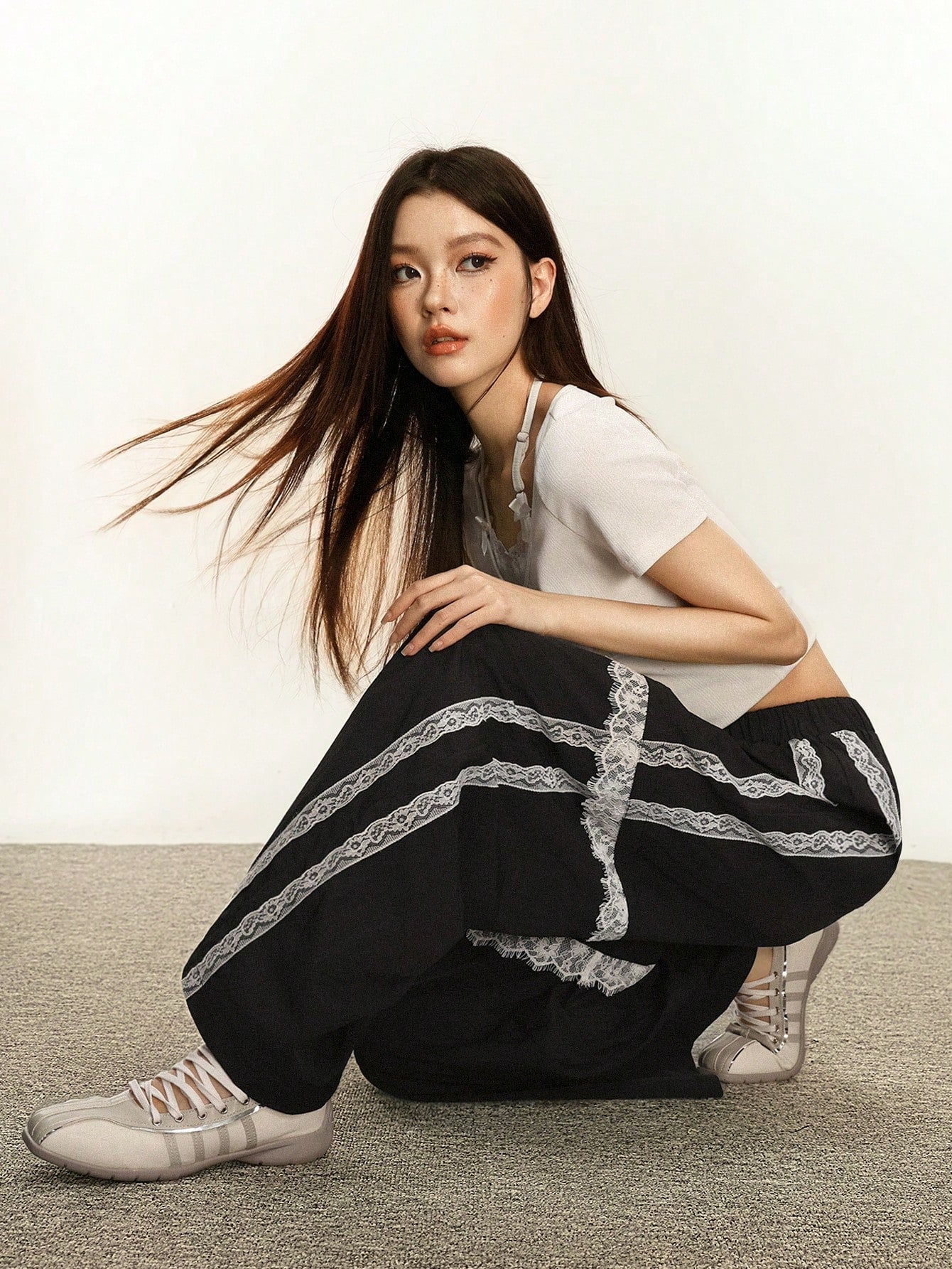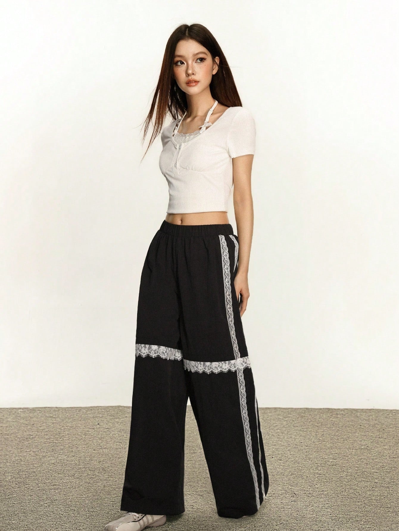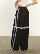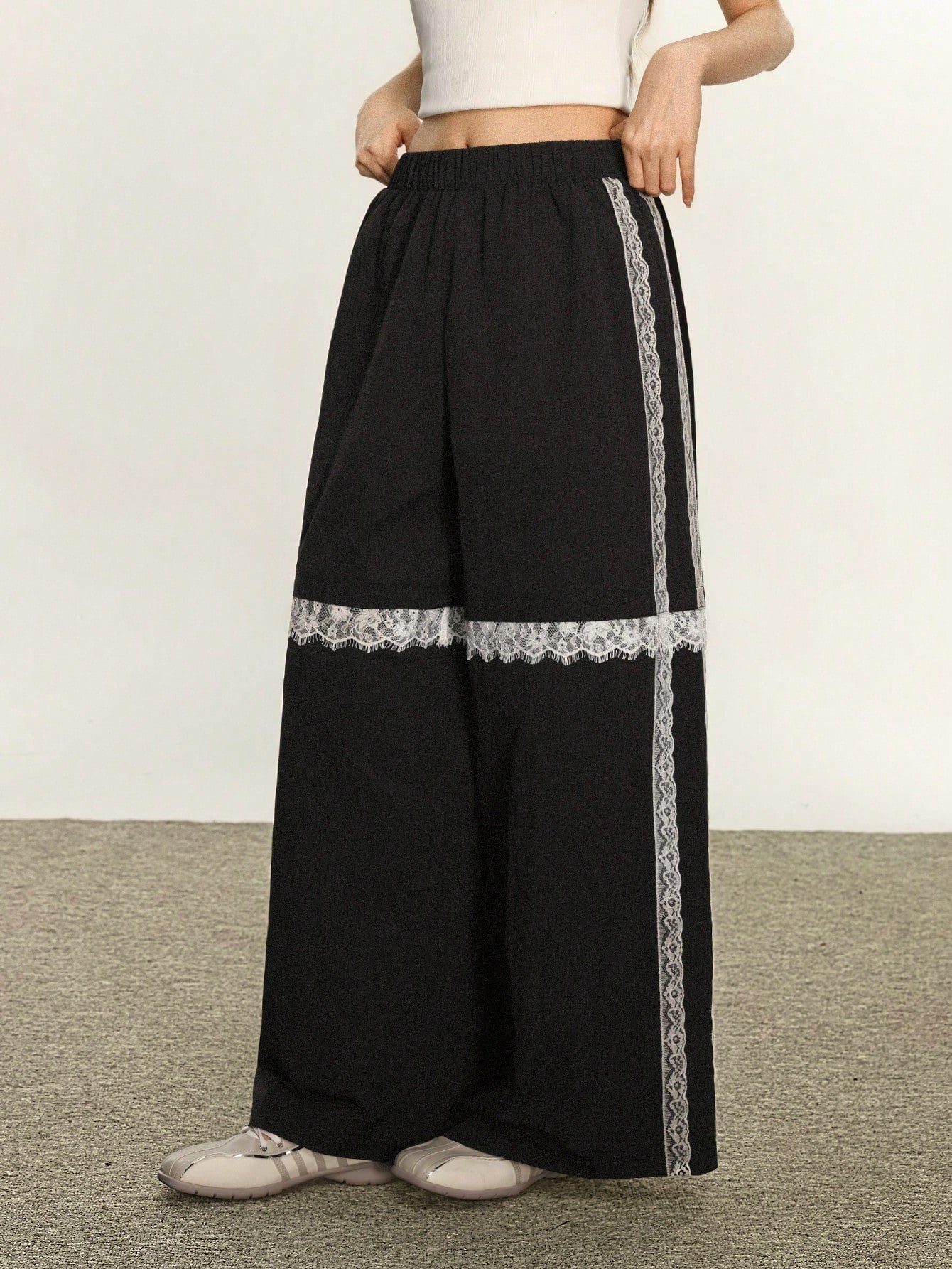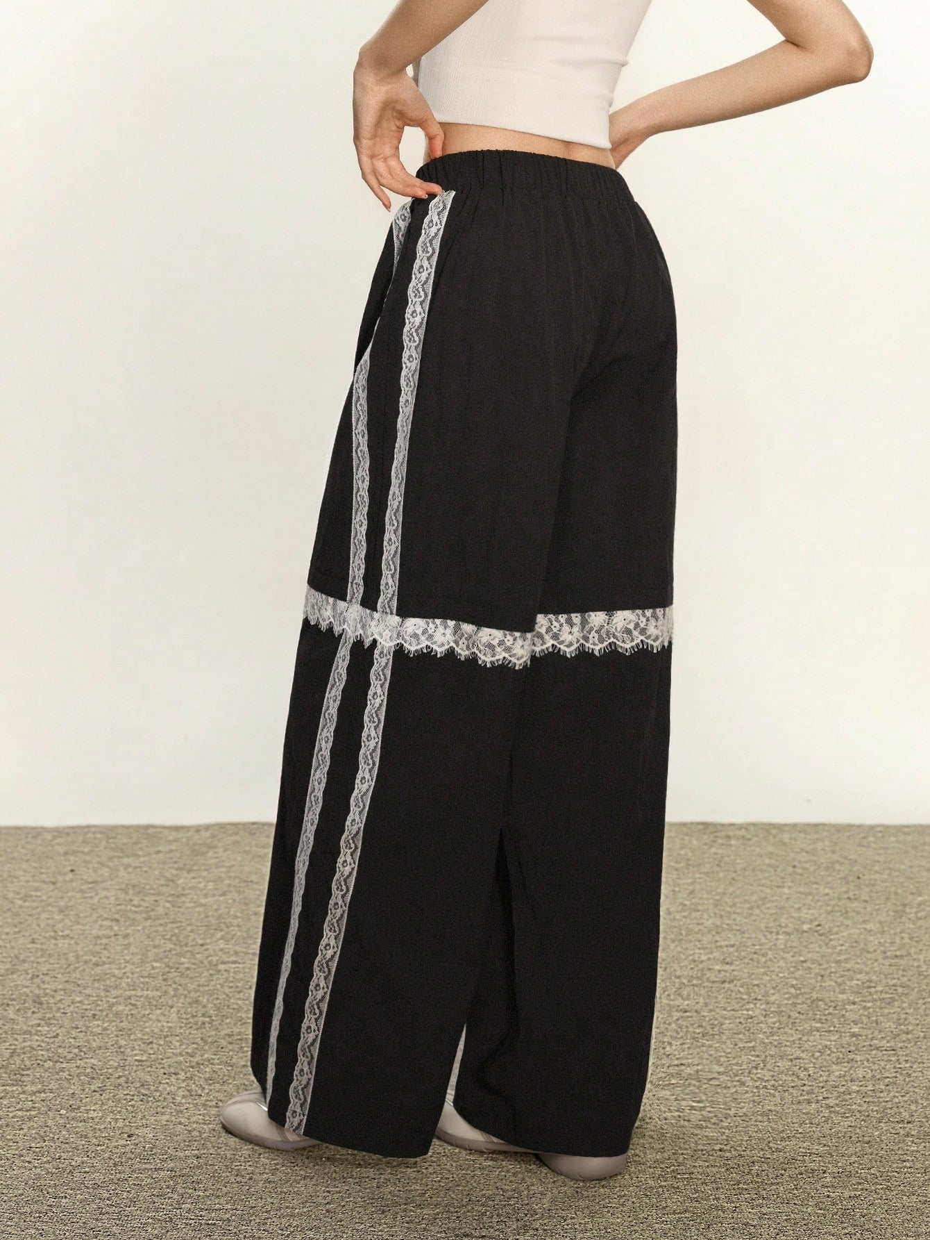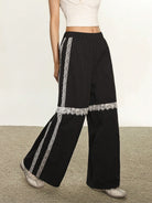 Rina Fox Women's Casual Contrasting Color Lace Trim Wide Leg Pants Fall Cloth For Women