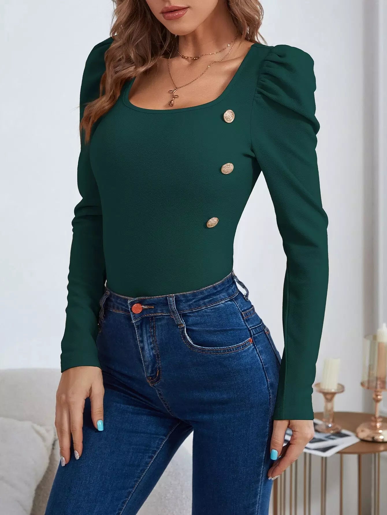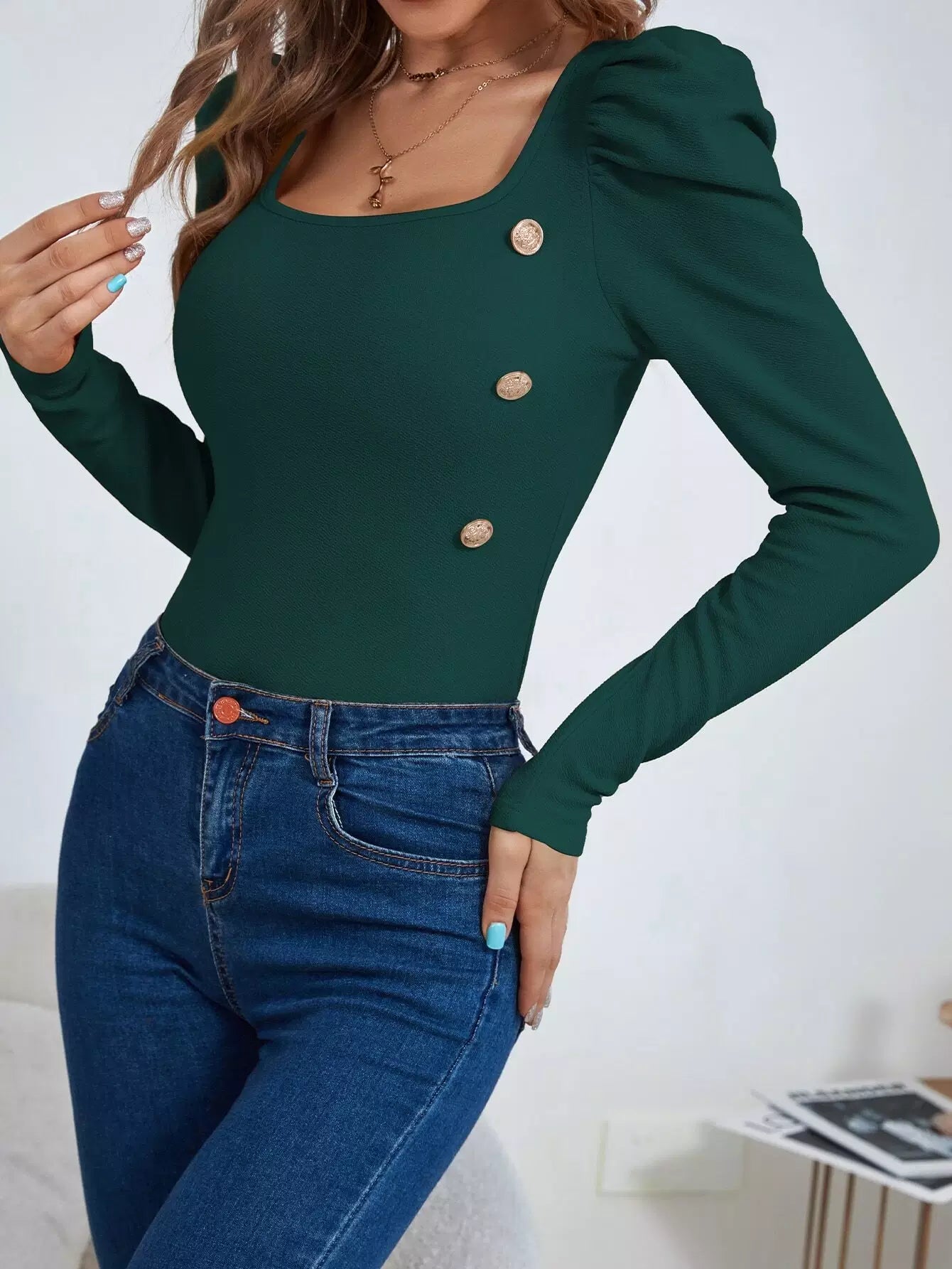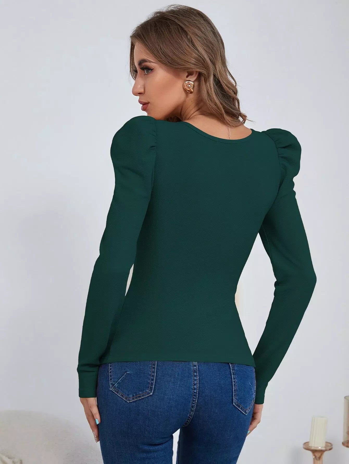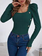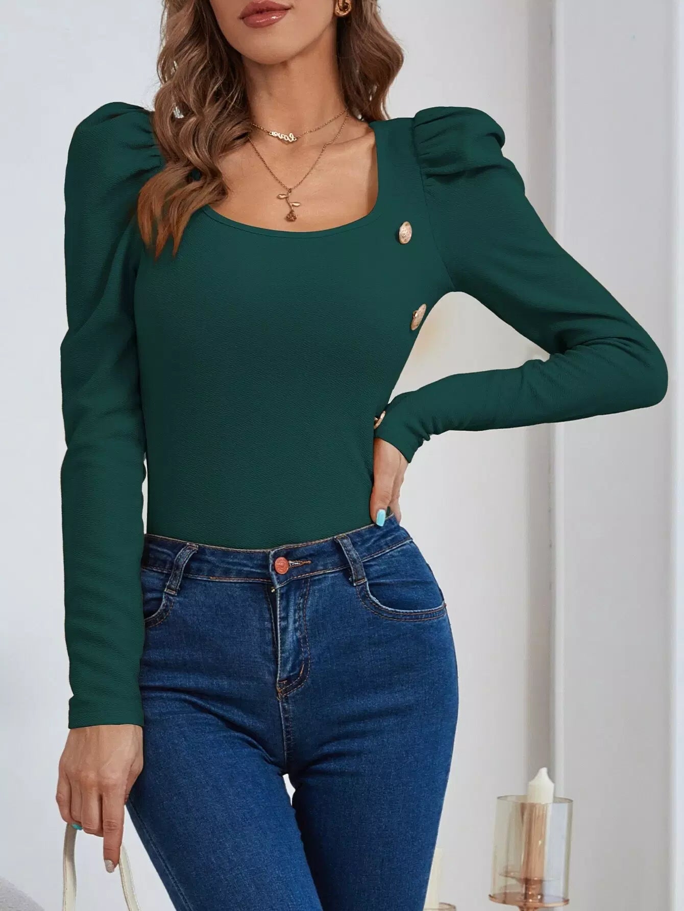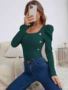 Women - Scoop Neck Gigot Sleeve Button Detail Top