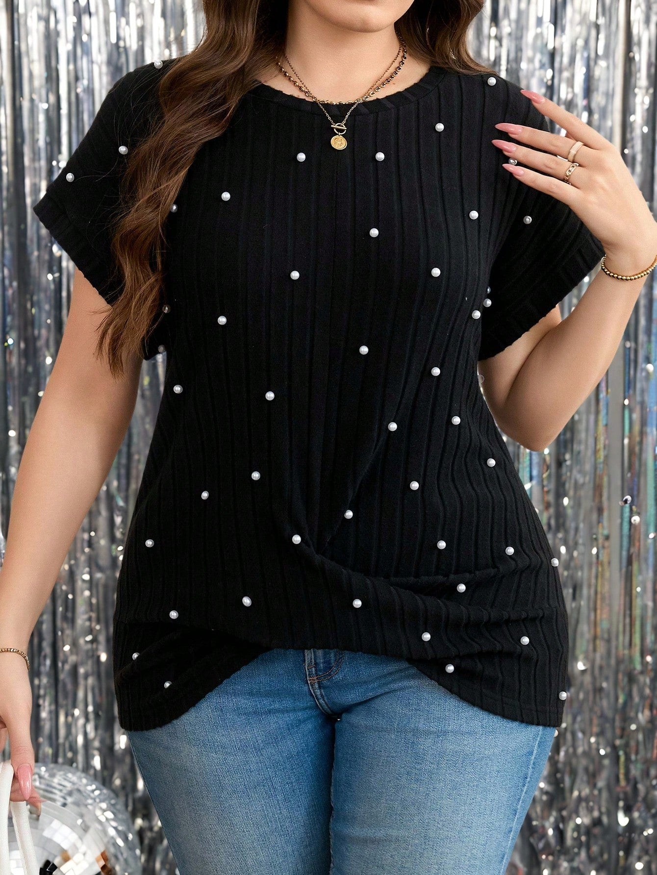 SHEIN Clasi Plus Size Women Faux Pearl Decor Short Sleeve Casual T-Shirt