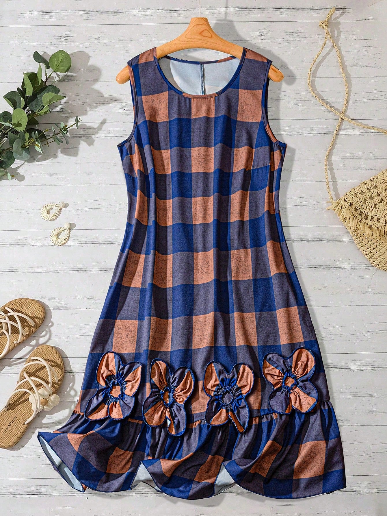 women SHEIN LUNE Plus Size Casual Check Print Floral Decor Dress