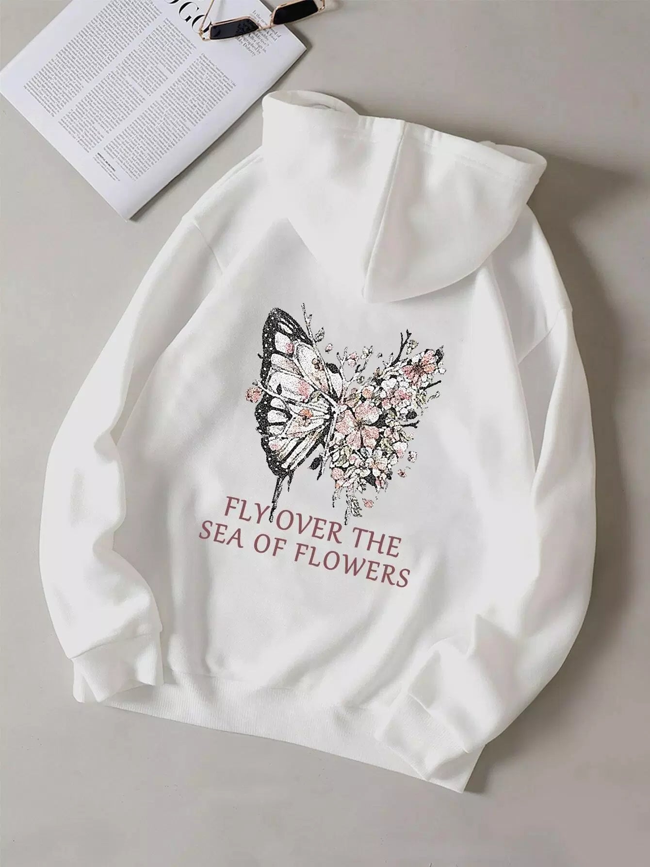 Slogan And Butterfly Print Drawstring Thermal Lined Hoodie