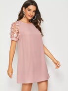 Solid Applique Patch Mesh Sleeve Tunic Dress