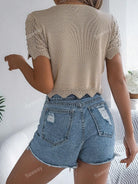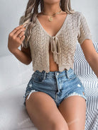 Spring/Summer Solid Color Hollow Out Short Sleeve Knit Cardigan With Tie, Vacation Crop Top