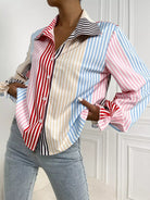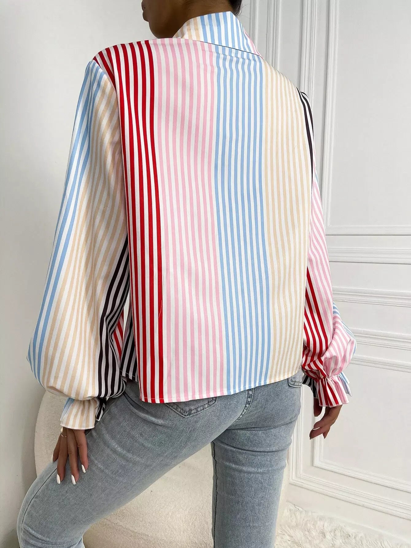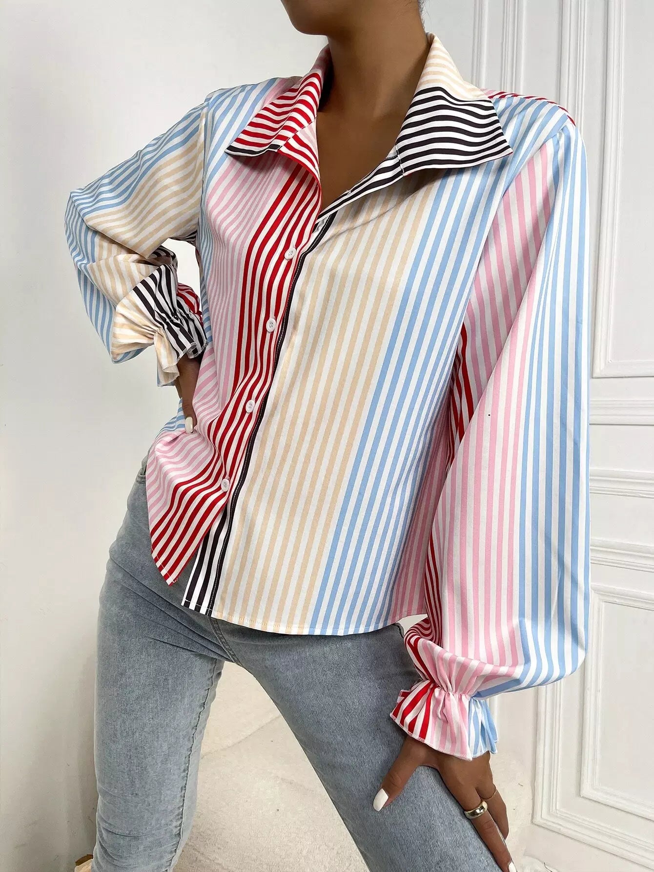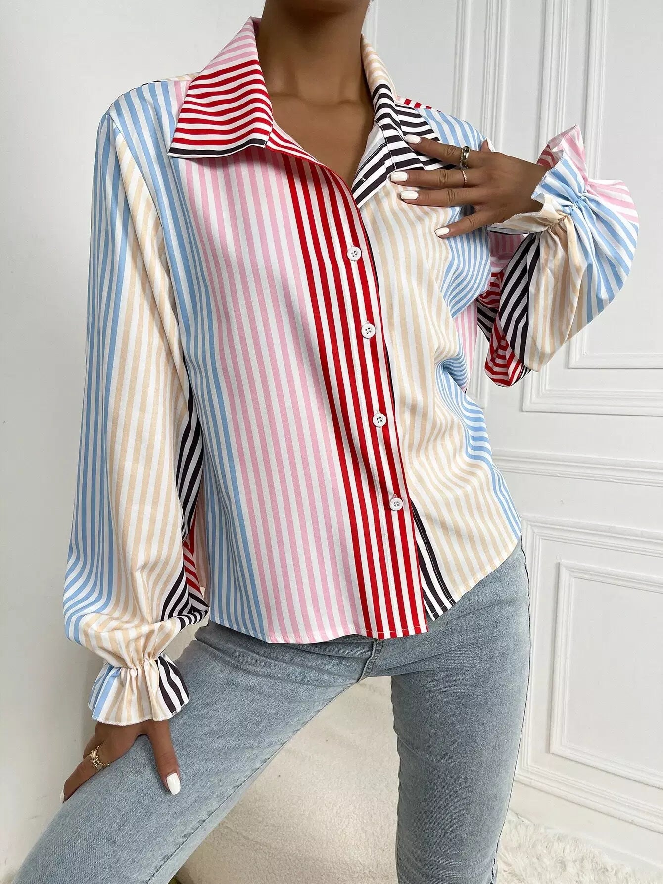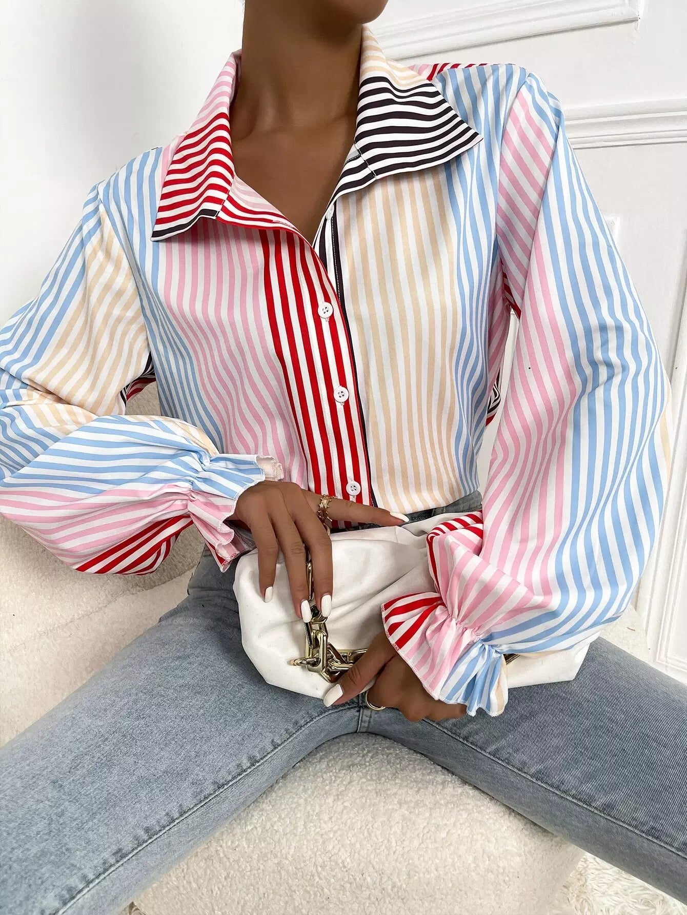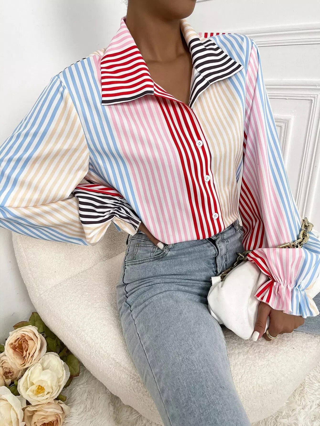 Women - Striped Print Colorblock Flounce Sleeve Shirt