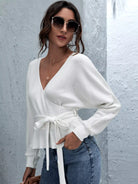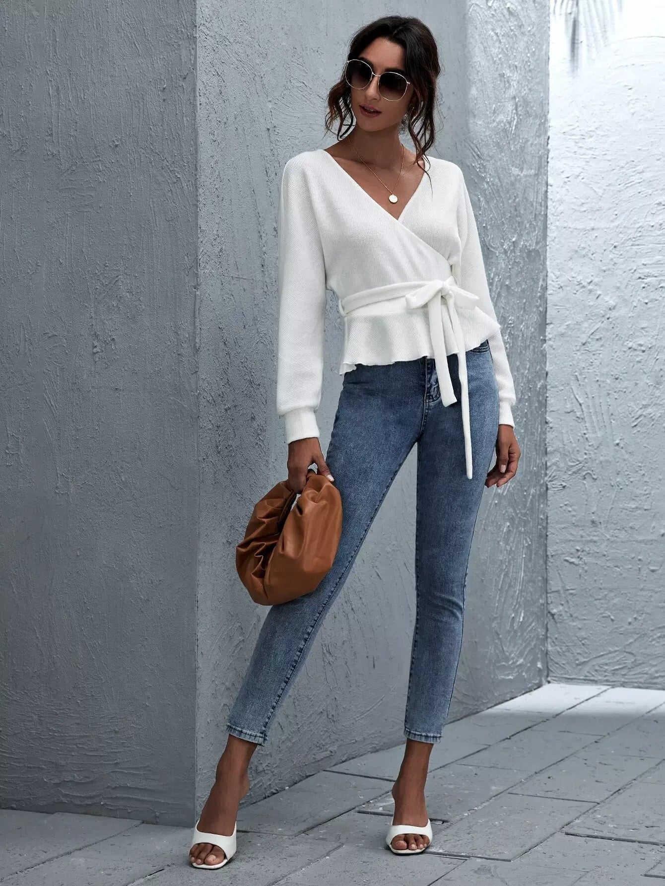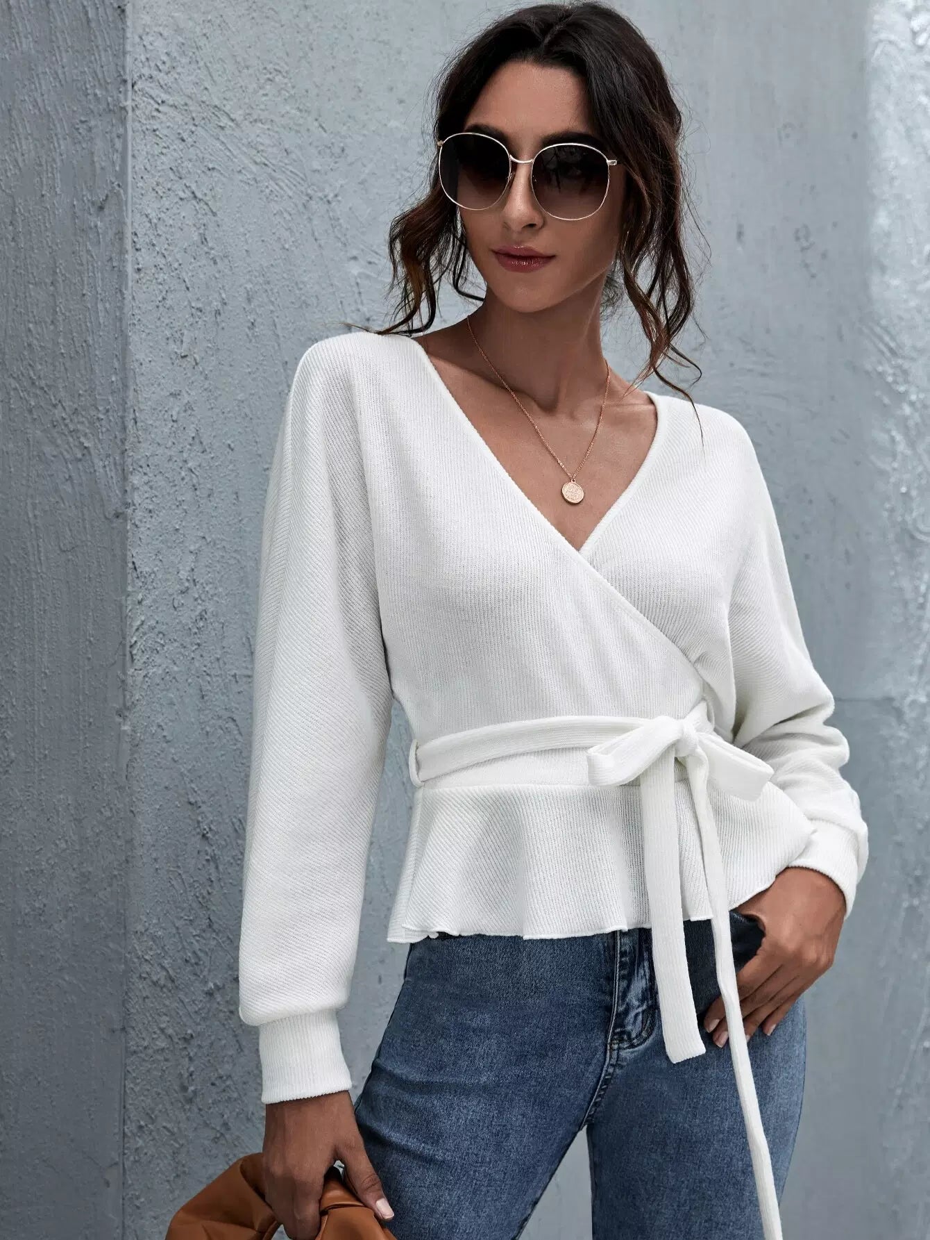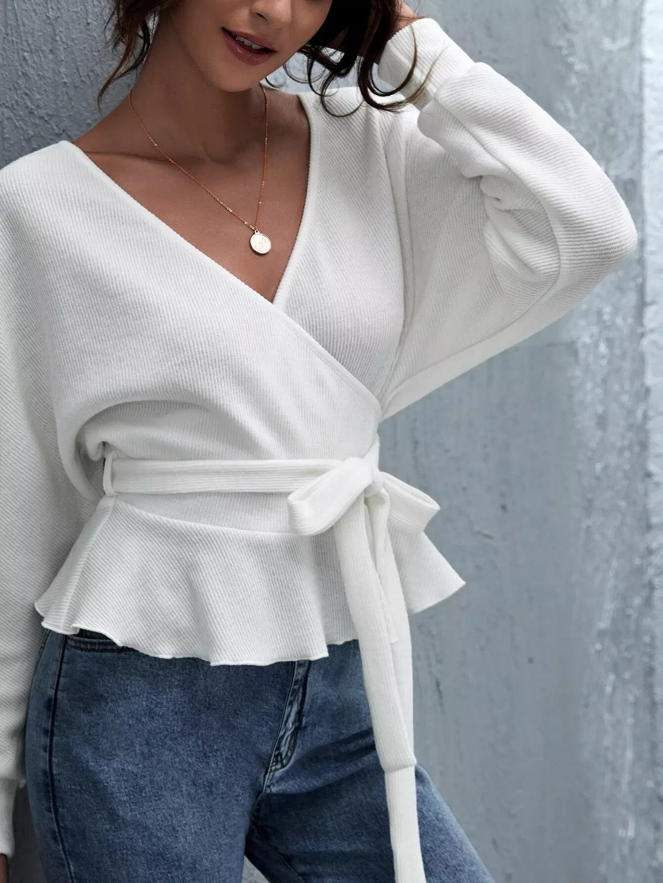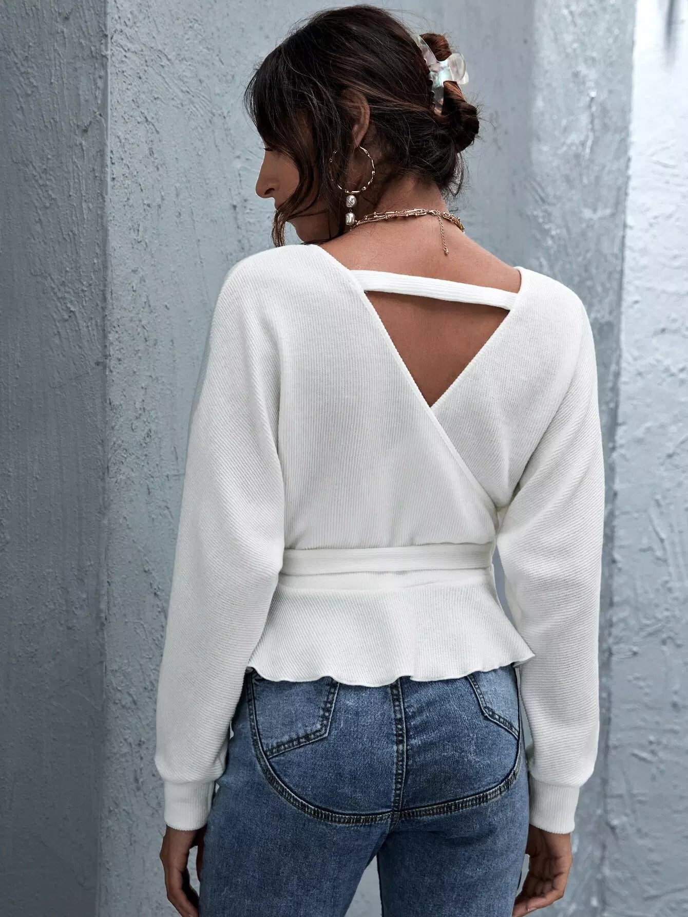 Surplice Neck Cut-out Back Peplum Sweater Without Belt