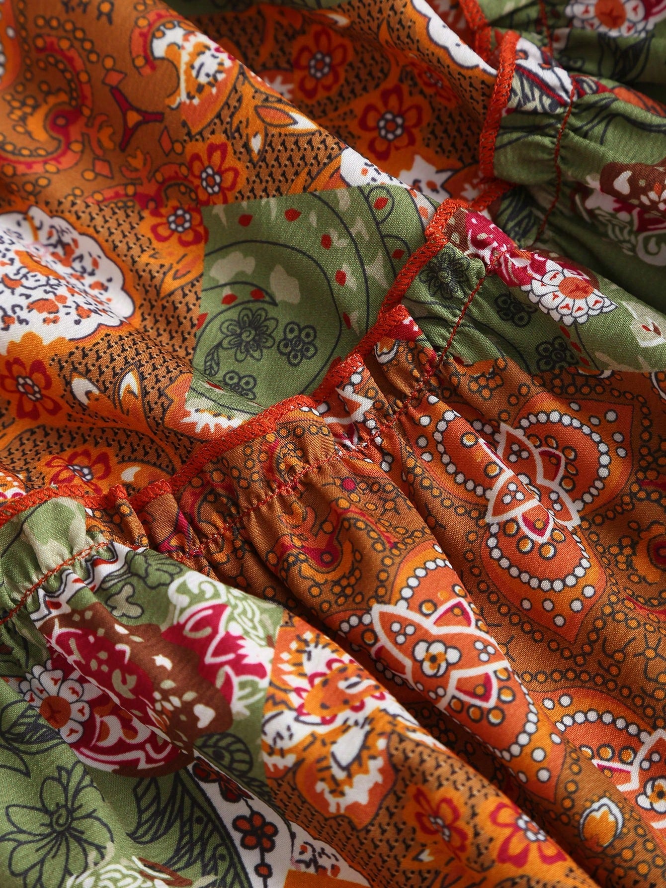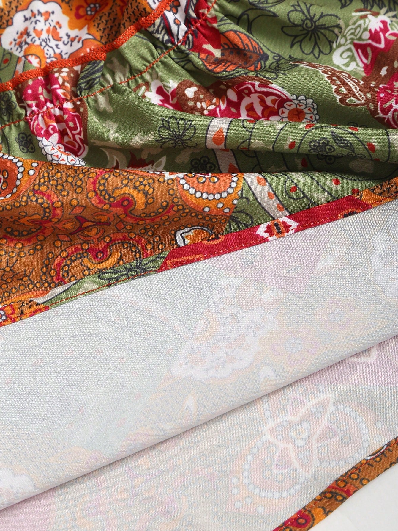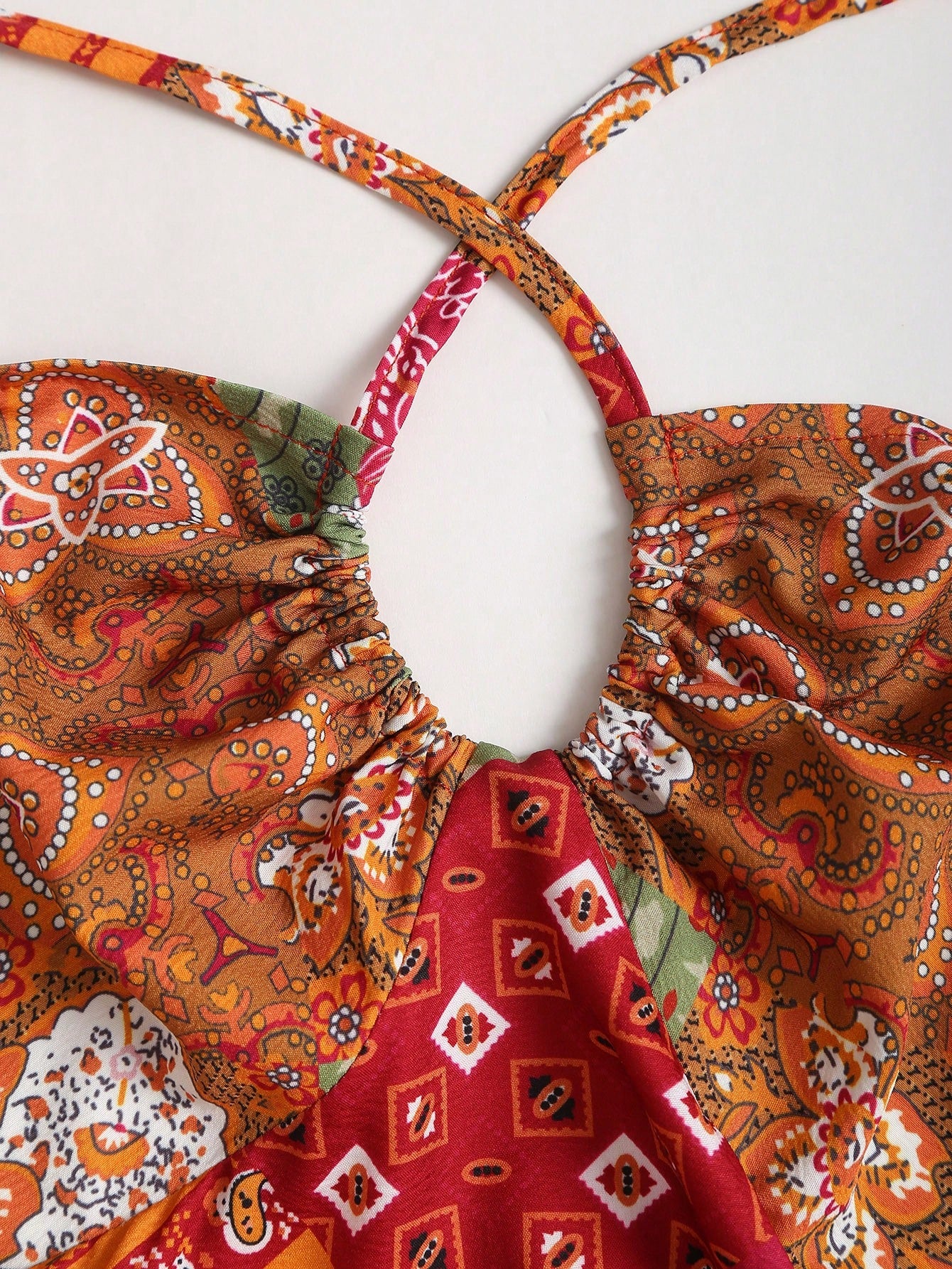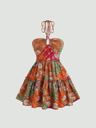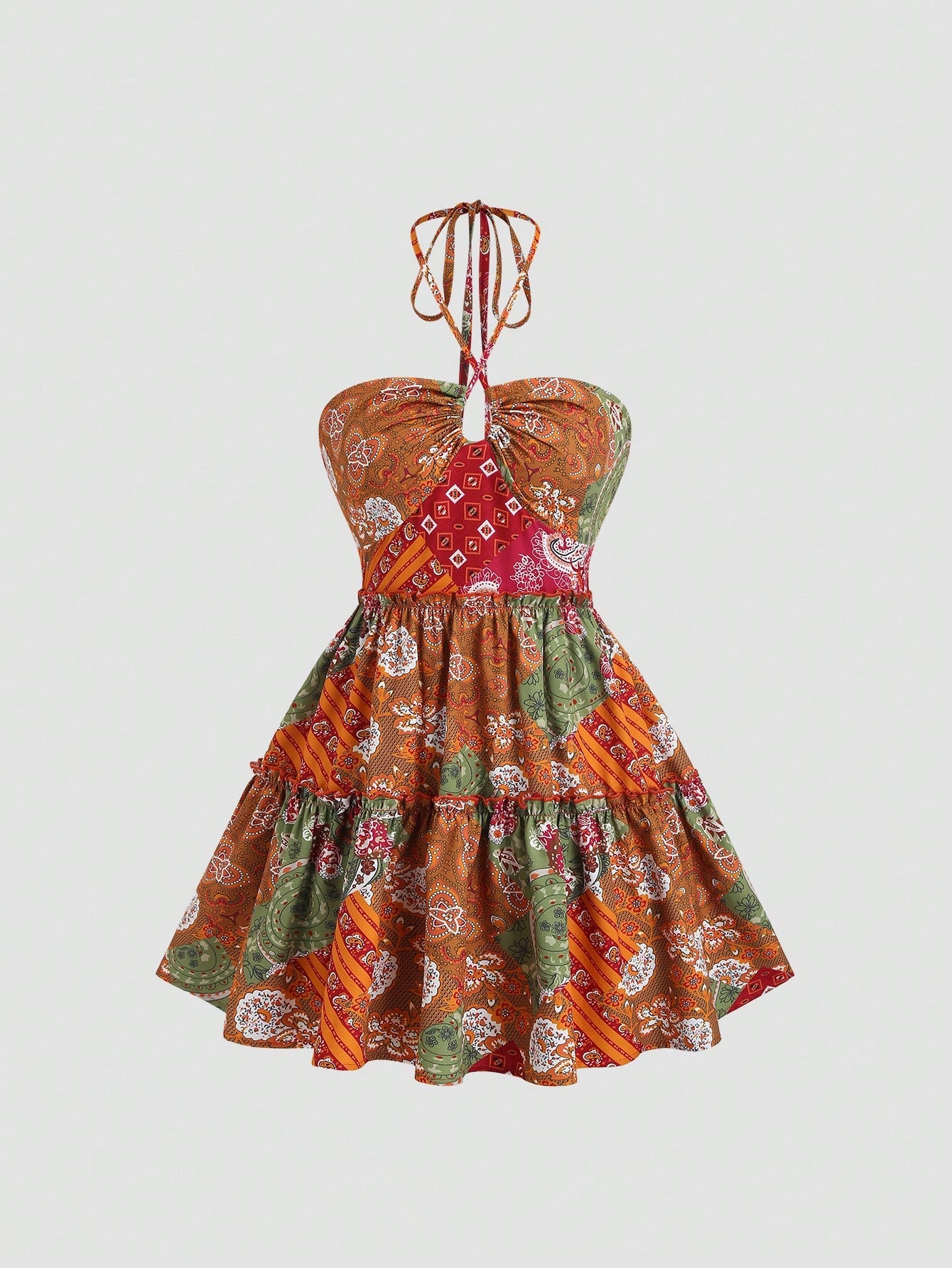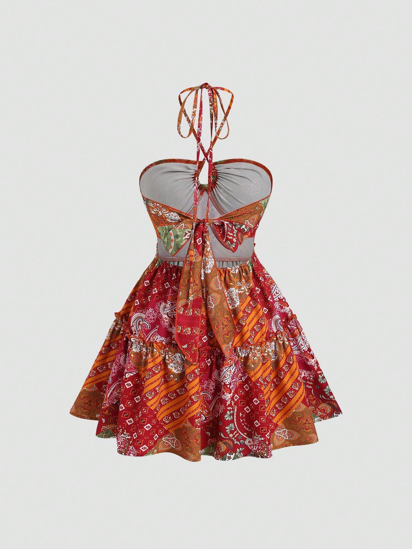 Sweetra Women's New Halter Ruffled Tie Vacation Vintage Mini Dress With Allover Printed, Gathered Design,