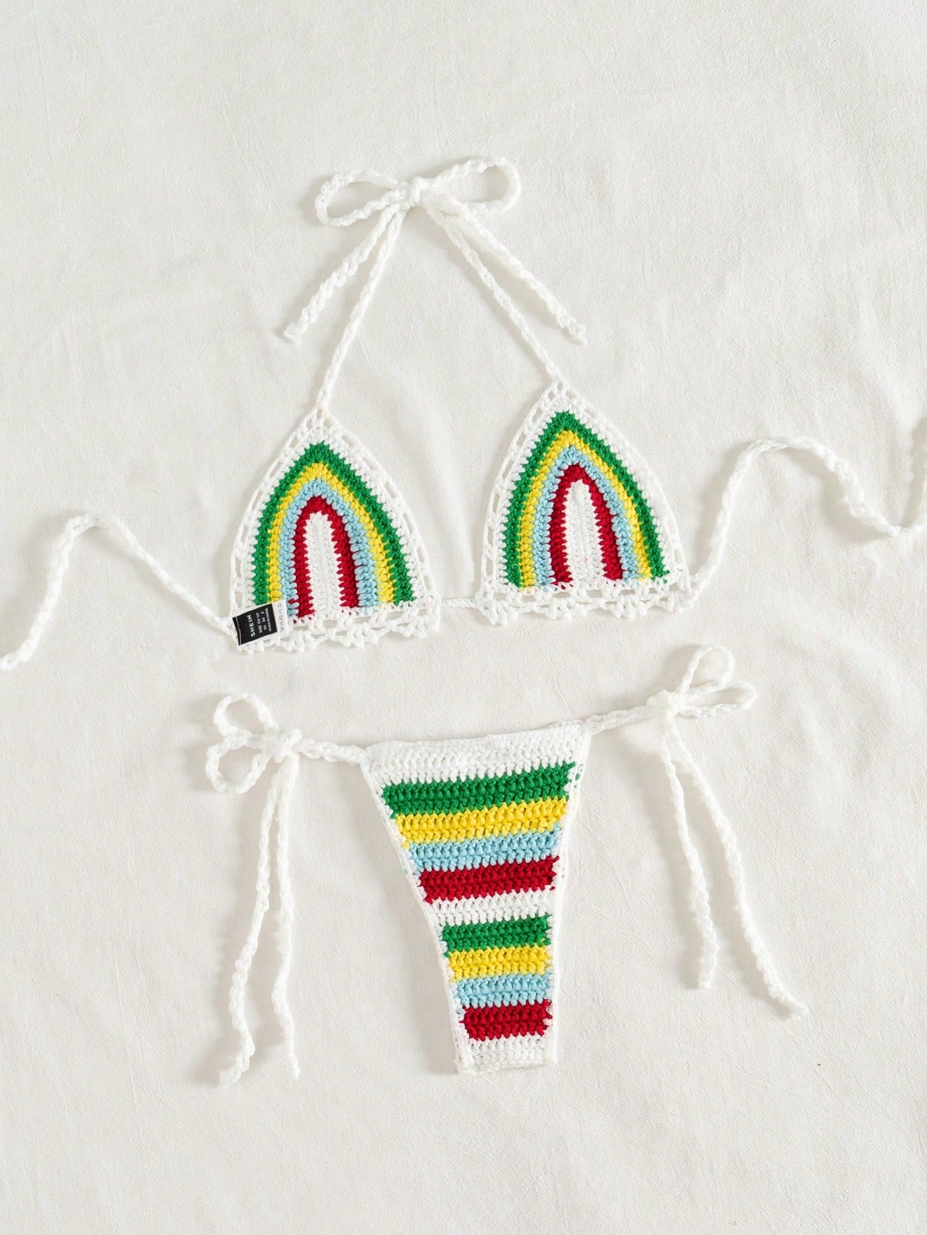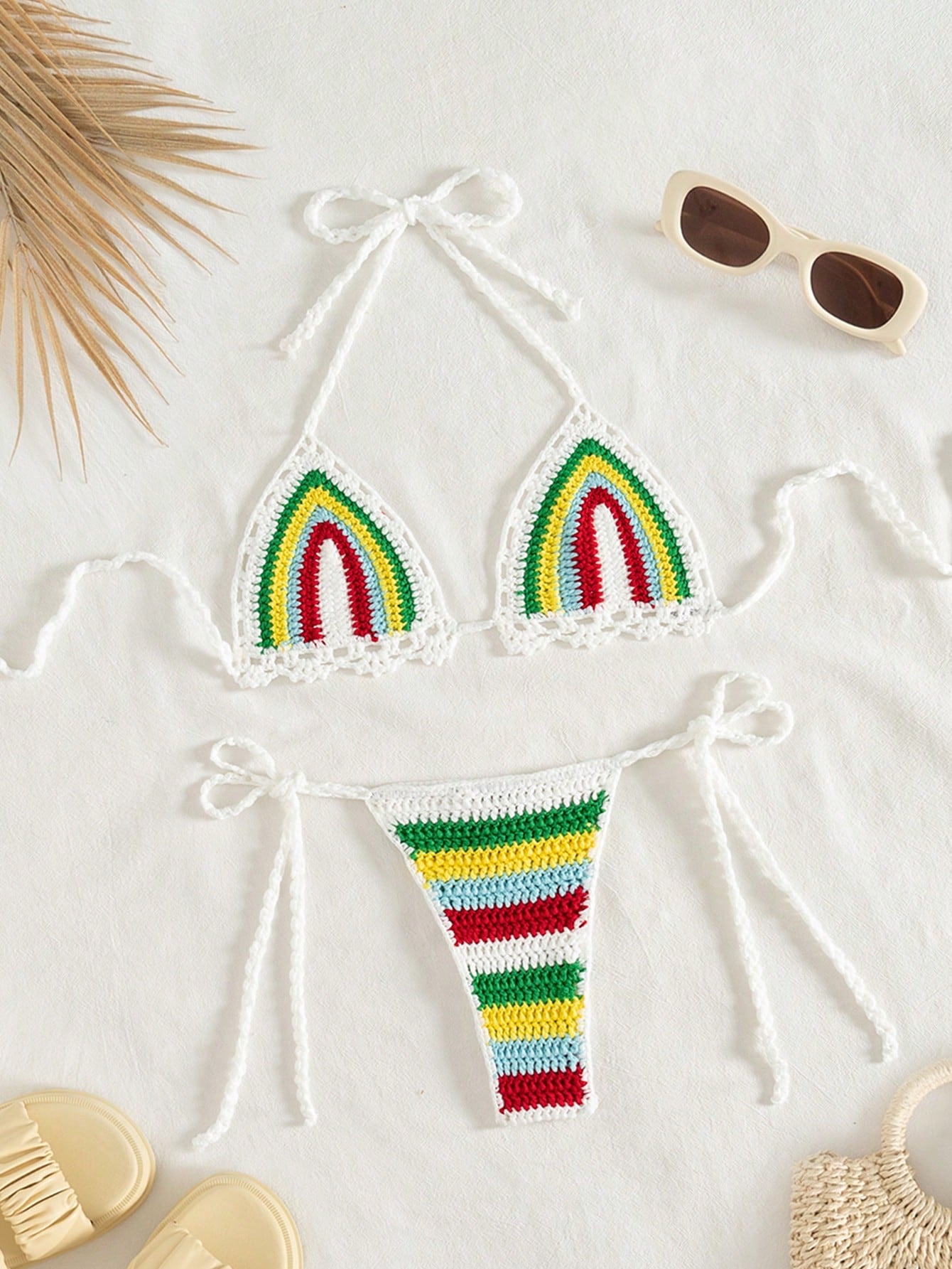Swim Vcay Summer Outfits For Women Summer Women's Boho Dopamine Color Block Crochet Bikini Cover Up Sets