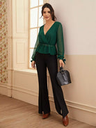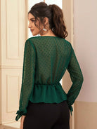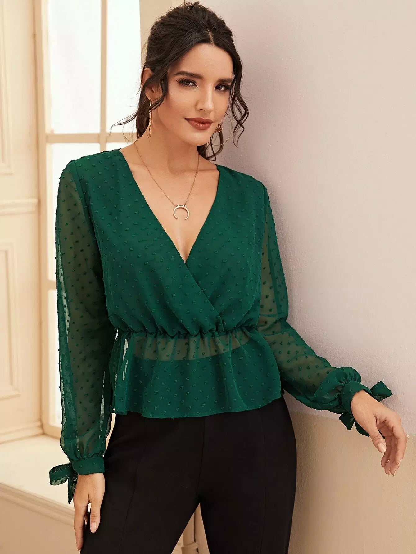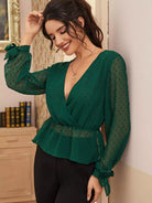 Swiss Dot Surplice Front Knotted Cuff Peplum Blouse