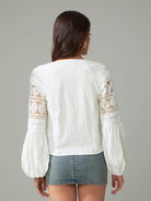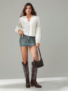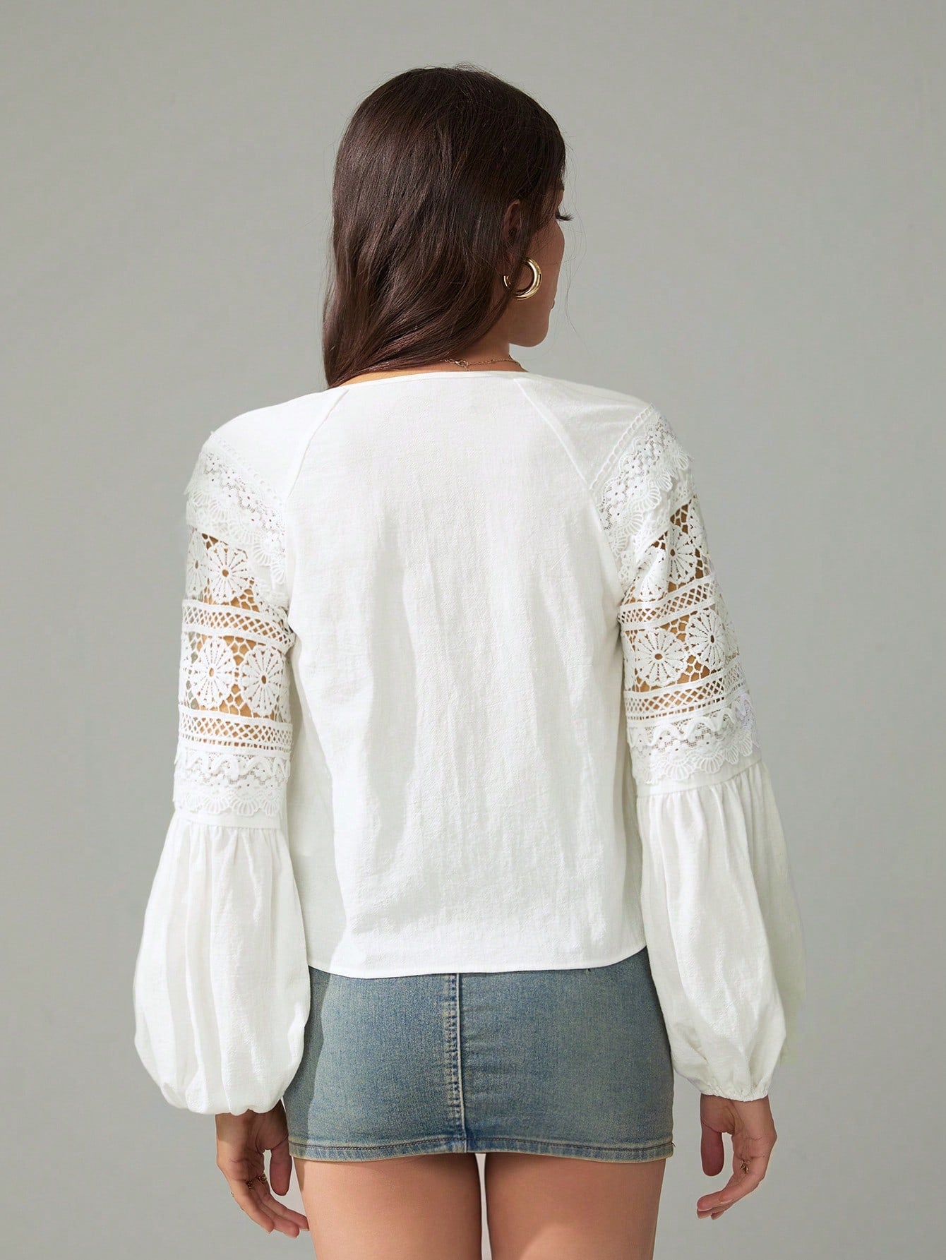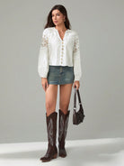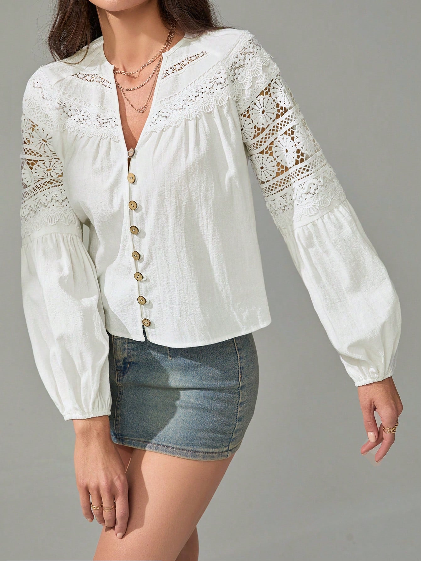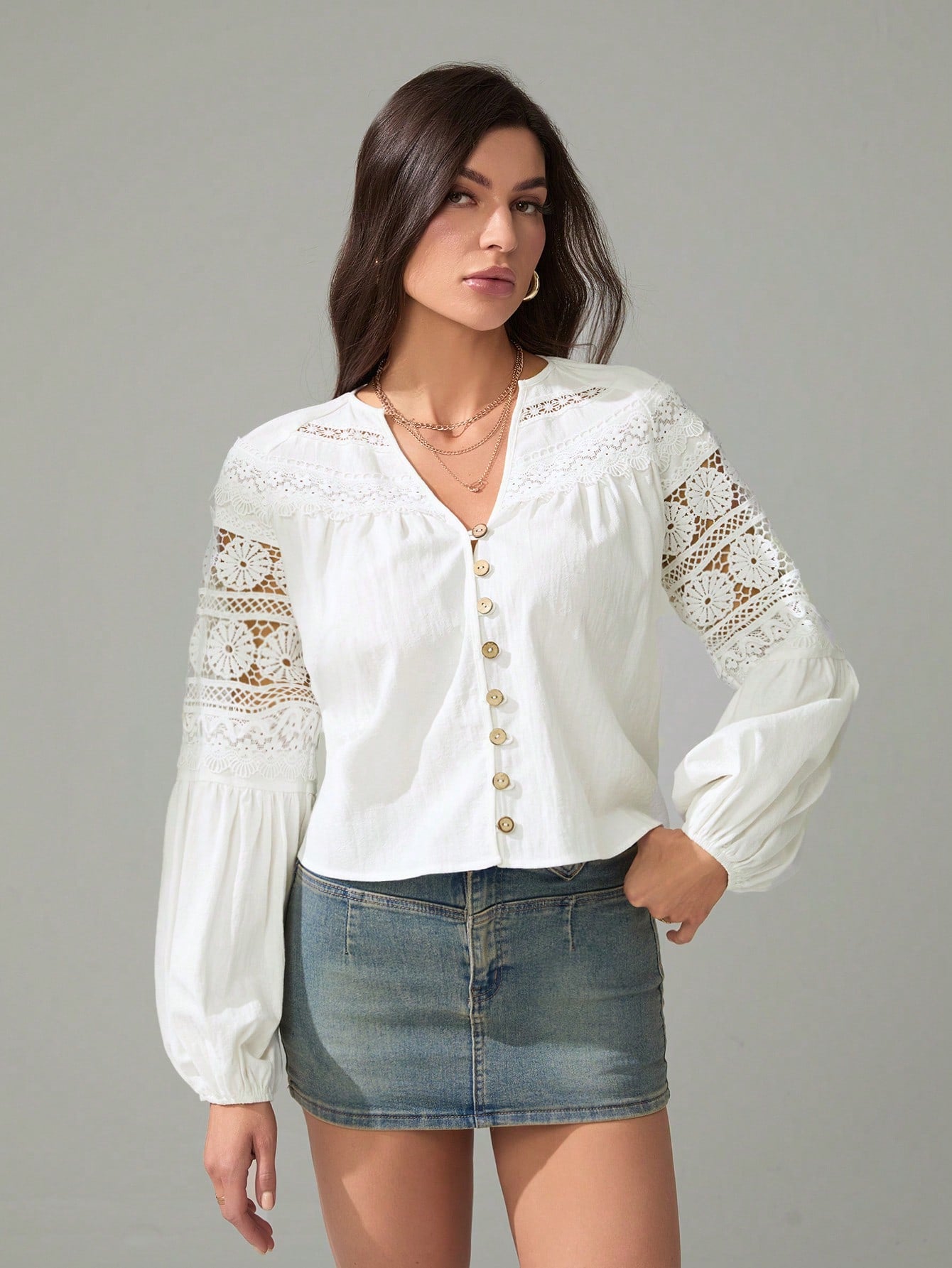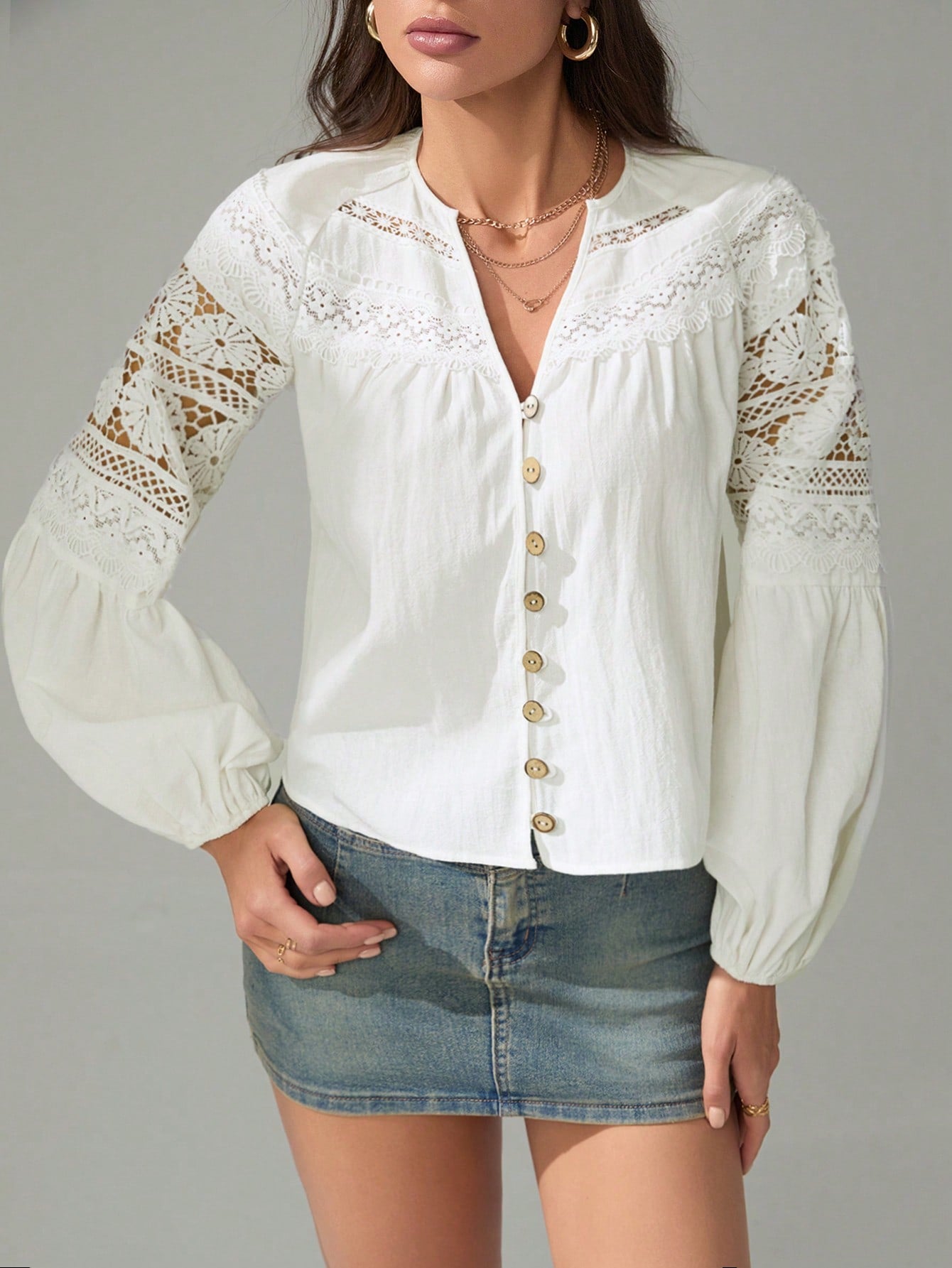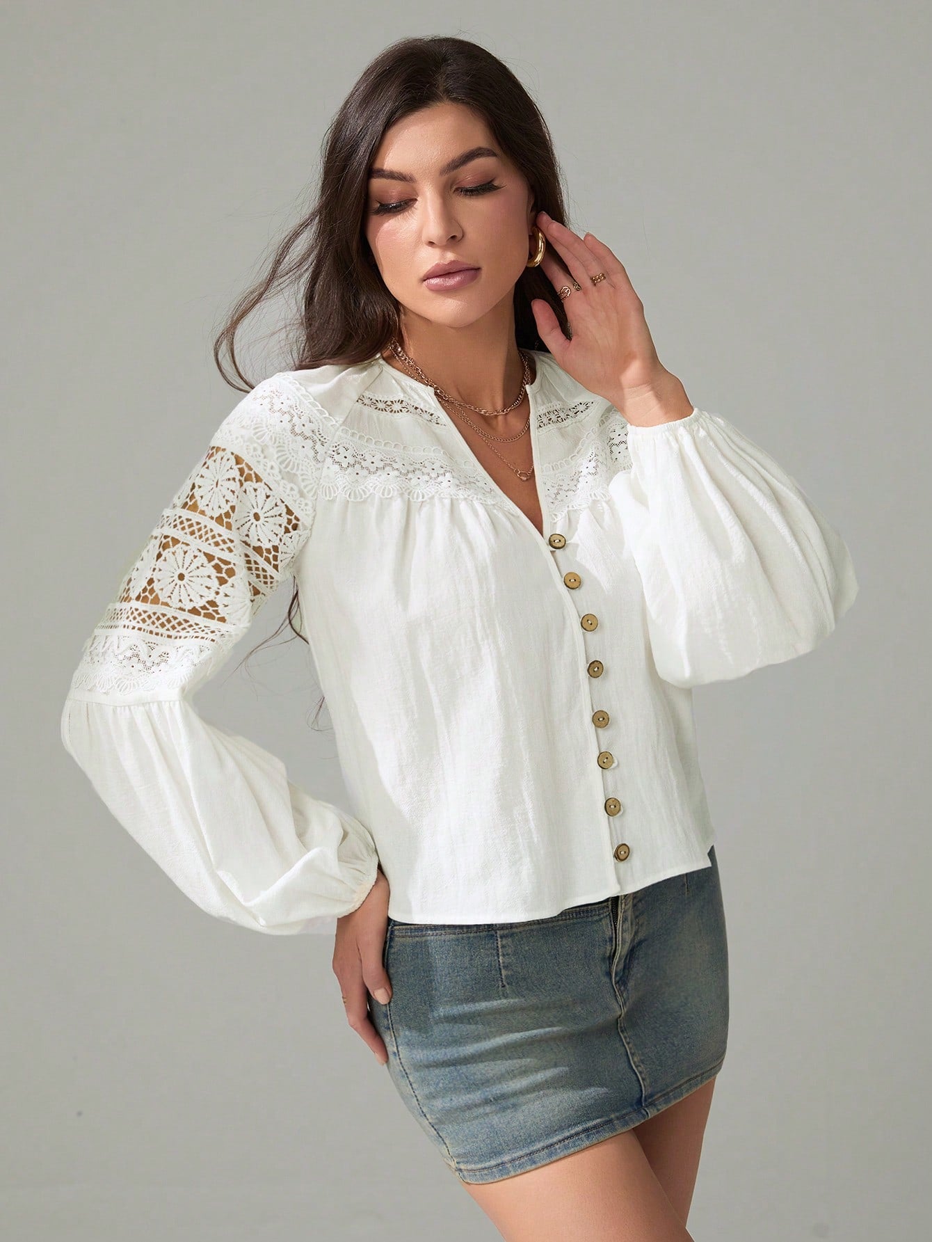 Tall Women's Solid Color Contrast Lace Lantern Sleeve Single-Breasted Shirt