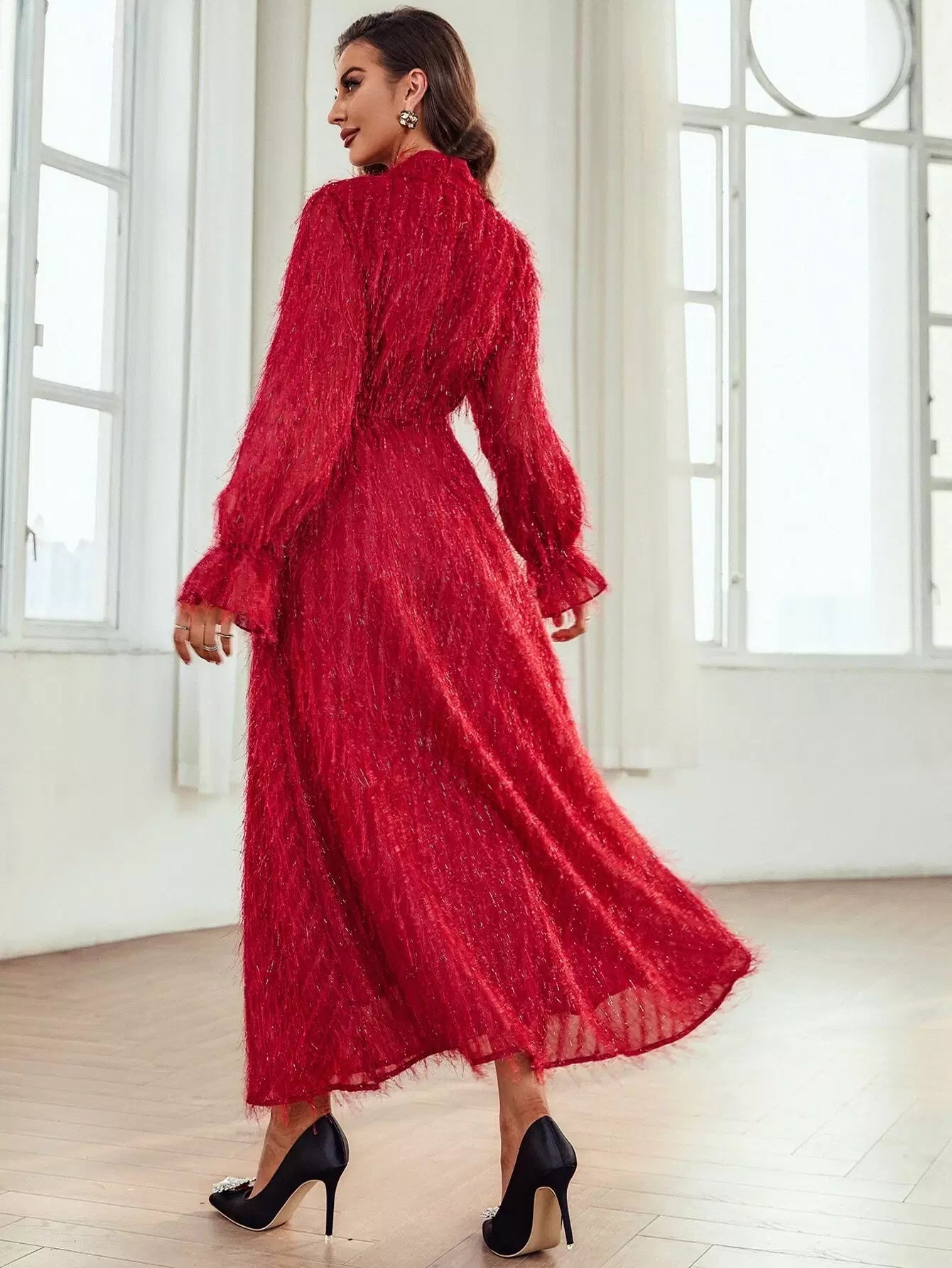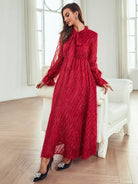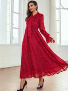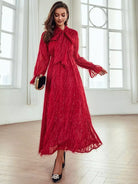 Tie Neck Flounce Sleeve Fringe Detail Dress