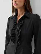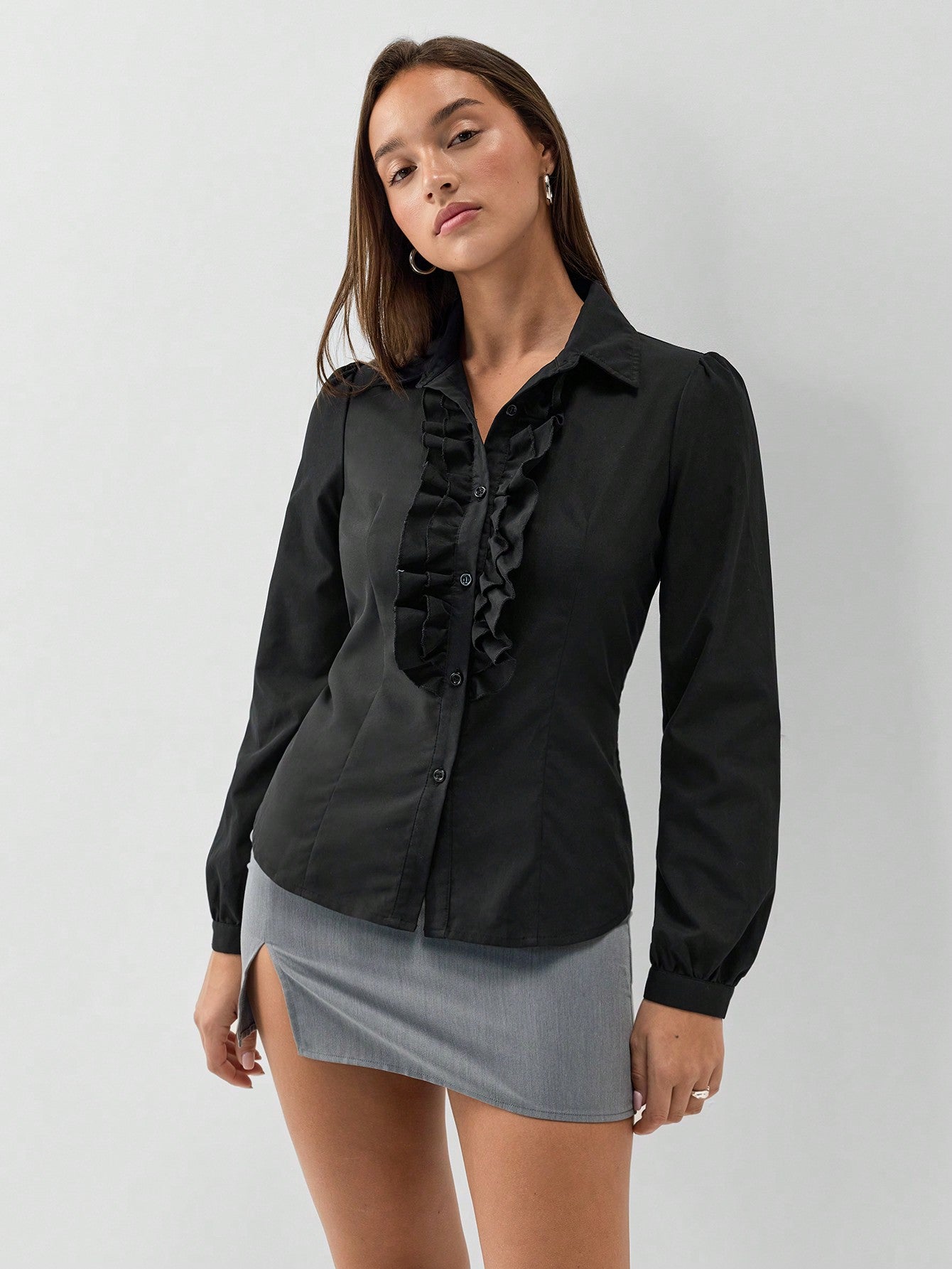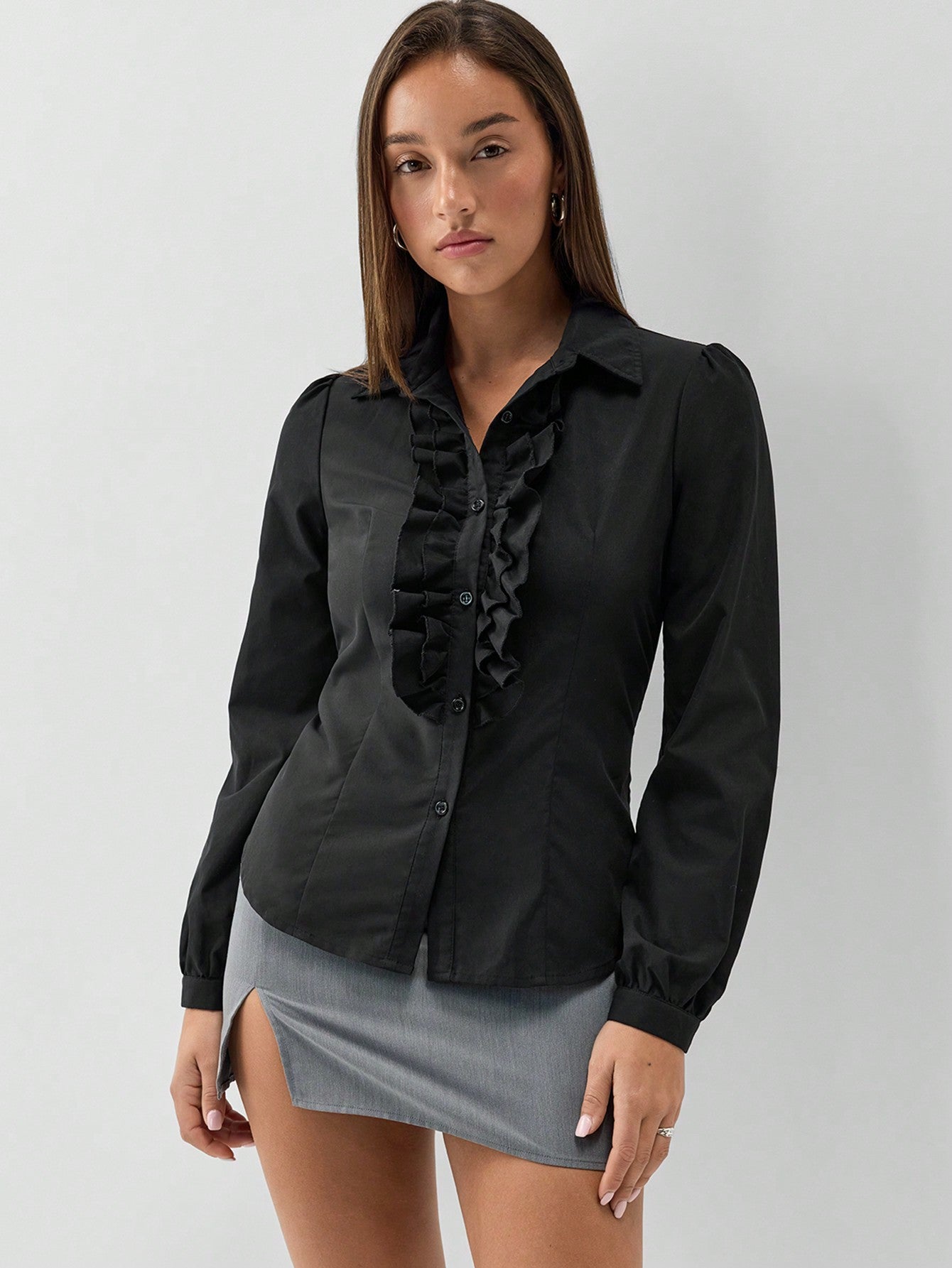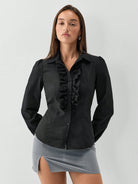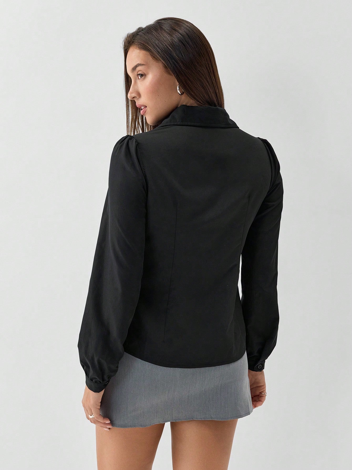 TRNVIE 1pc Black Ruched Collar Pleated Front Office/Commute Chic Mermaid Style Blouse For Women, Autumn/Winter