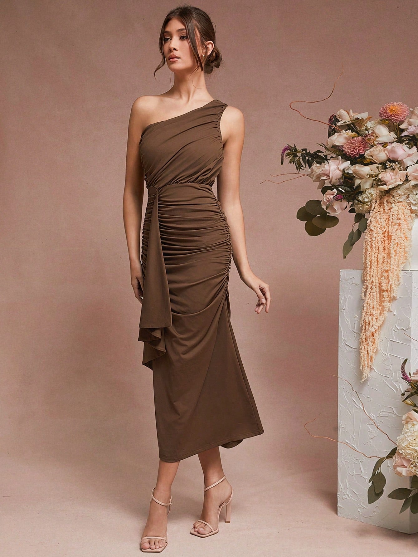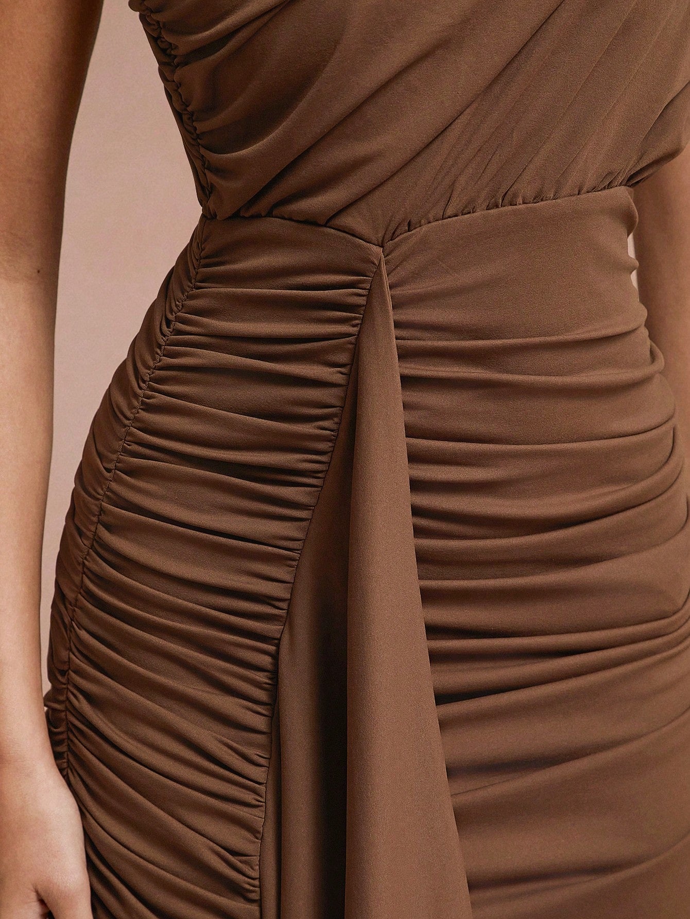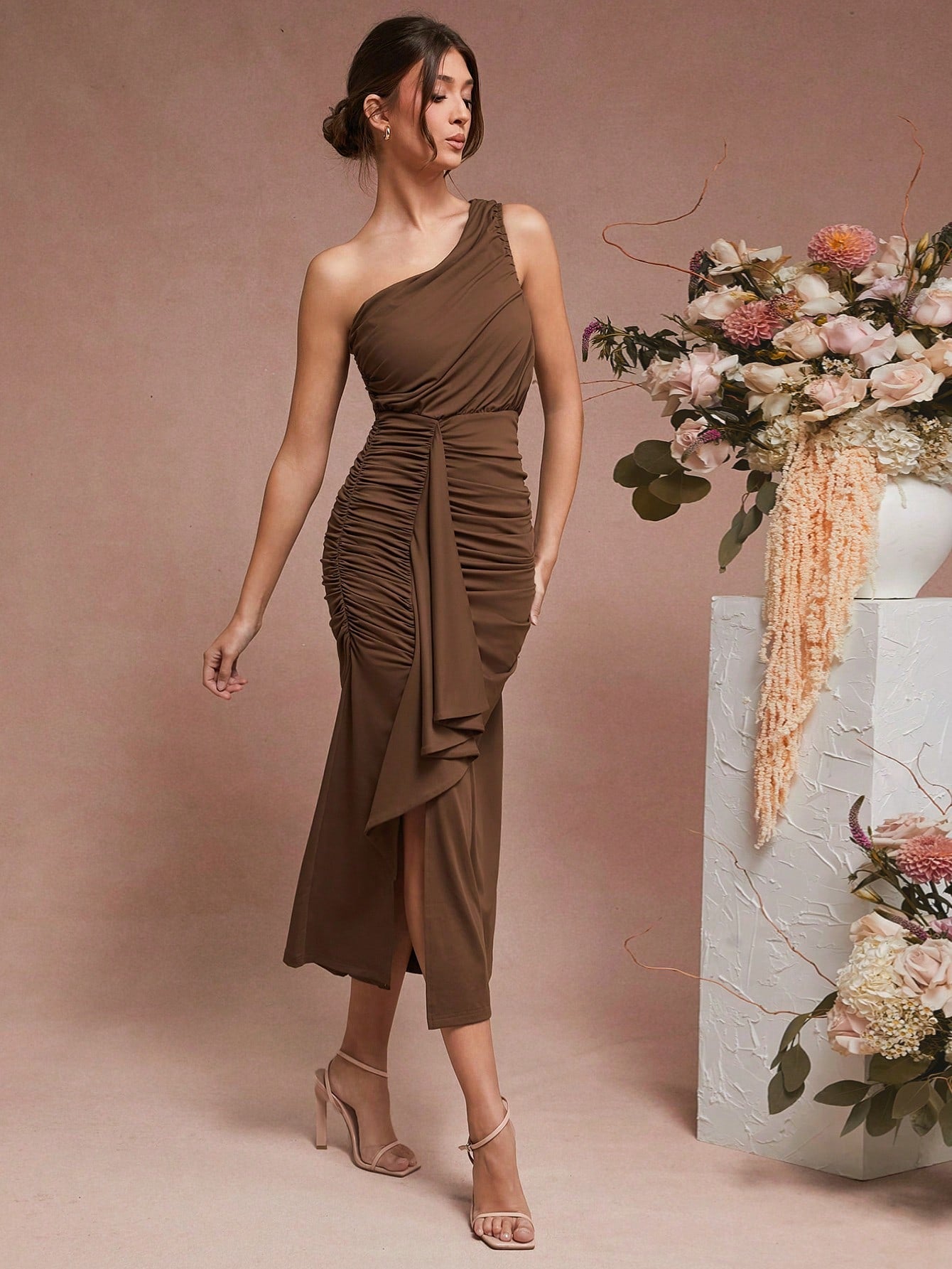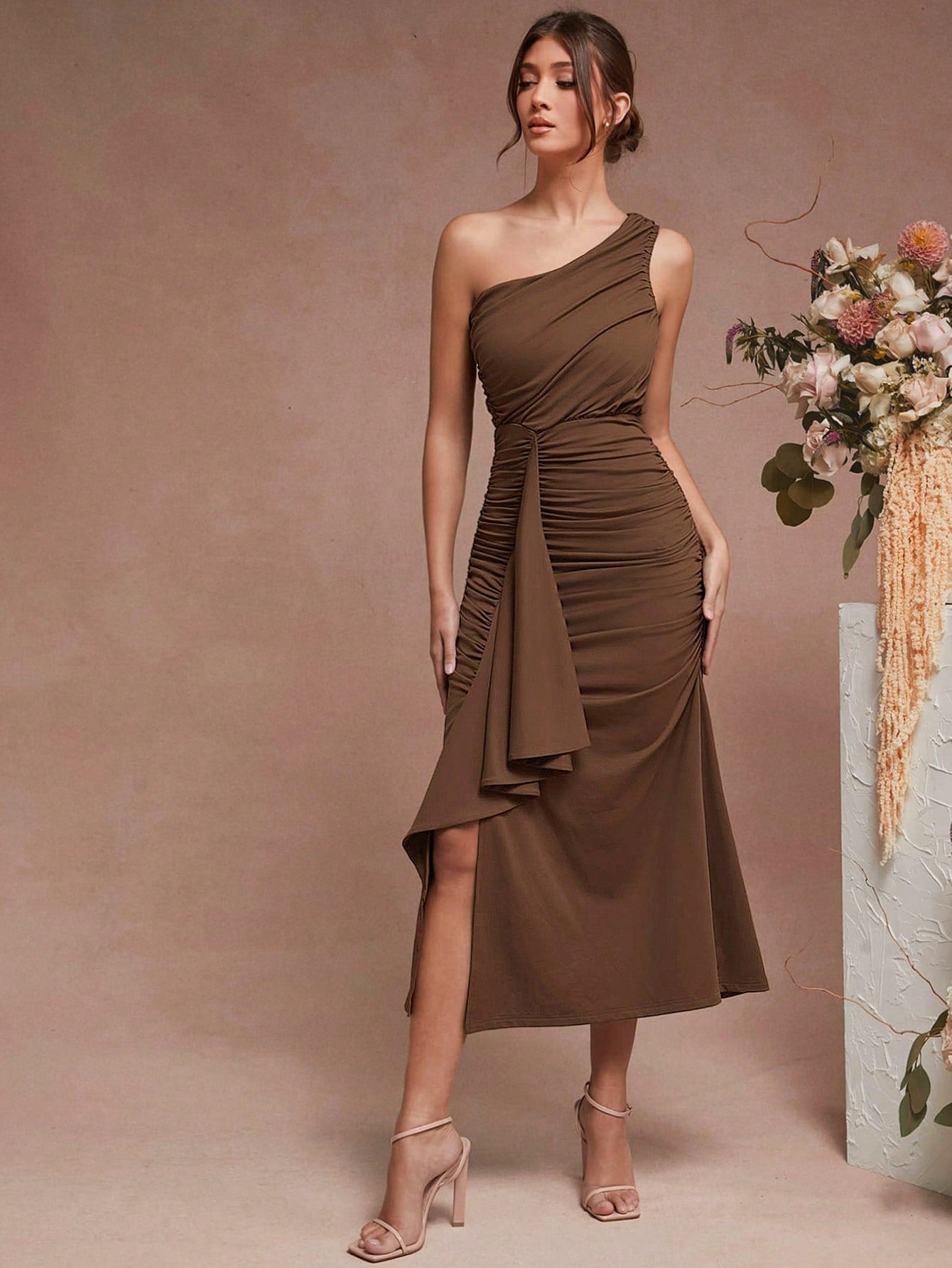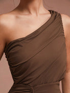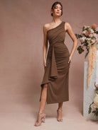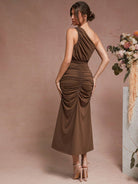Unity Women Solid Color Asymmetrical Neck Ruched Split Thigh Dress
